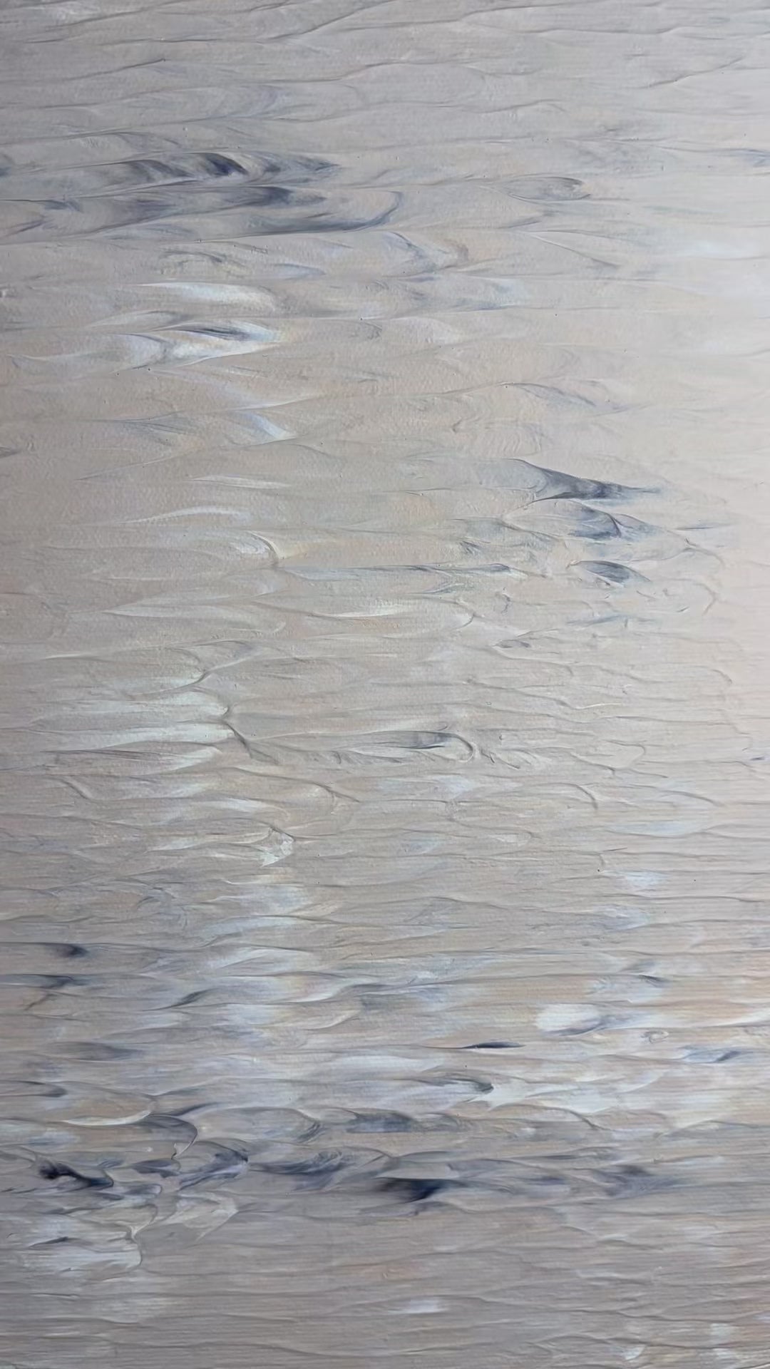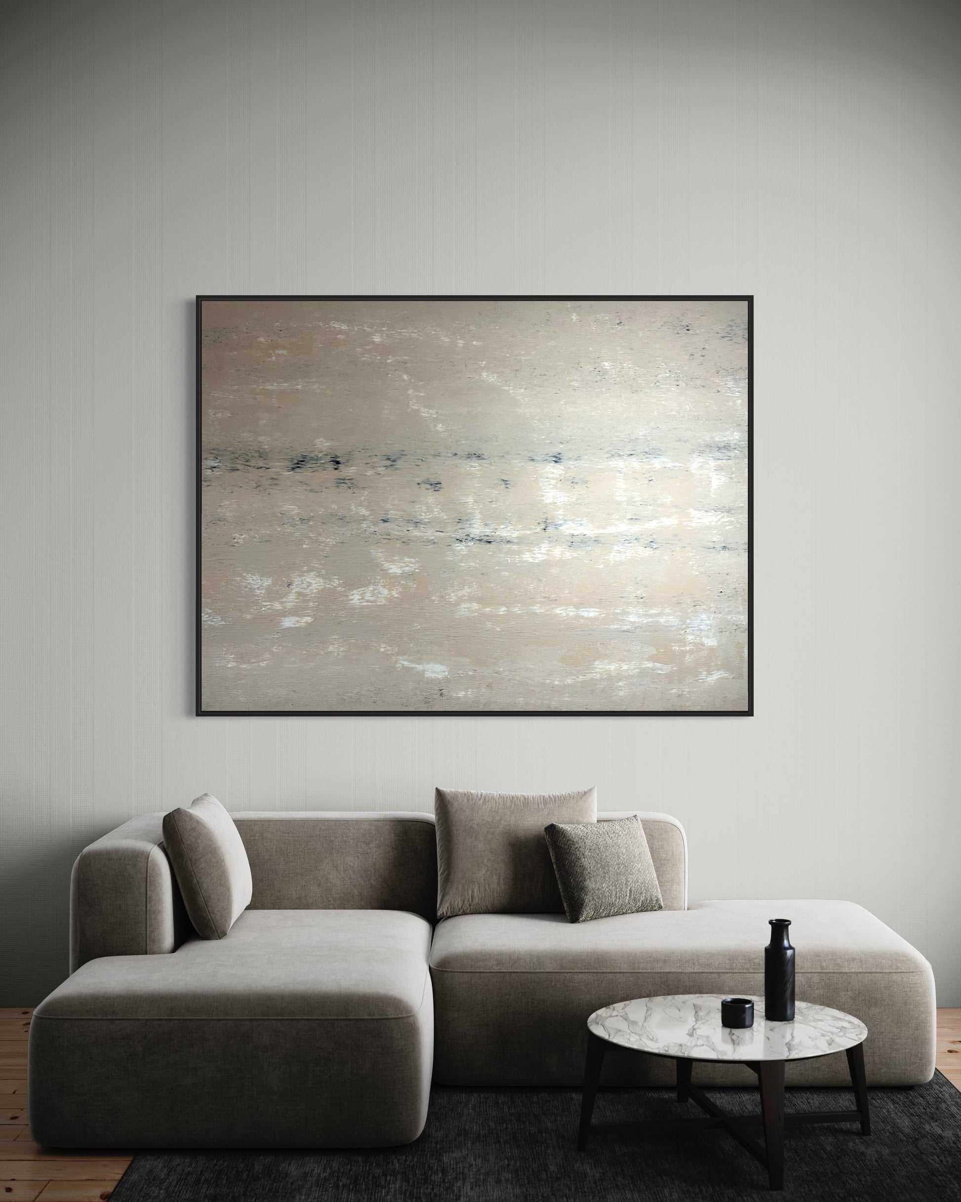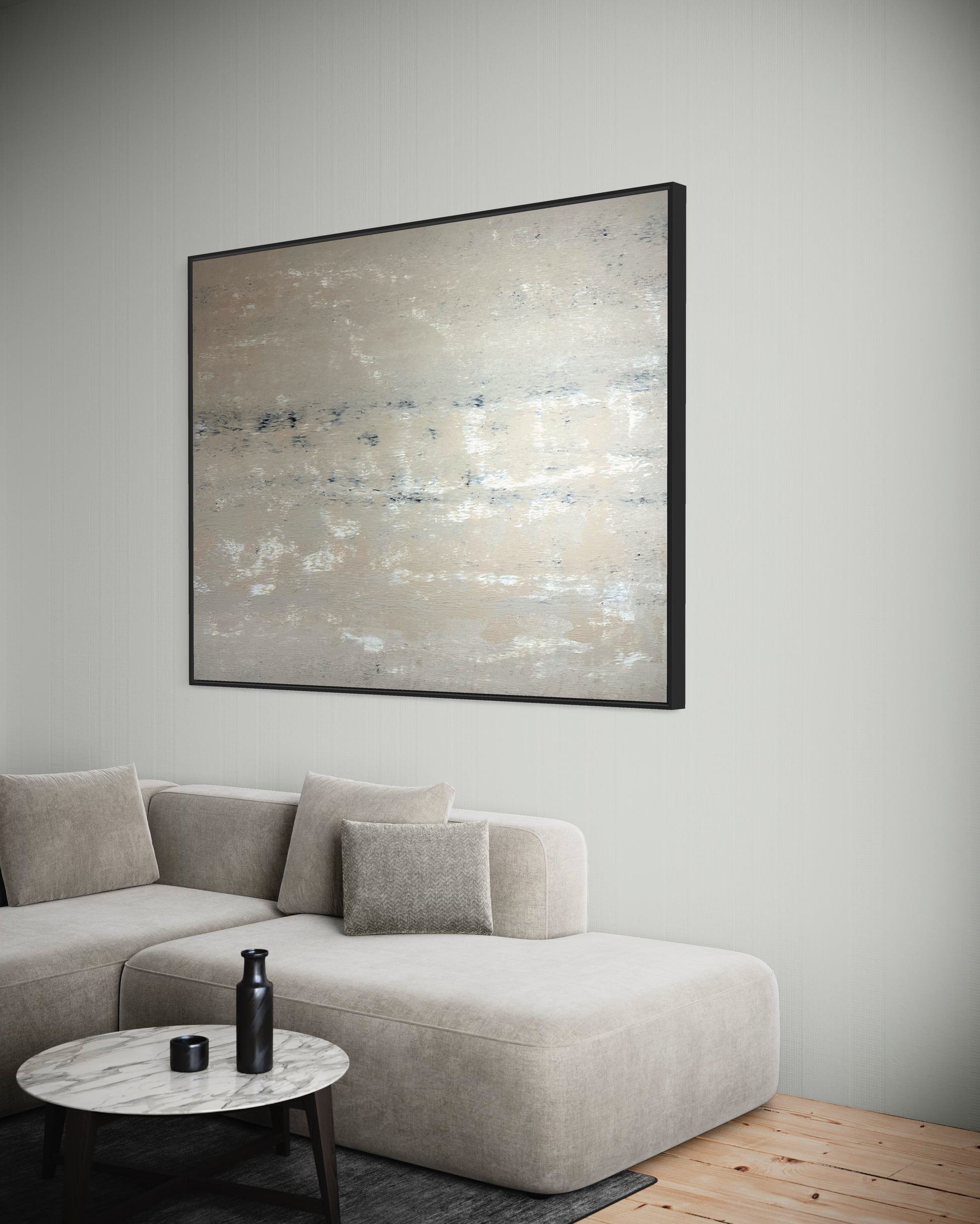 Dit unieke kunstwerk combineert op harmonieuze wijze de zachte nuances van crème en de mysterieuze diepte van zwart. De elegante, golvende overgangen op het doek geven dit kunstwerk een uitstraling van rustige en verfijnde stijl.