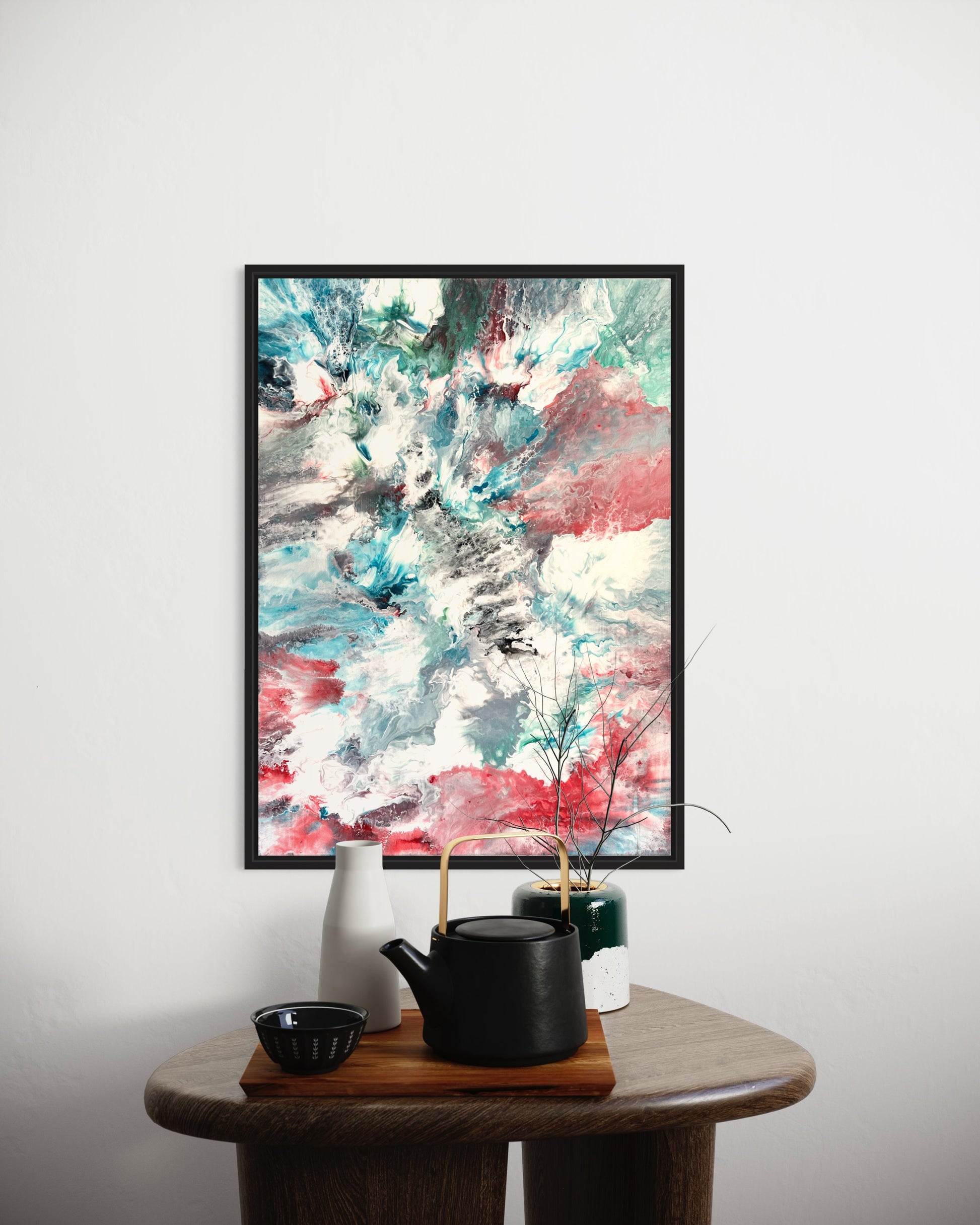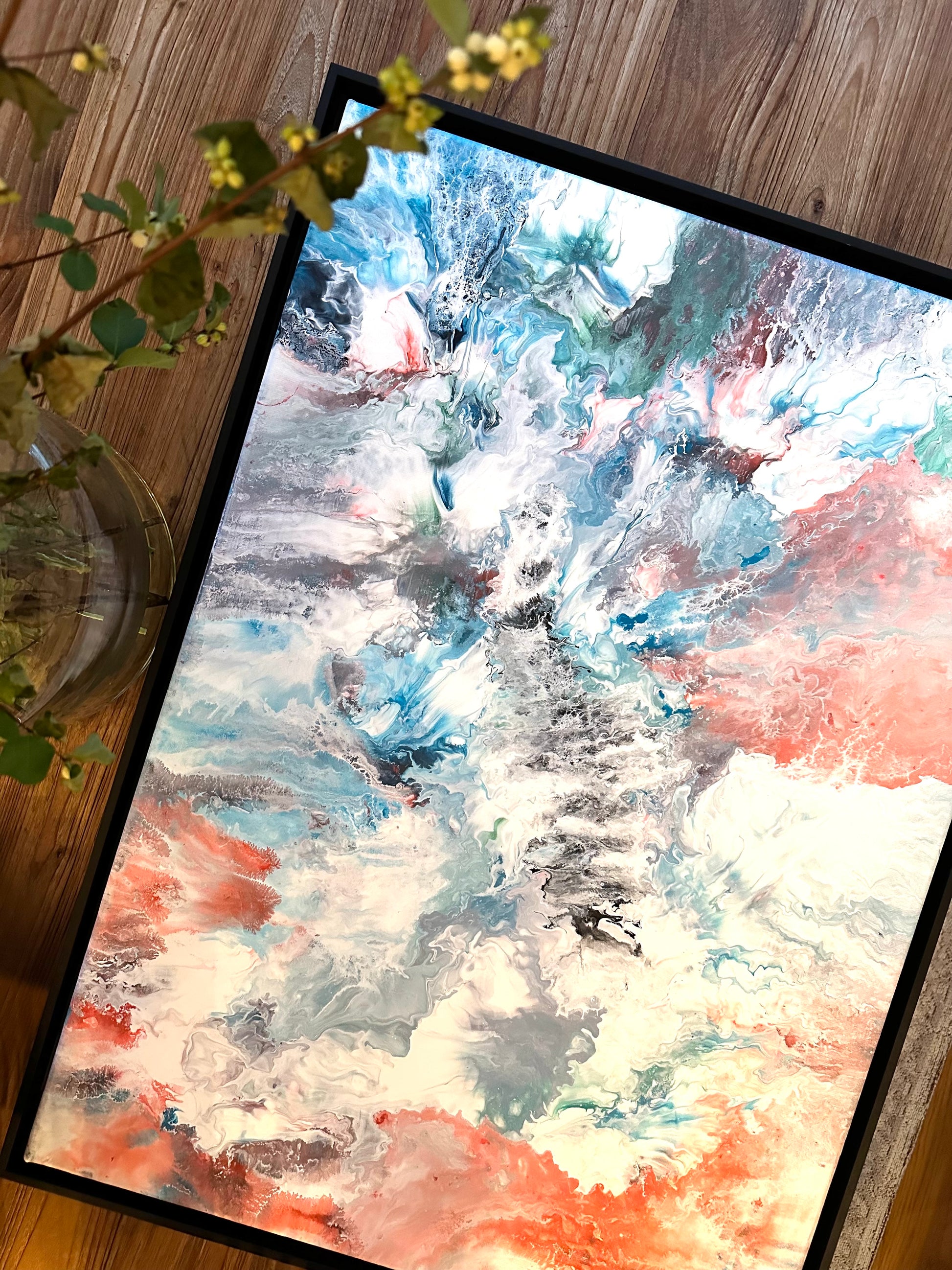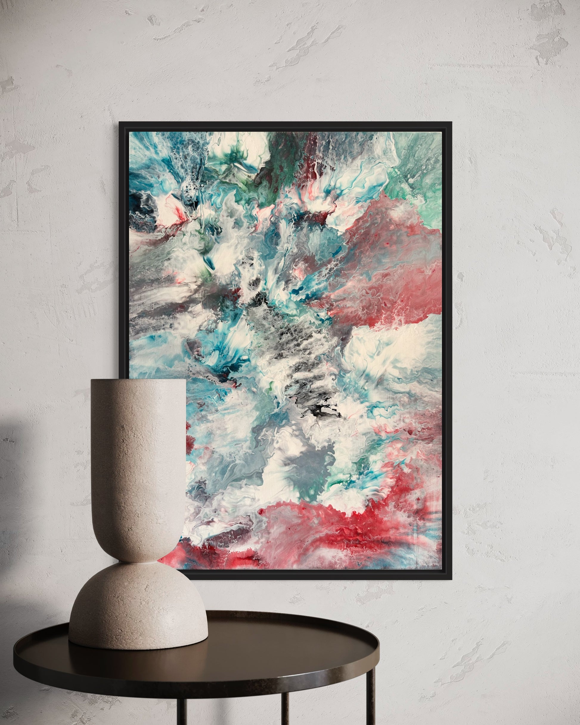 Ik nodig je uit om de fascinerende wereld van verandering te ontdekken met mijn kunstwerk "Van vuur tot ijs". Dit abstracte schilderij, 50x70 cm omgeven door een elegante zwarte lijst, legt de spannende transformatie van vuur naar ijs vast in een levendig kleurenpalet.