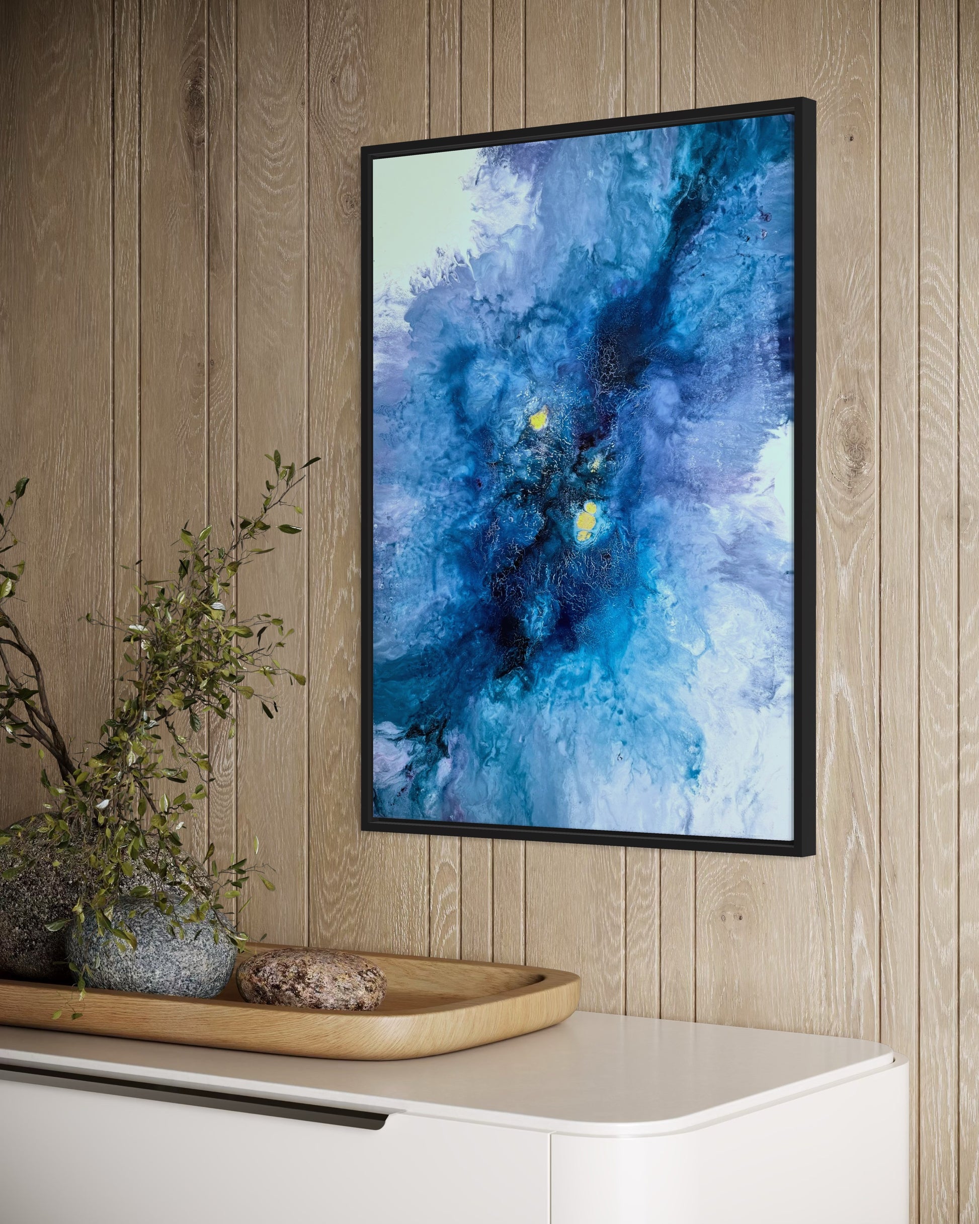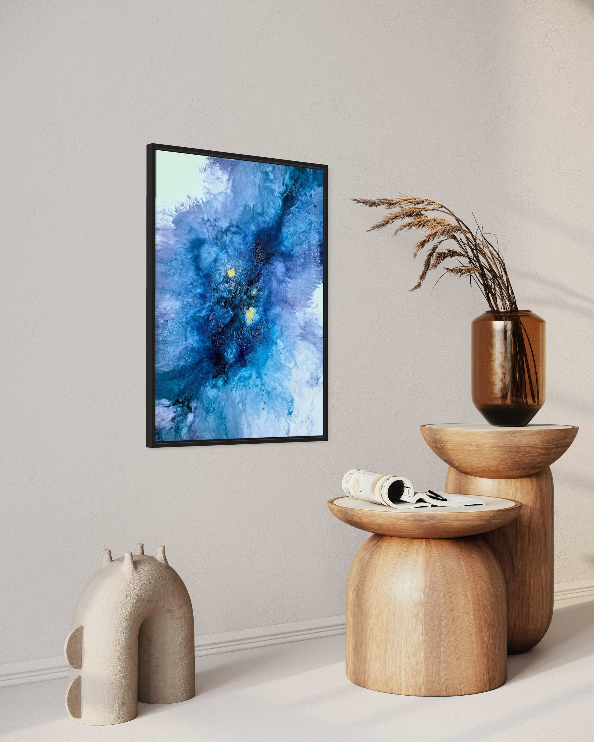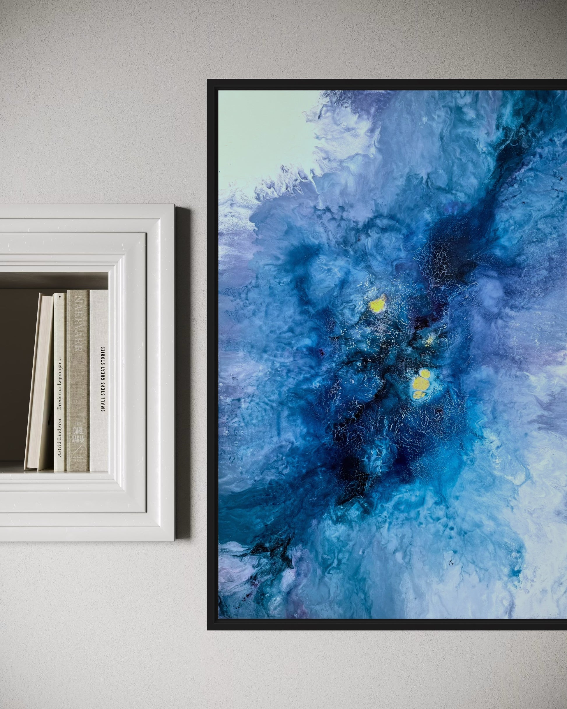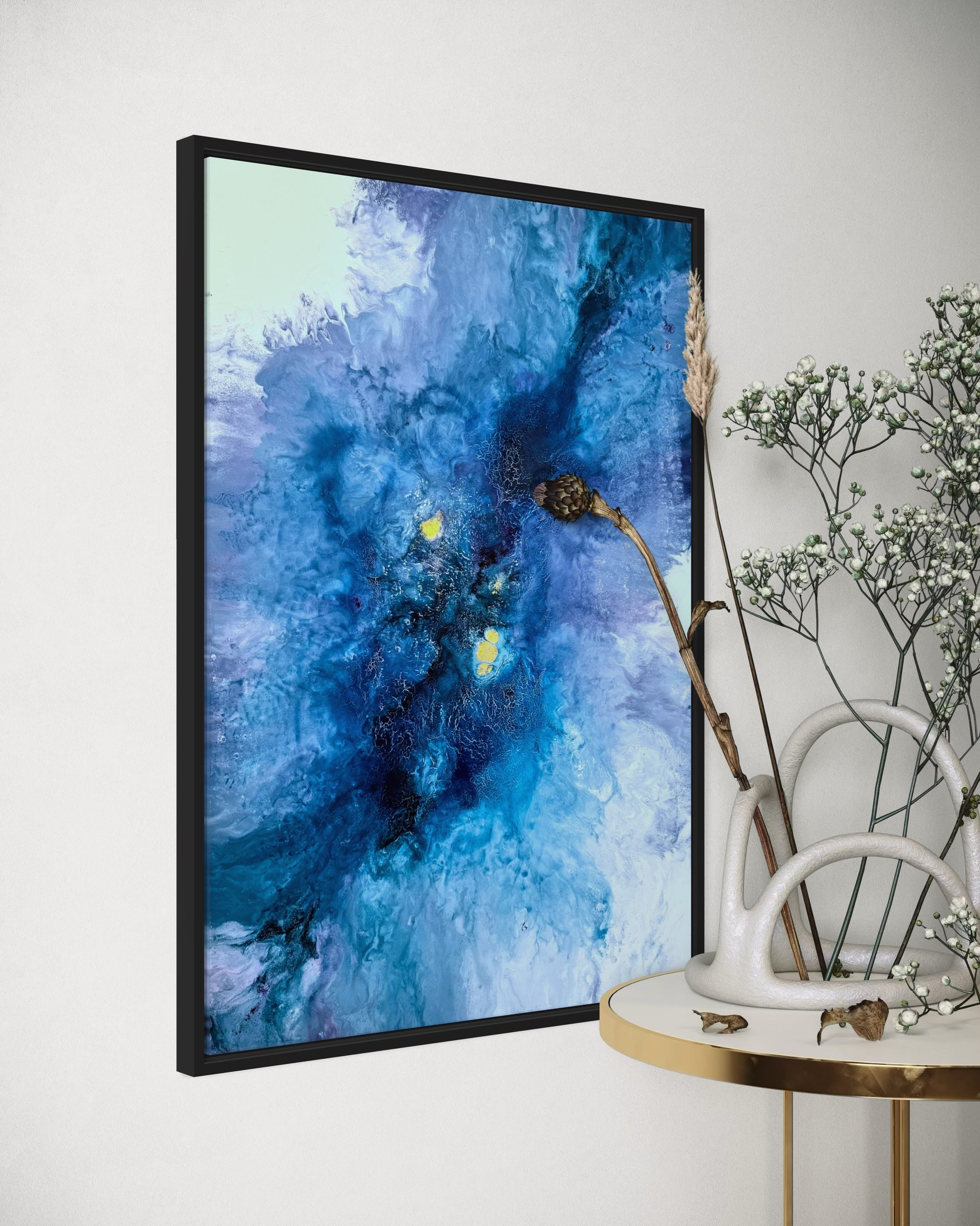 Euphoria betovert met levendige blauwtinten en een harmonieuze compositie. Met een afmeting van 70x50 cm is het ideaal om elke kamer een modern en stijlvol accent te geven. Het schilderij is geschilderd met hoogwaardige acrylverf op canvas en wordt geleverd inclusief lijst, klaar om op te hangen.