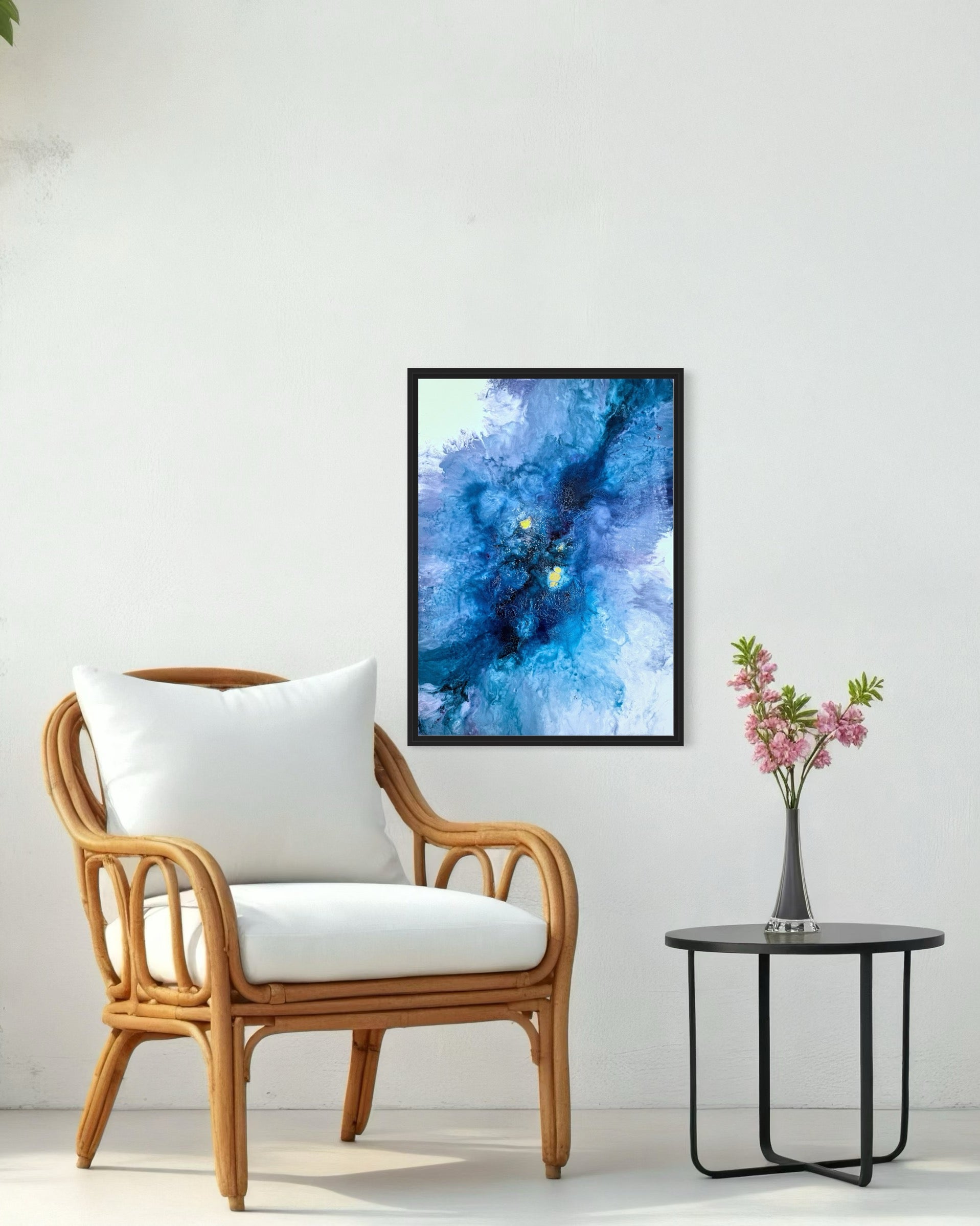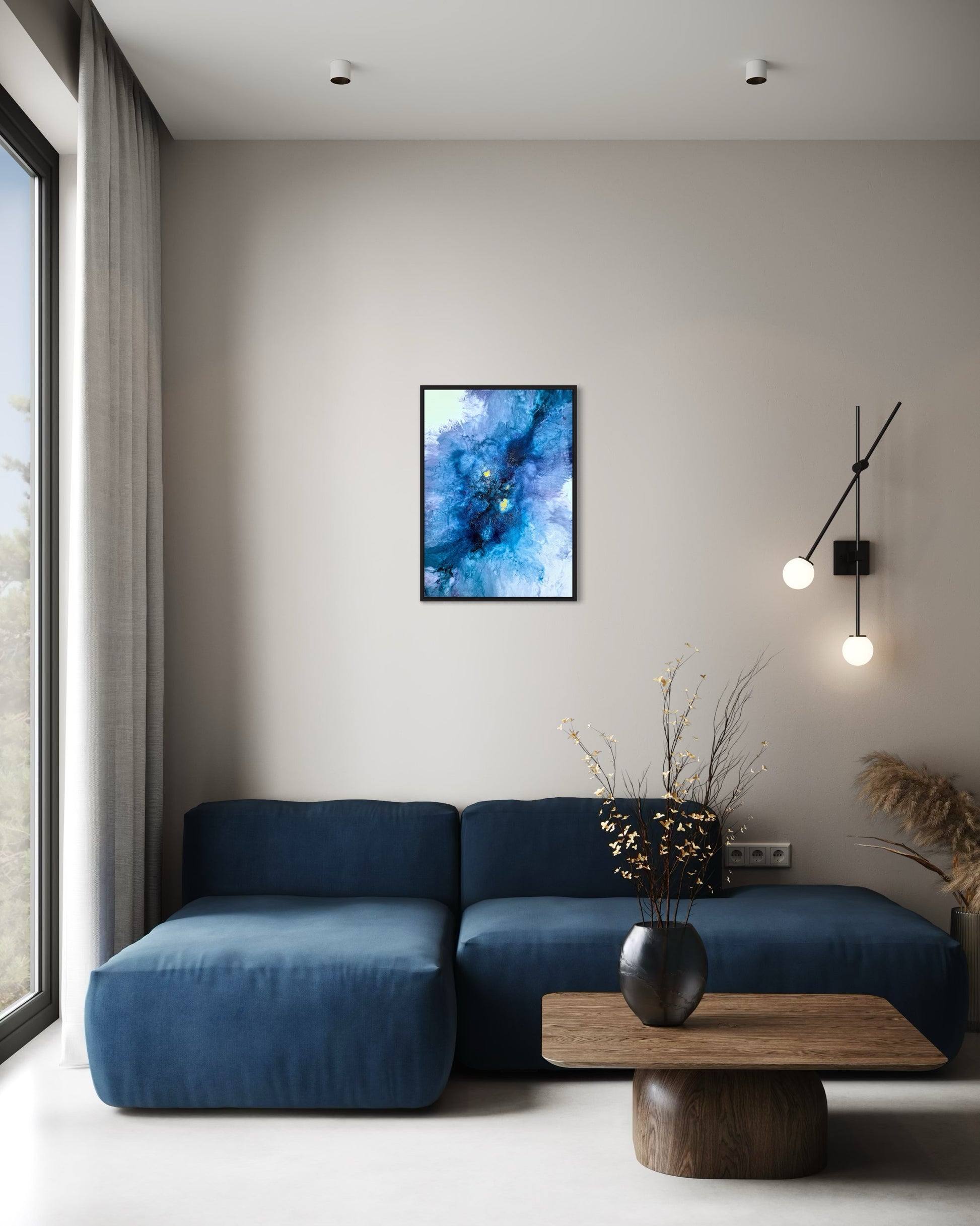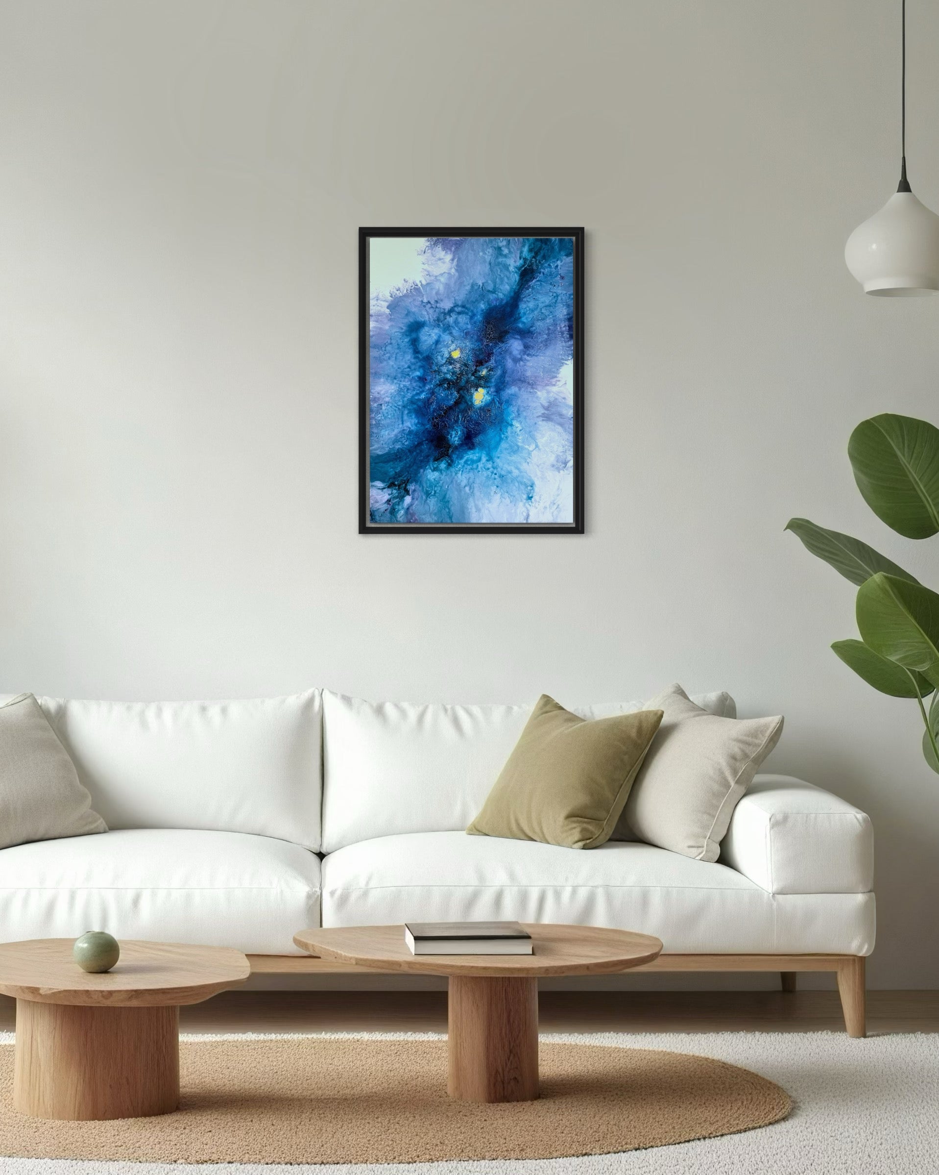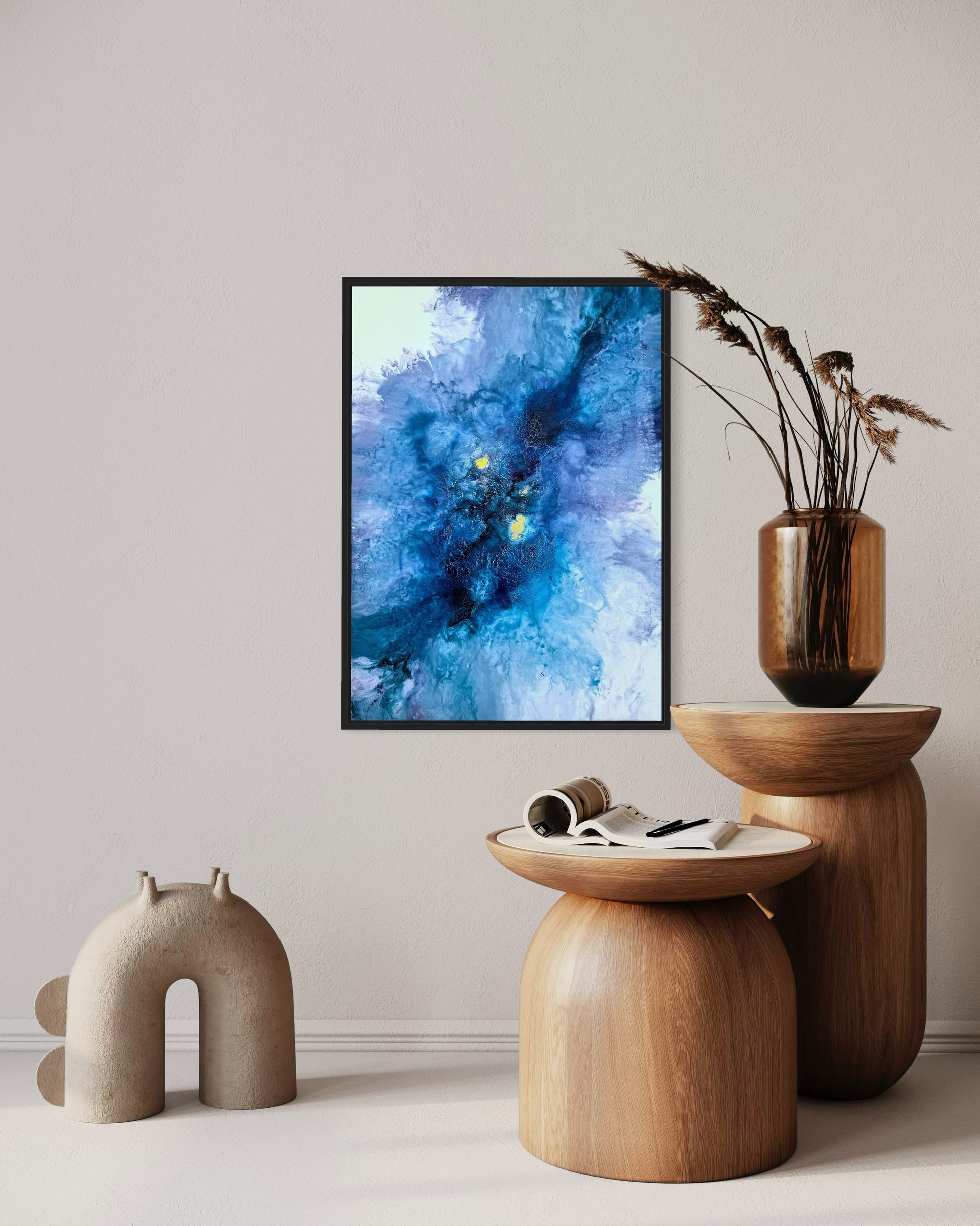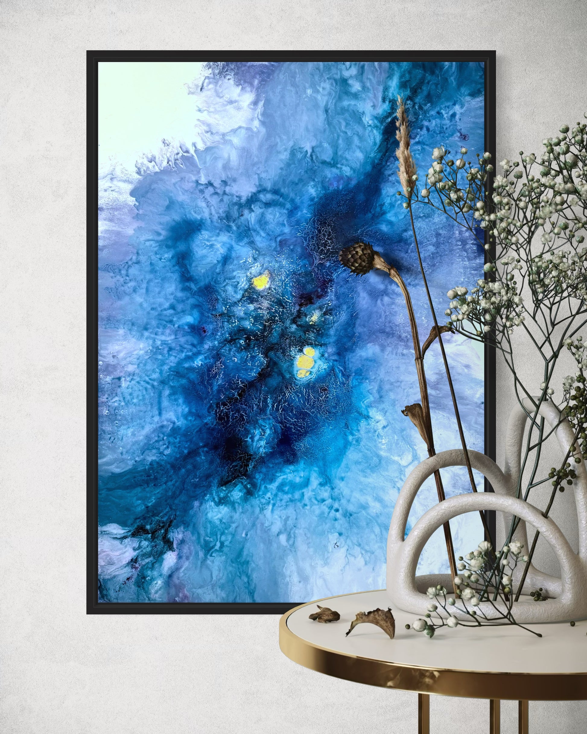 Euphoria betovert met levendige blauwtinten en een harmonieuze compositie. Met een afmeting van 70x50 cm is het ideaal om elke kamer een modern en stijlvol accent te geven. Het schilderij is geschilderd met hoogwaardige acrylverf op canvas en wordt geleverd inclusief lijst, klaar om op te hangen.