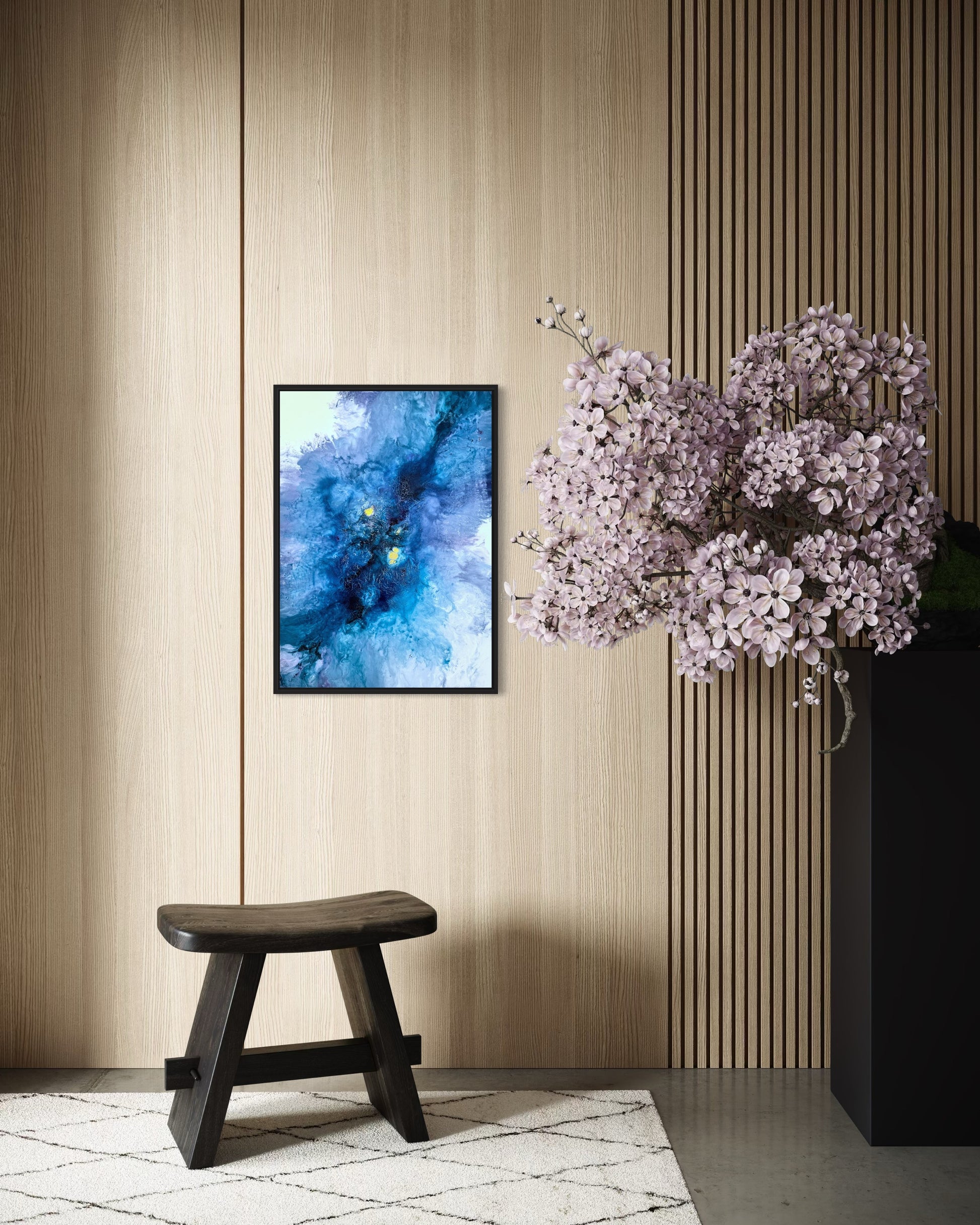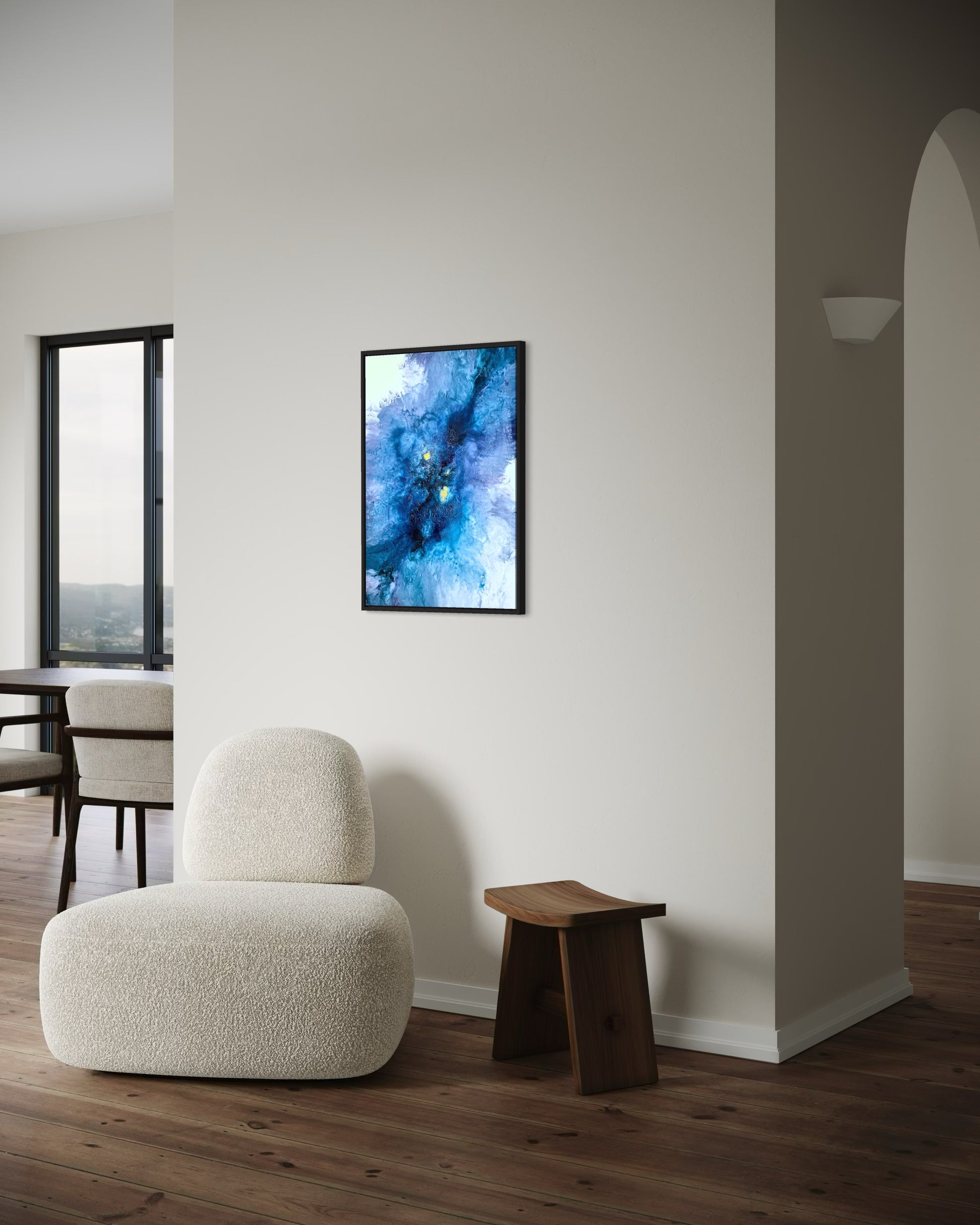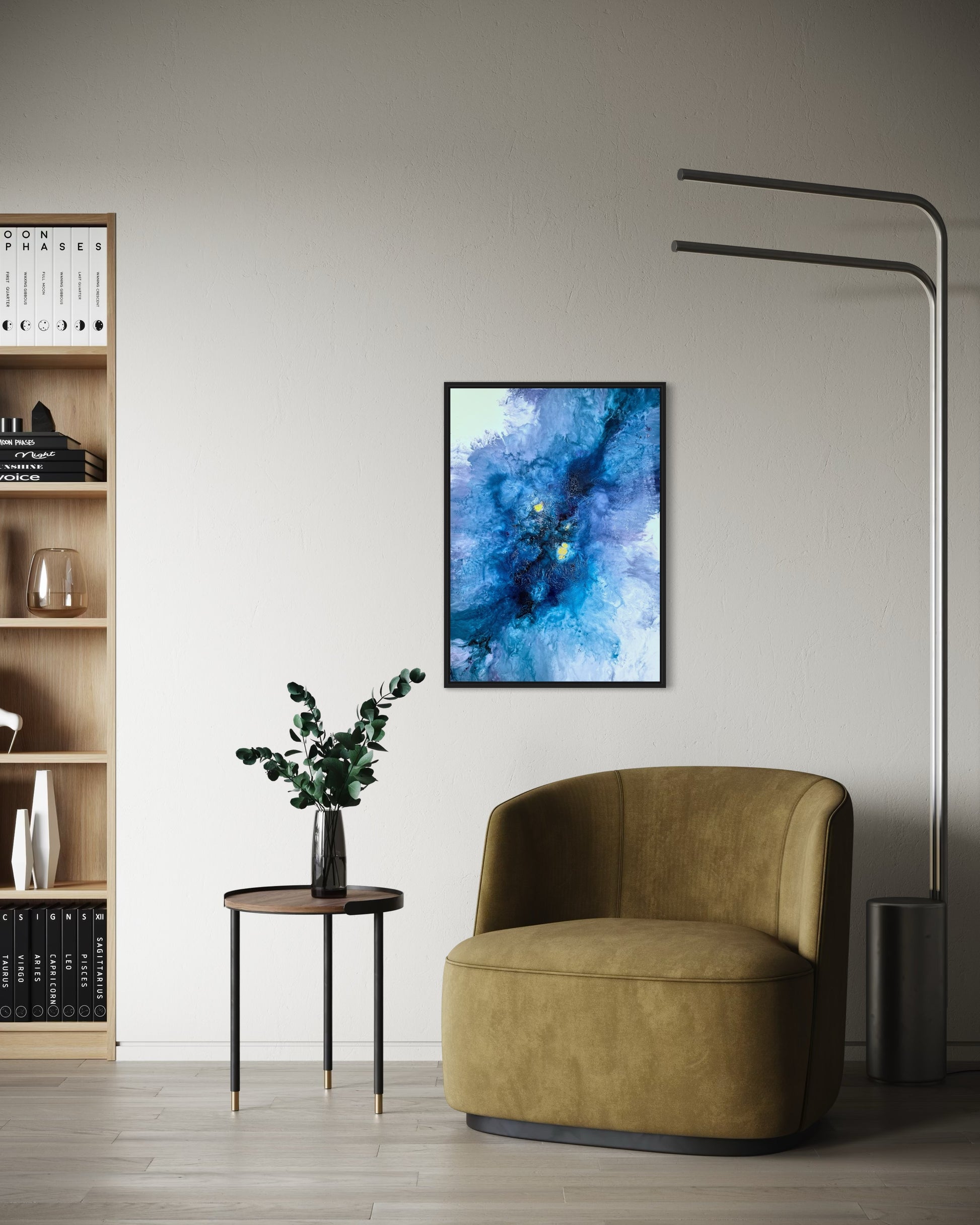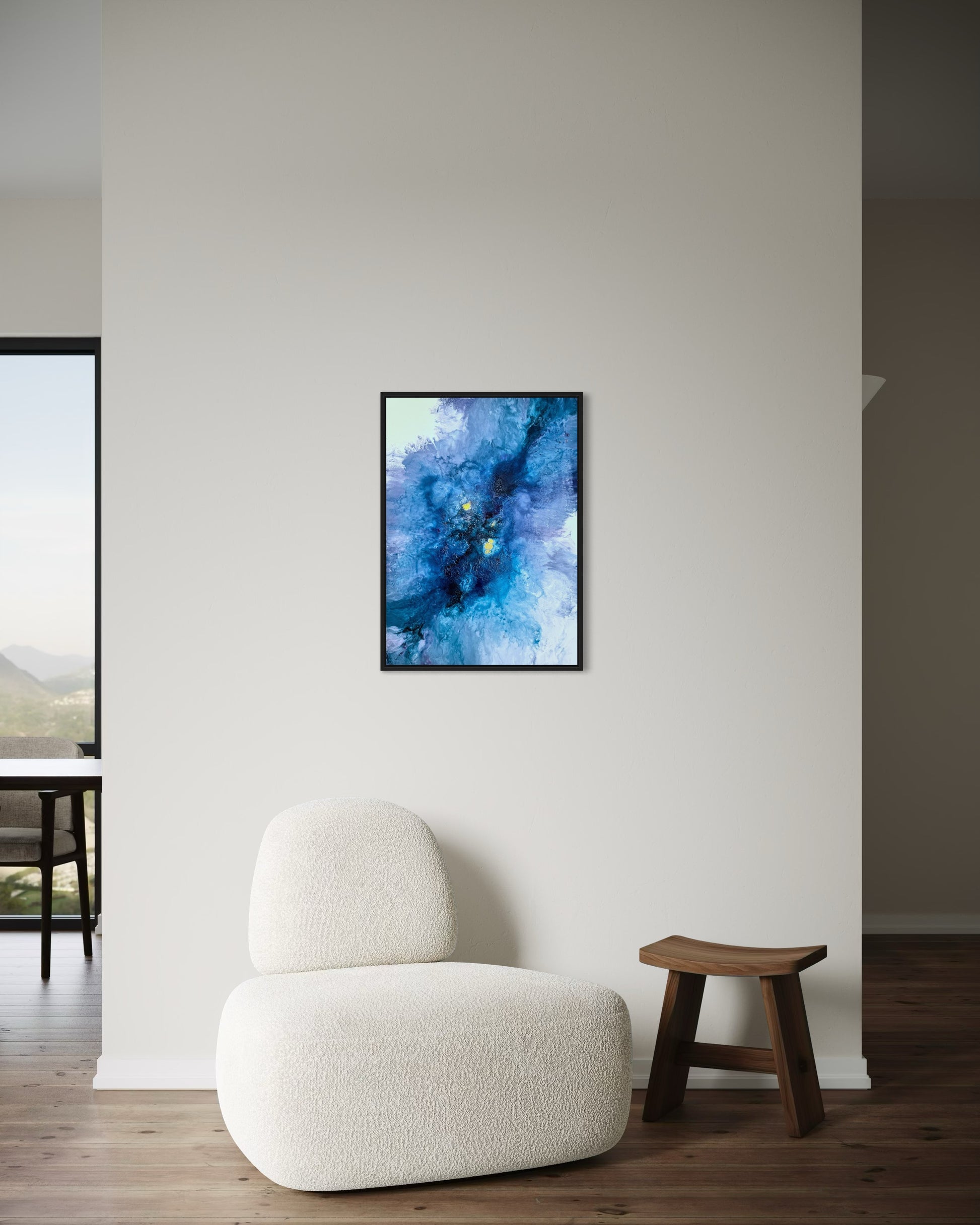 Euphoria betovert met levendige blauwtinten en een harmonieuze compositie. Met een afmeting van 70x50 cm is het ideaal om elke kamer een modern en stijlvol accent te geven. Het schilderij is geschilderd met hoogwaardige acrylverf op canvas en wordt geleverd inclusief lijst, klaar om op te hangen.