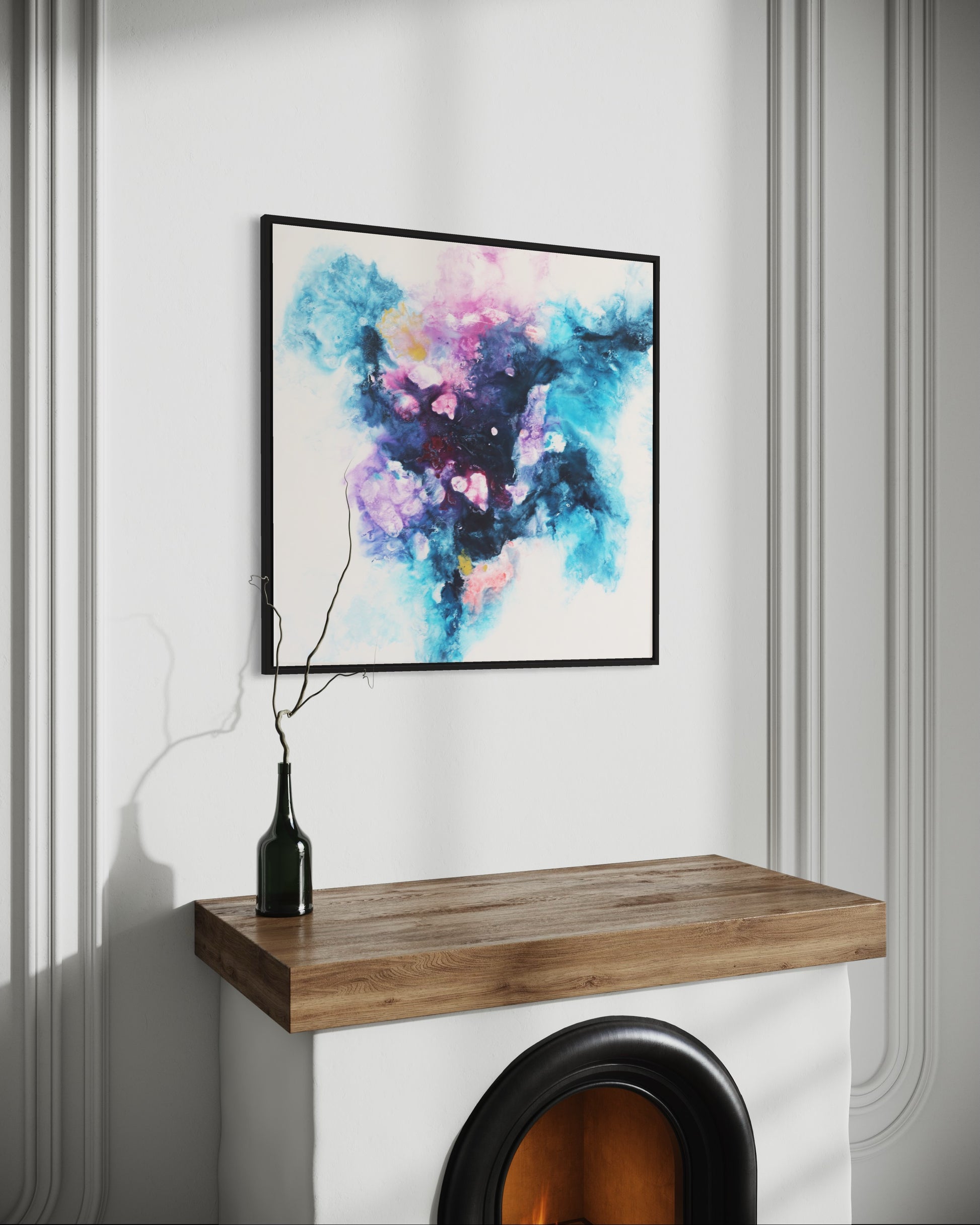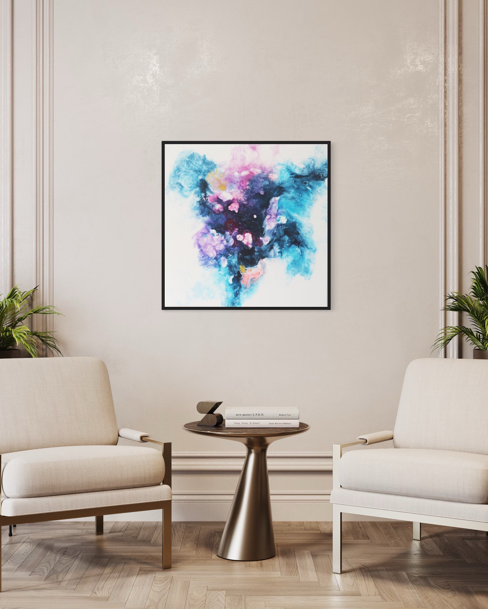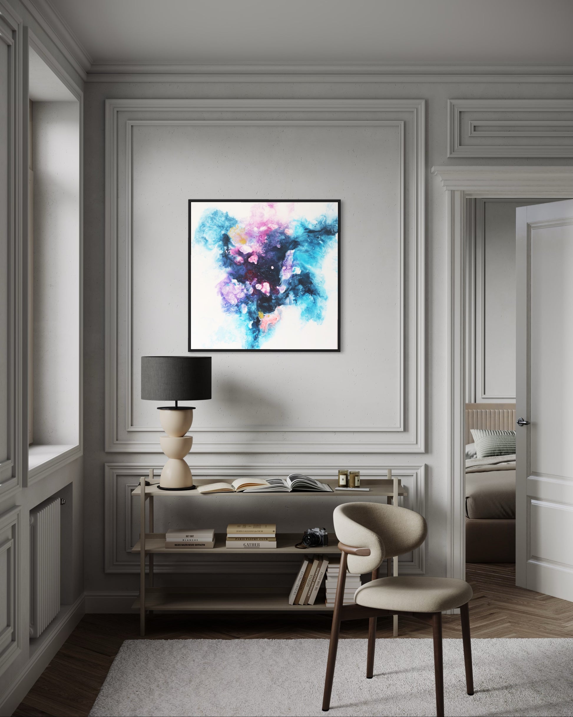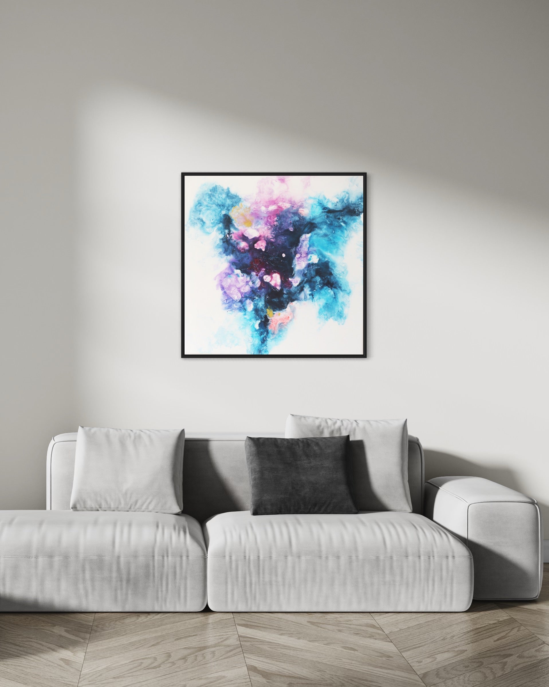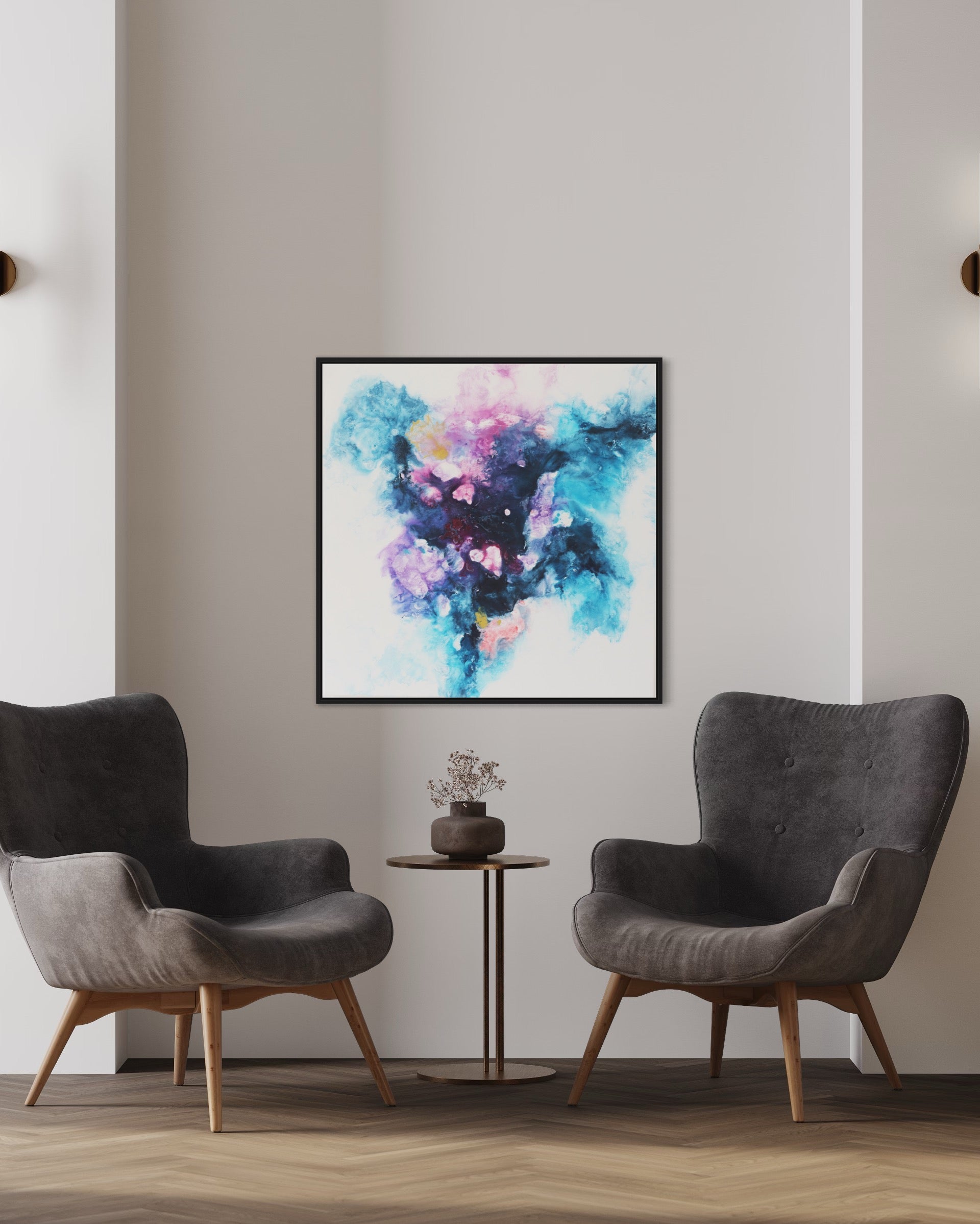 Transformeer je ruimte met 'Sphere', een betoverend abstract acrylschilderij op canvas, meesterlijk vervaardigd met behulp van de tegeltechniek. Dit prachtige kunstwerk, met een afmeting van 80x80 cm, heeft een levendige mix van blauwe, paarse en roze tinten, waardoor een dynamische en etherische compositie ontstaat die elke kunstliefhebber zal bekoren.