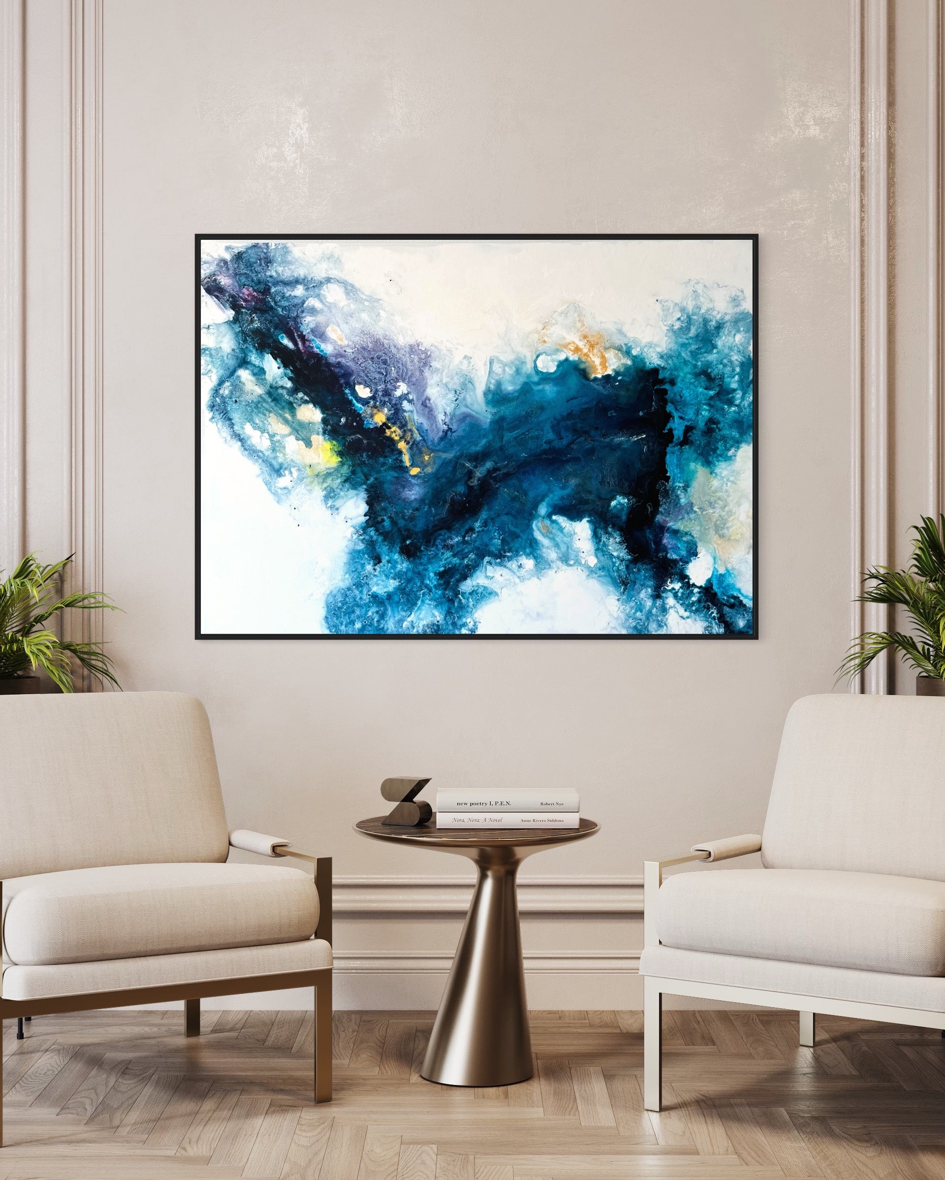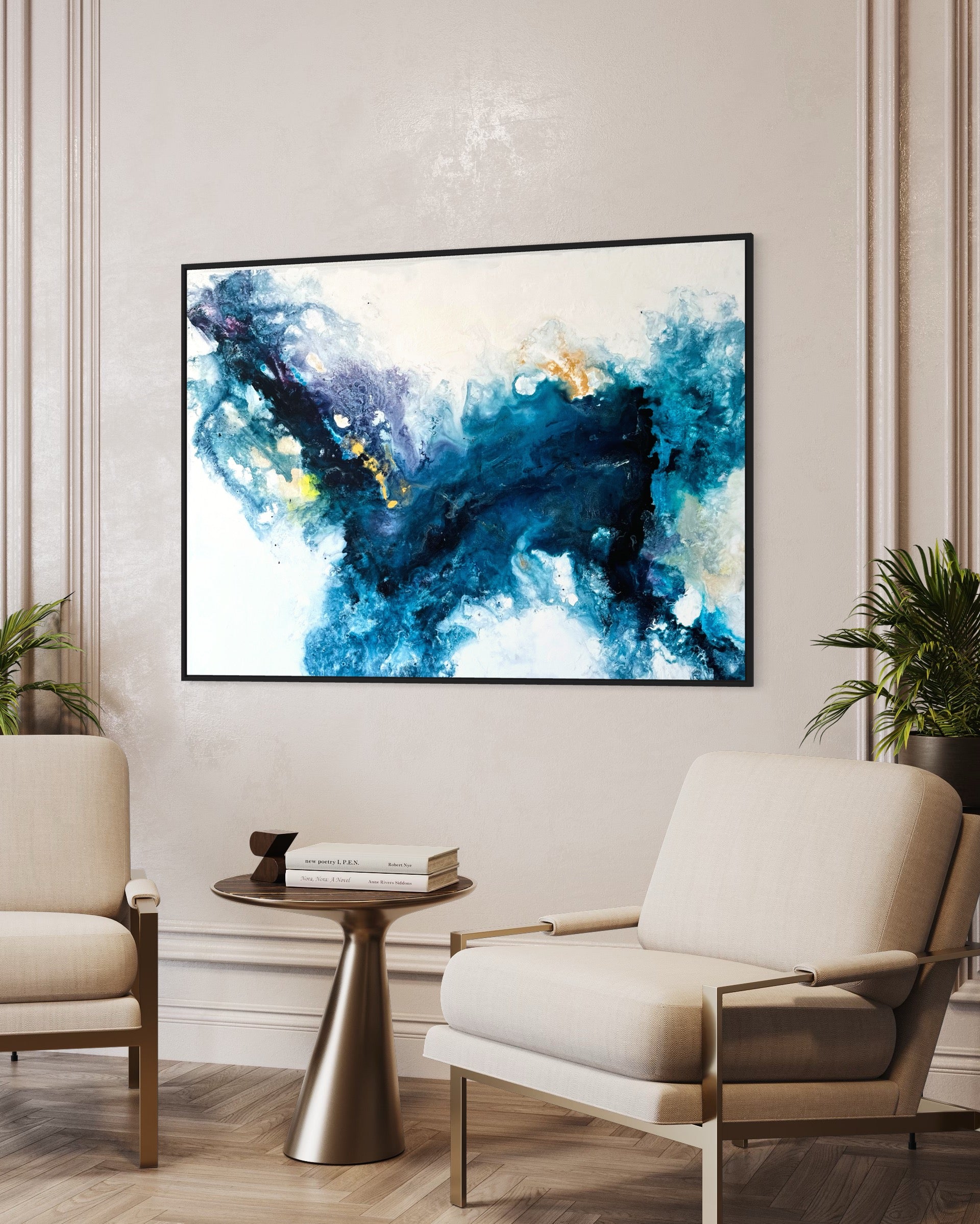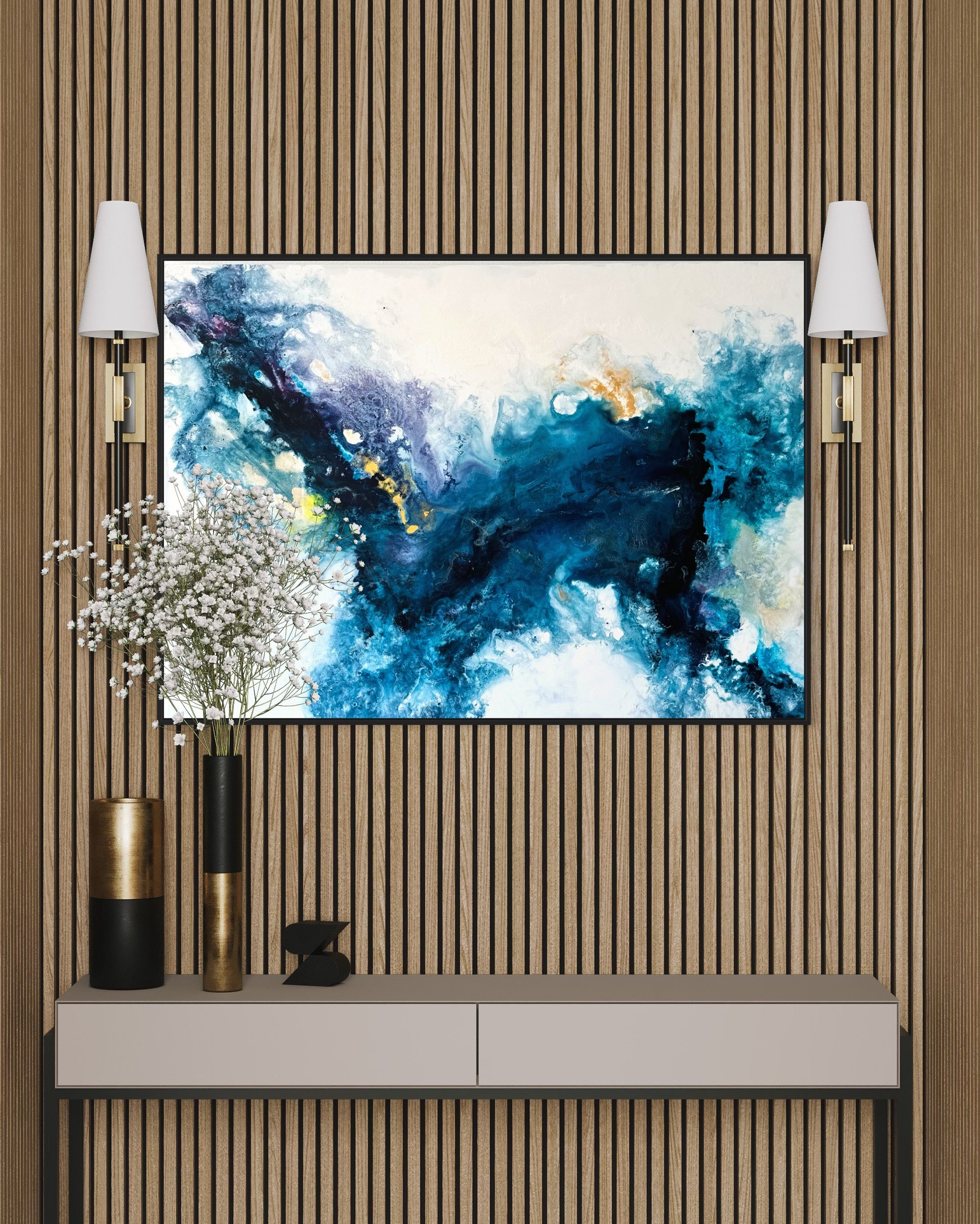 "Ocean's Treasury" is een handgeschilderd acrylschilderij dat bekoort door zijn heldere vormen en harmonieuze kleuren. De combinatie van diepblauwe tinten, zachte goudaccenten en subtiele paarstinten geeft het schilderij een bijzondere uitstraling die rust en elegantie in elke kamer brengt. Met een afmeting van 100 x 140 centimeter is het werk ideaal voor grote muren en past het perfect in moderne interieurs.