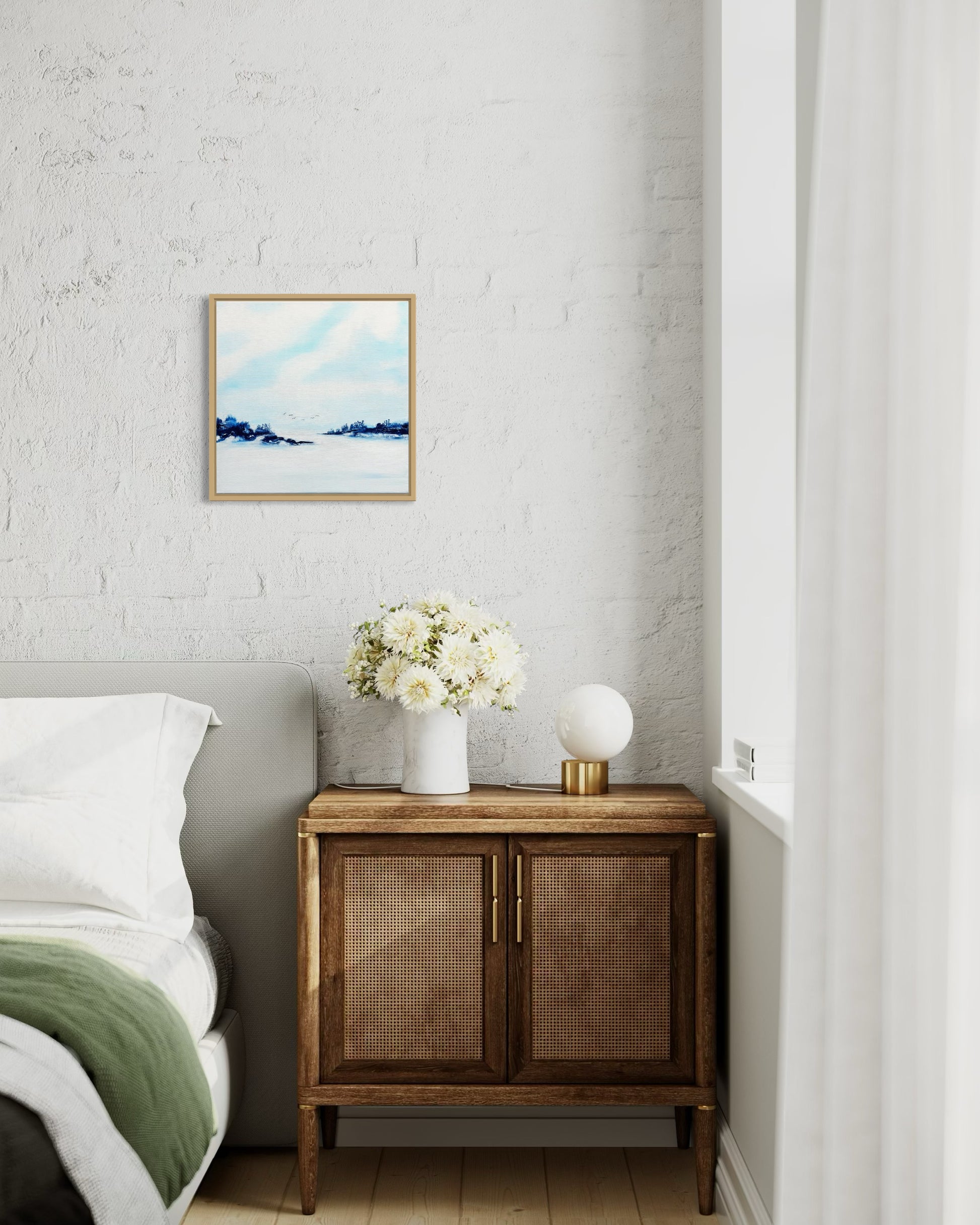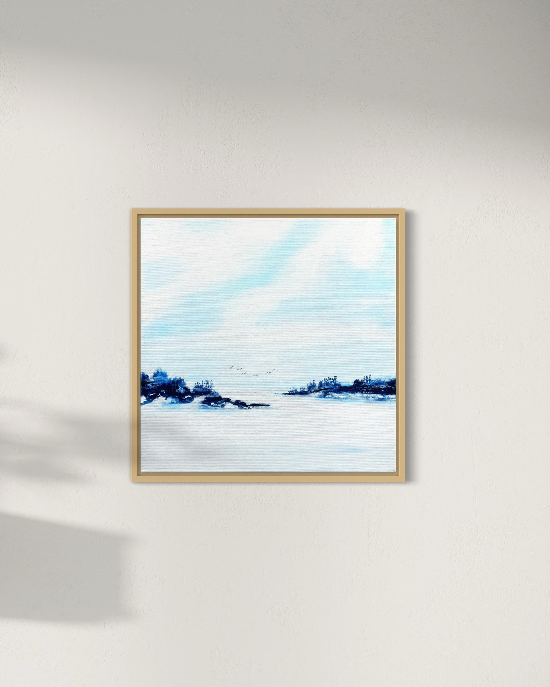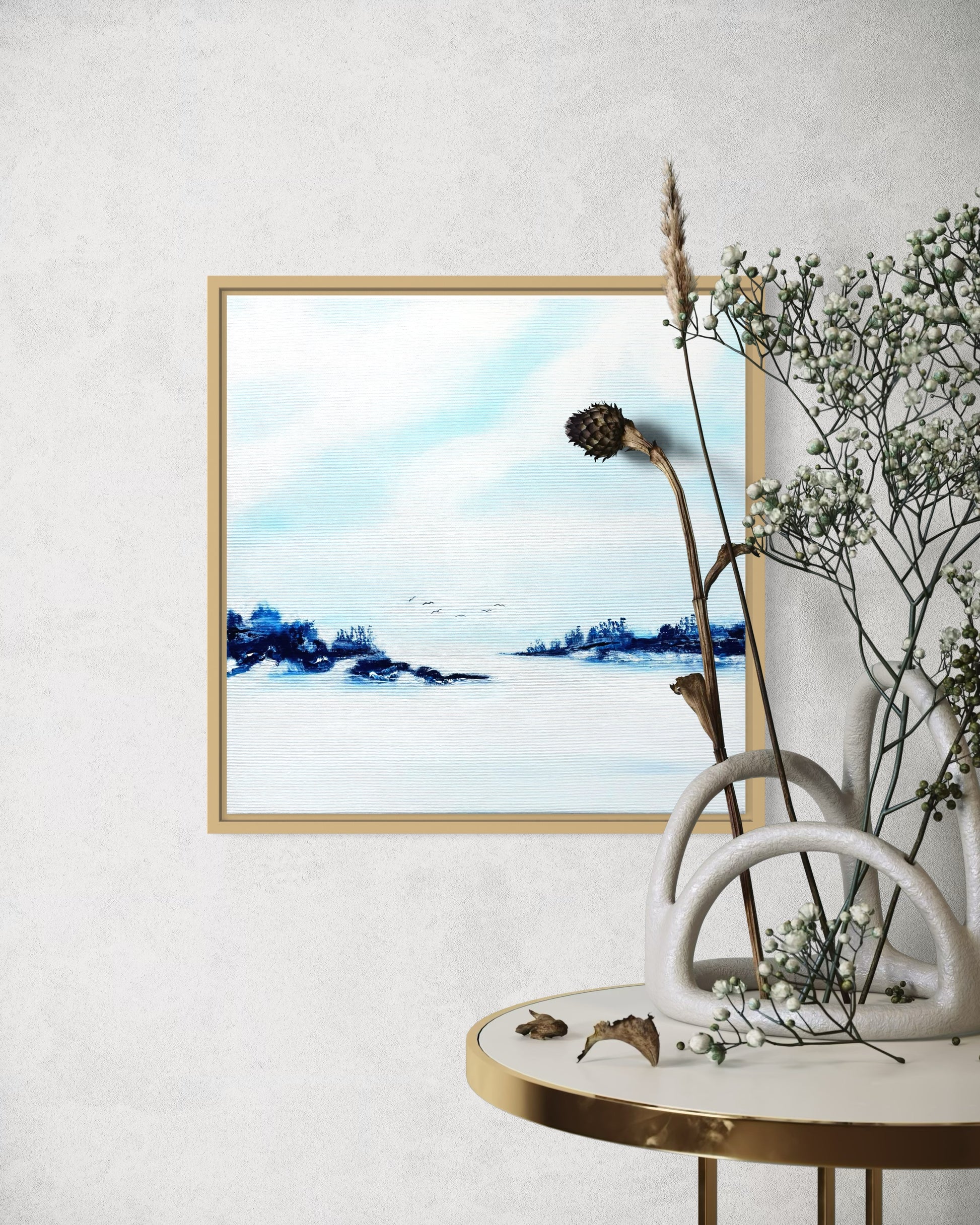 Peaceful Tide verbeeldt een rustig moment aan zee – waar lucht en water elkaar in zachte harmonie ontmoeten. De zachte blauwtinten en rustgevende contrasten stralen helderheid, vrede en weidsheid uit. De evenwichtige compositie creëert ruimte voor rust en een moment van bezinning.