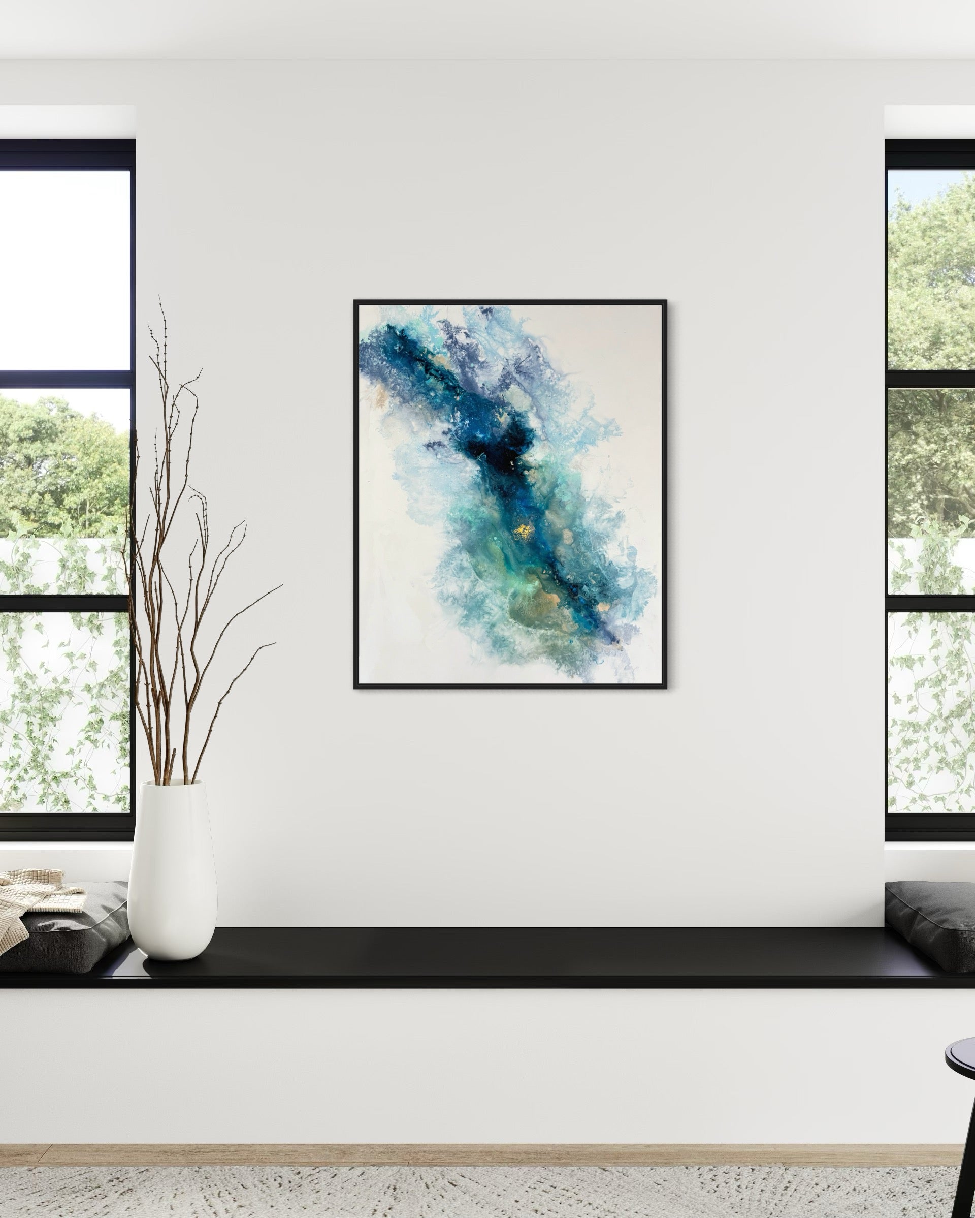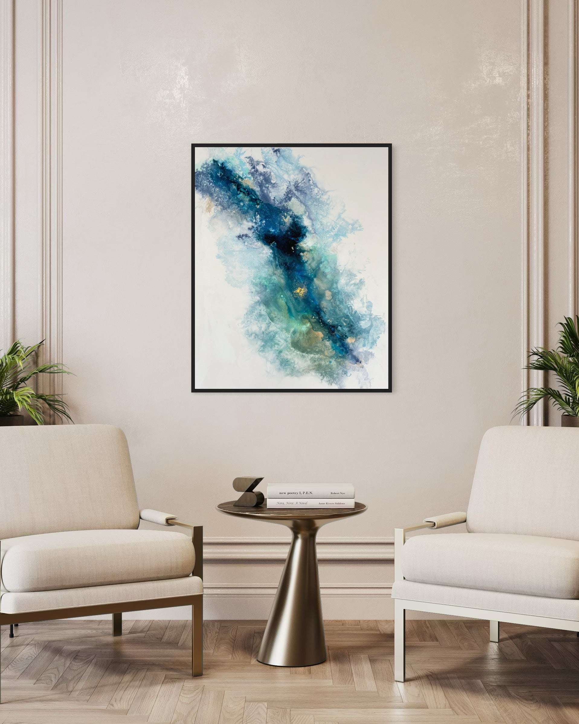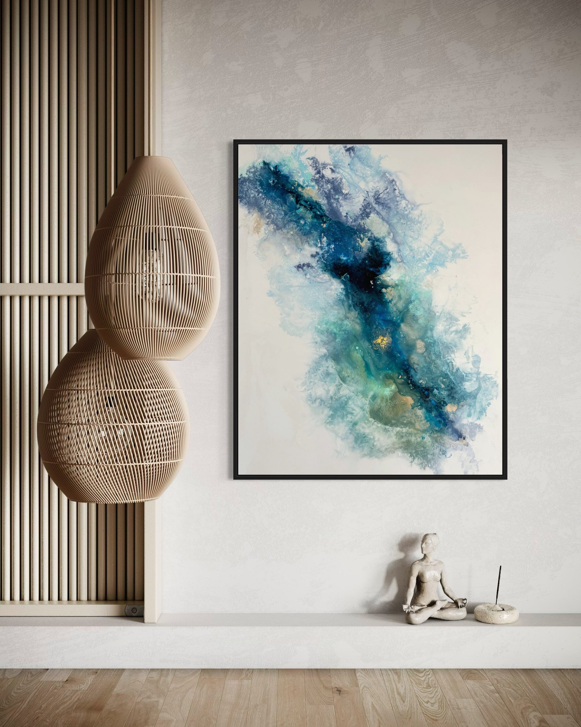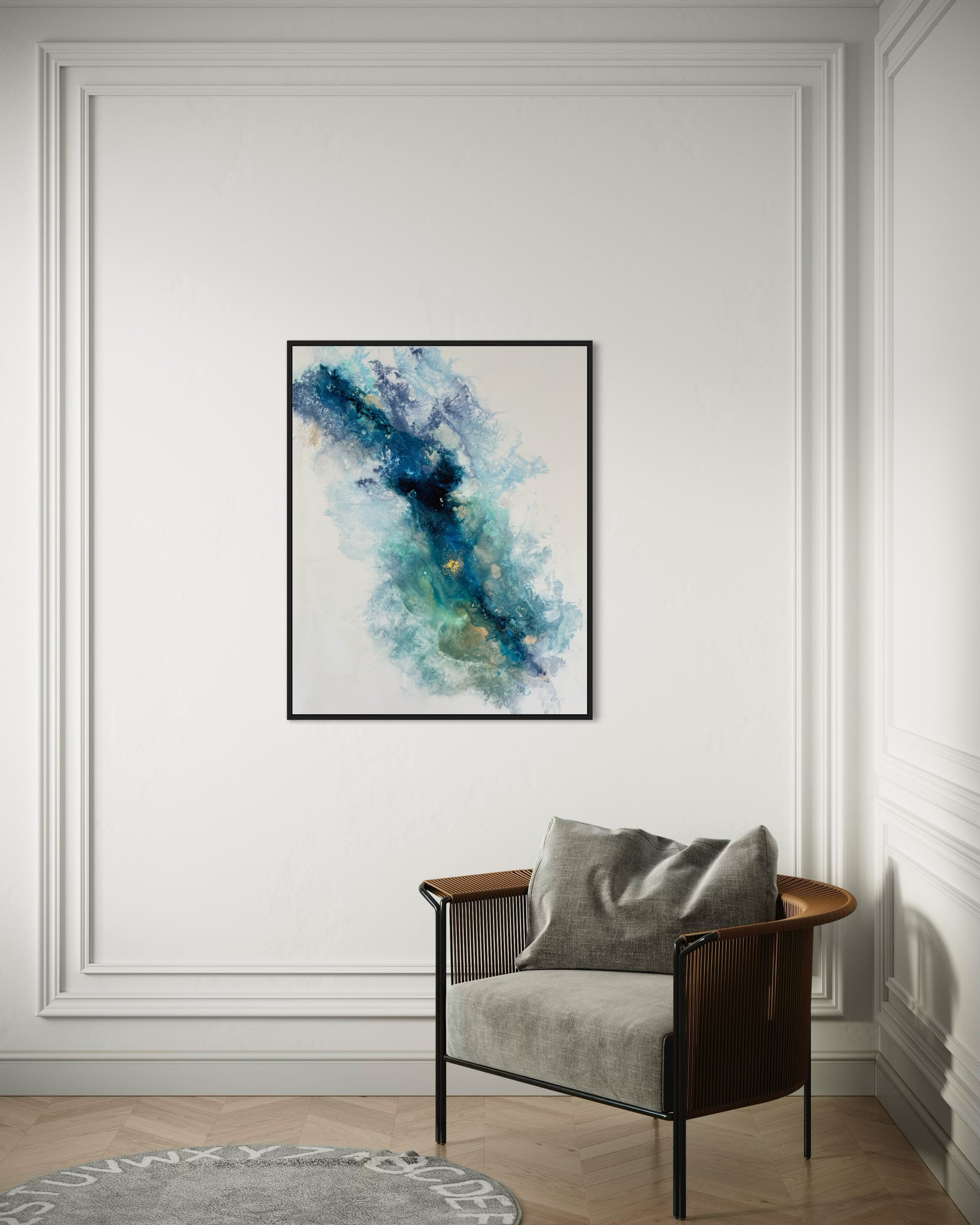 "Blue Breeze" brengt een harmonieuze mix van blauwe, groene en gouden accenten op het canvas. Met een afmeting van 100x80 cm en hoogwaardig vakmanschap is het een kunstwerk dat elegantie en rust in elke kamer brengt.