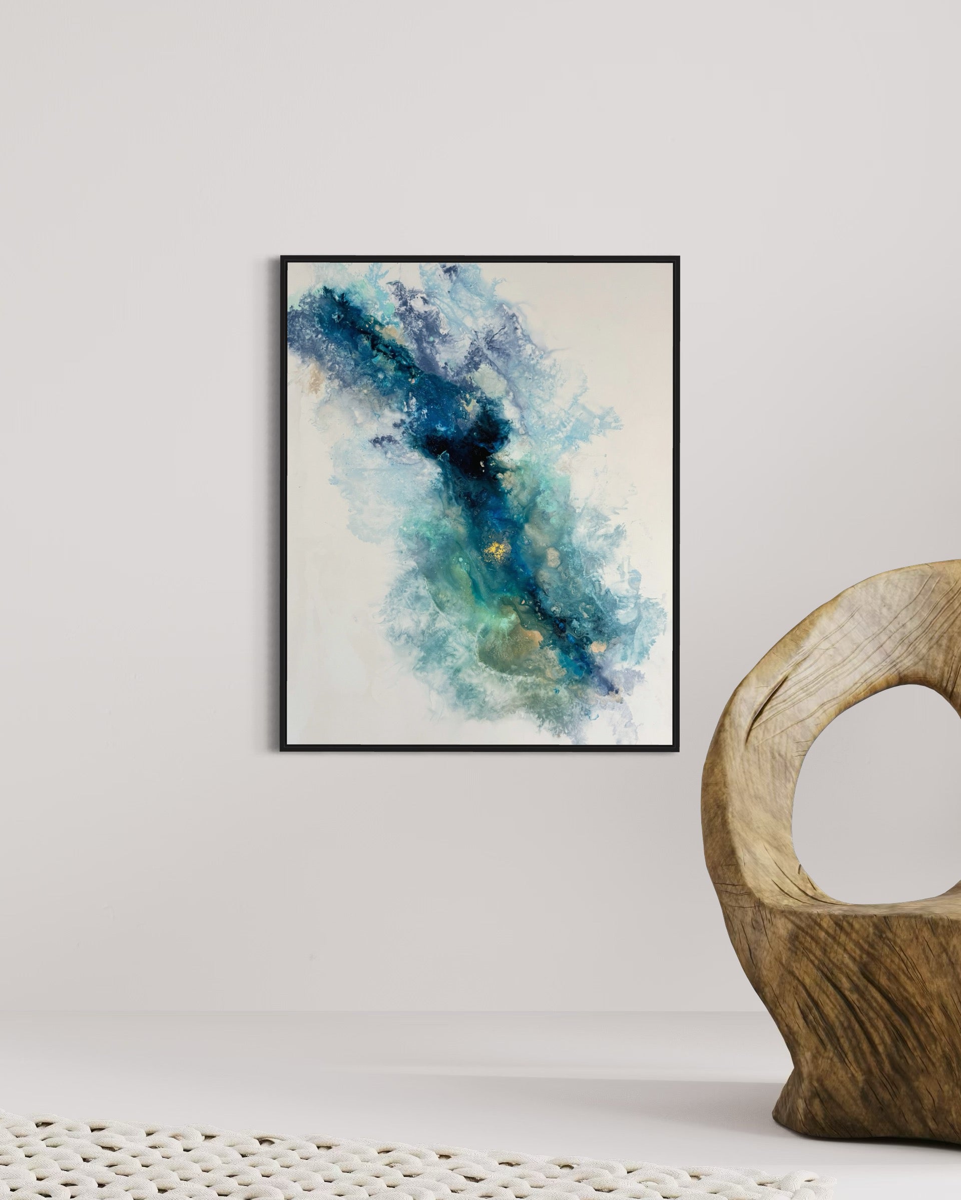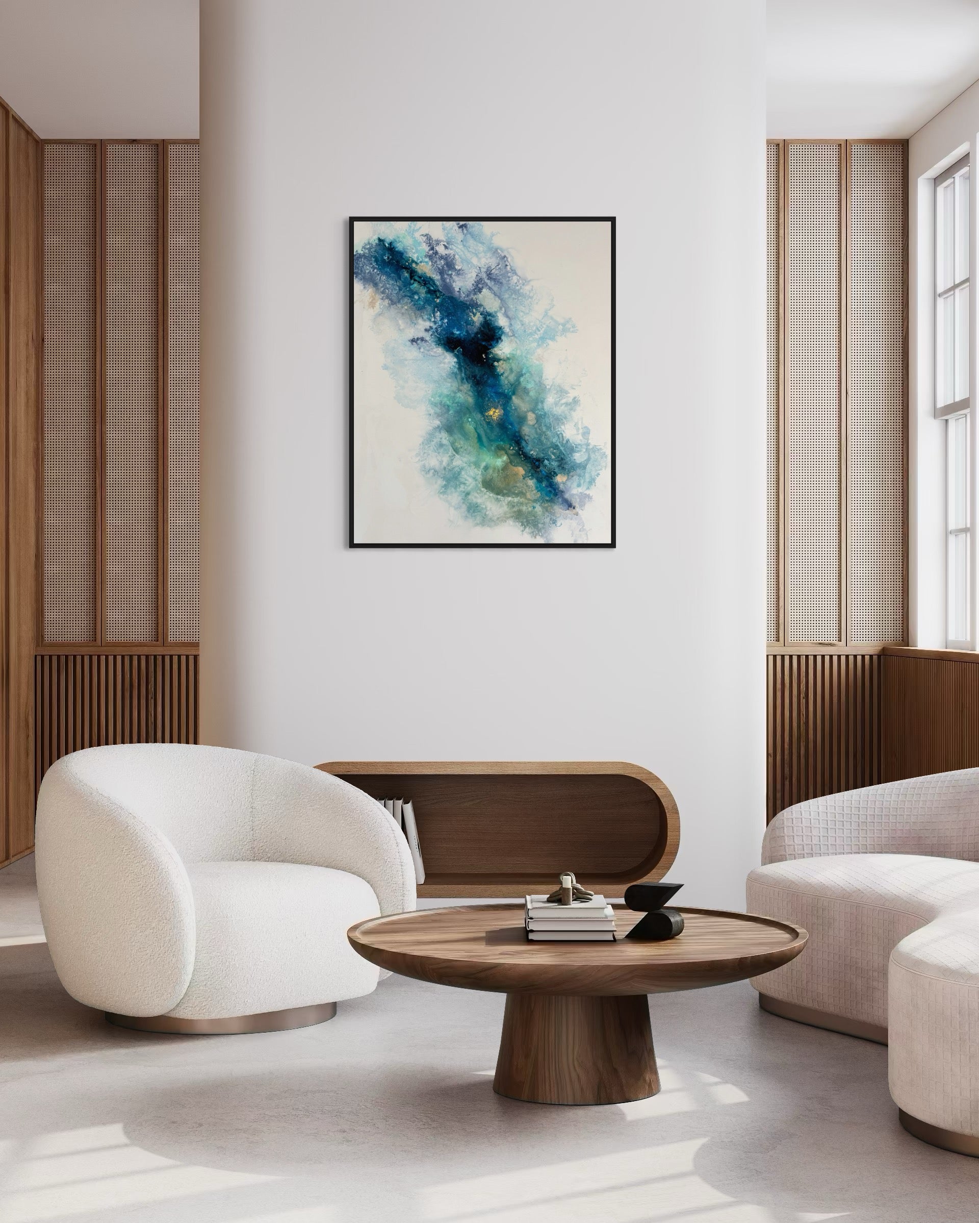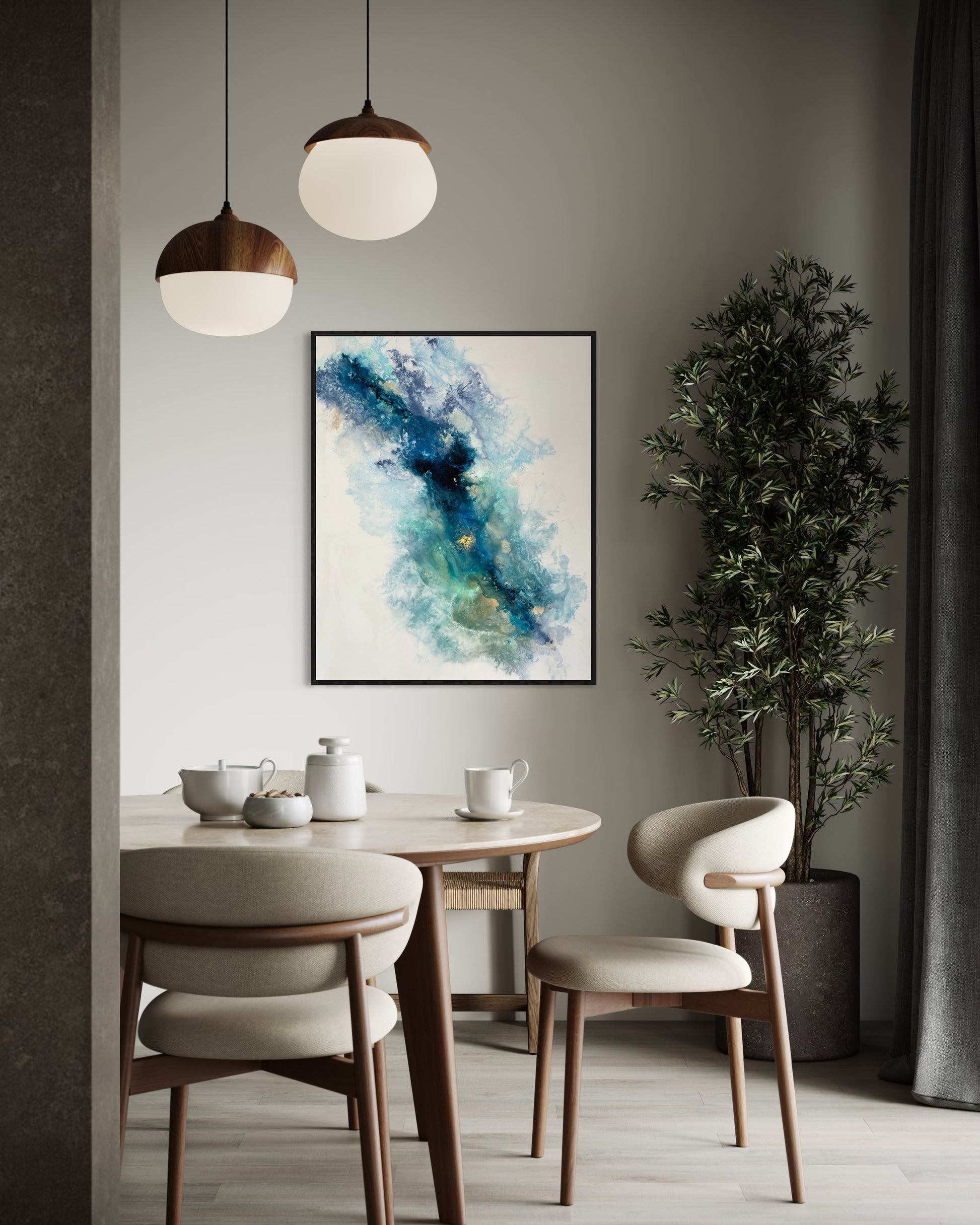 "Blue Breeze" brengt een harmonieuze mix van blauwe, groene en gouden accenten op het canvas. Met een afmeting van 100x80 cm en hoogwaardig vakmanschap is het een kunstwerk dat elegantie en rust in elke kamer brengt.