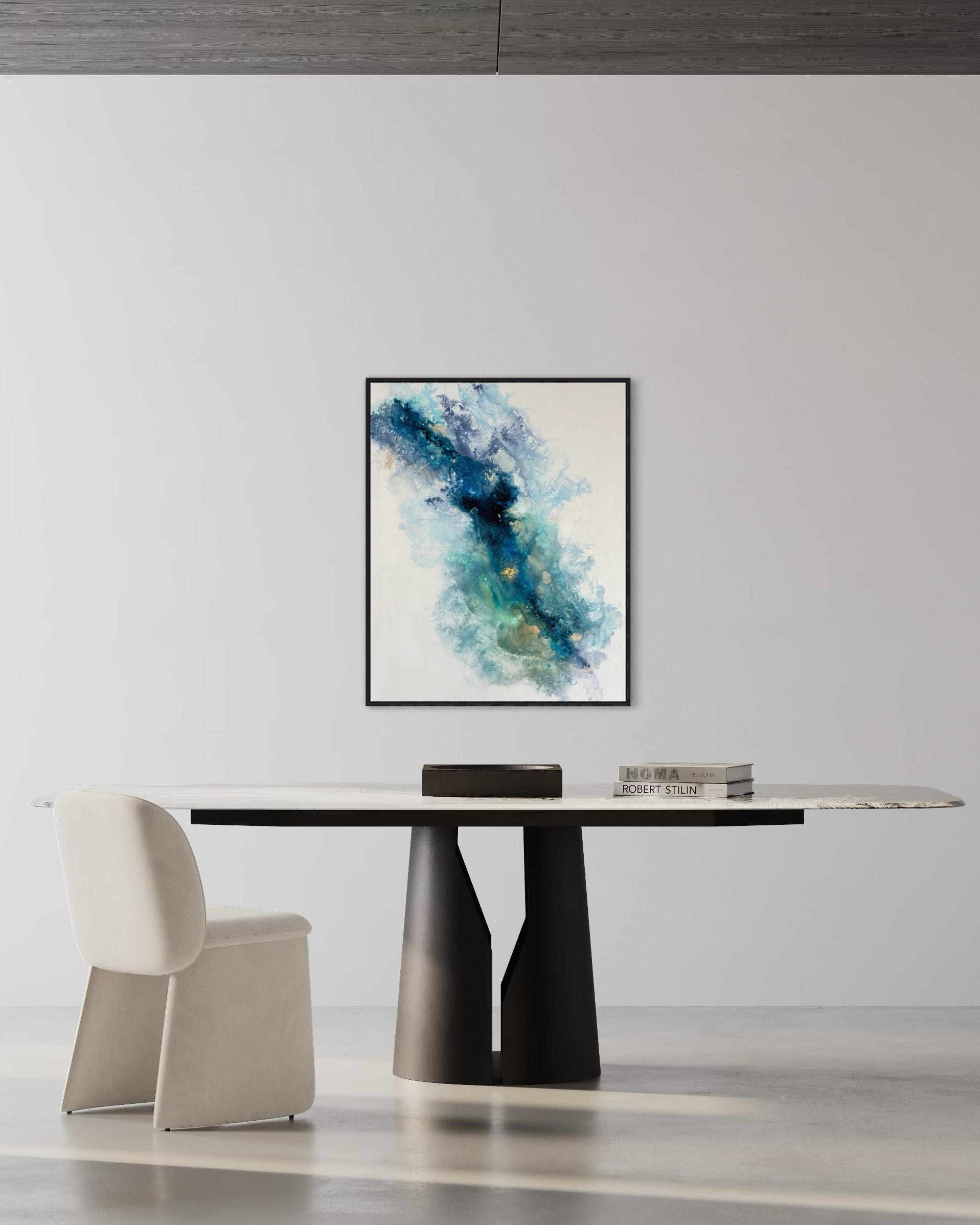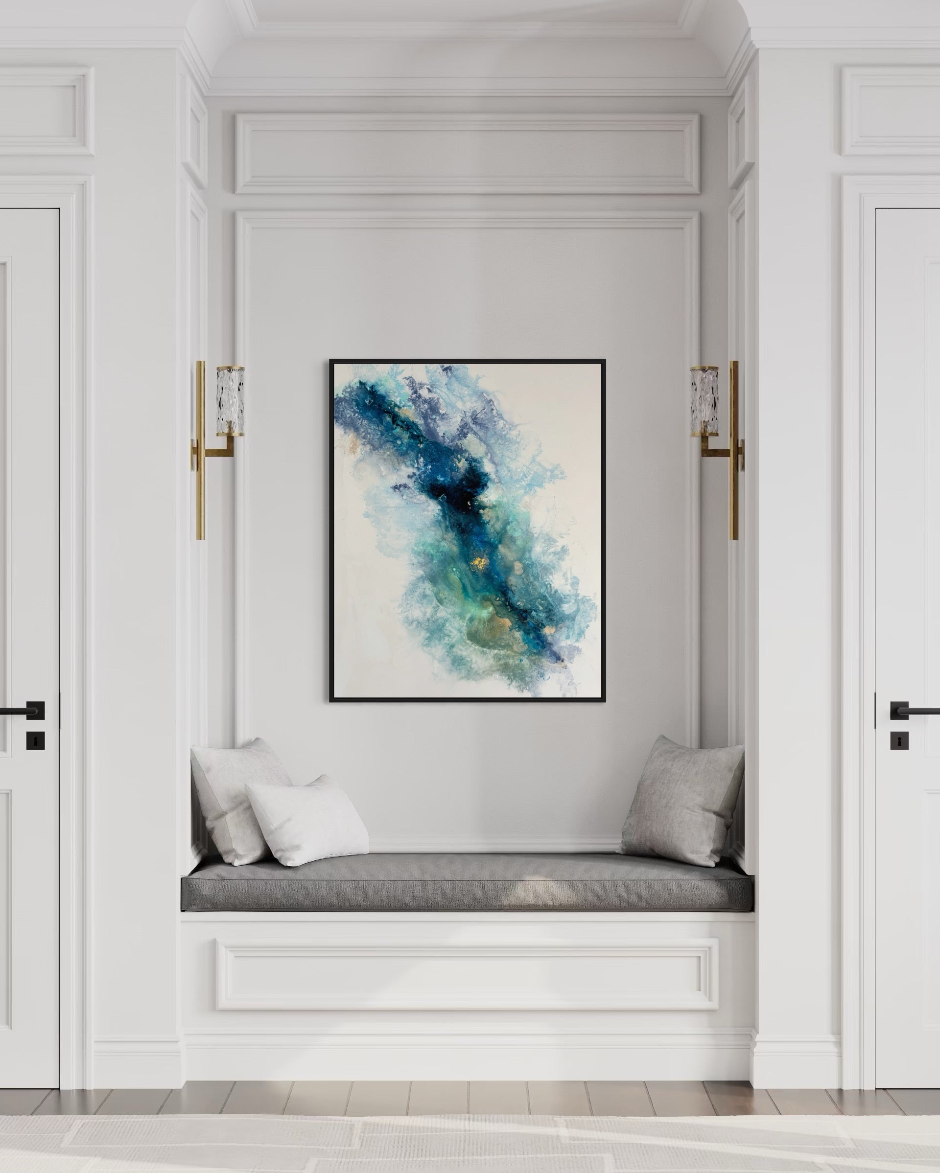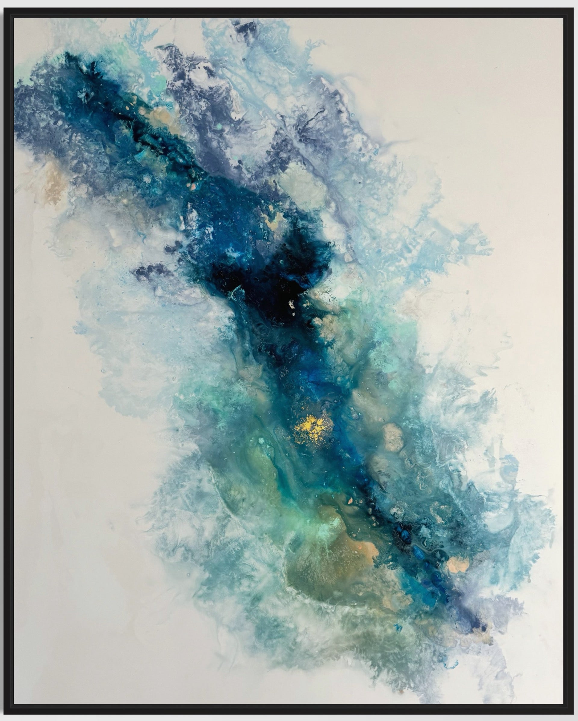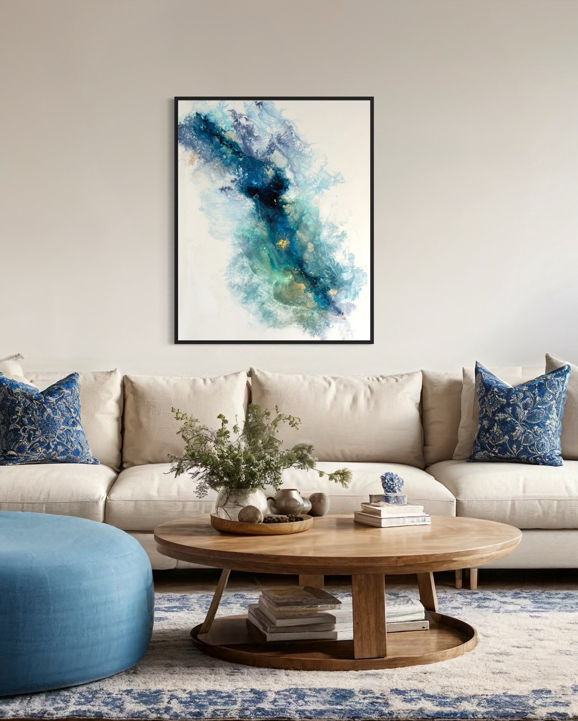 "Blue Breeze" brengt een harmonieuze mix van blauwe, groene en gouden accenten op het canvas. Met een afmeting van 100x80 cm en hoogwaardig vakmanschap is het een kunstwerk dat elegantie en rust in elke kamer brengt.