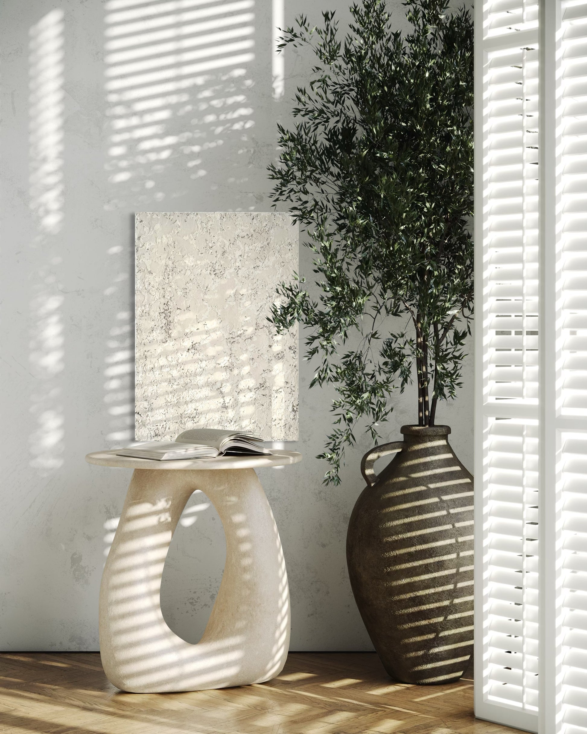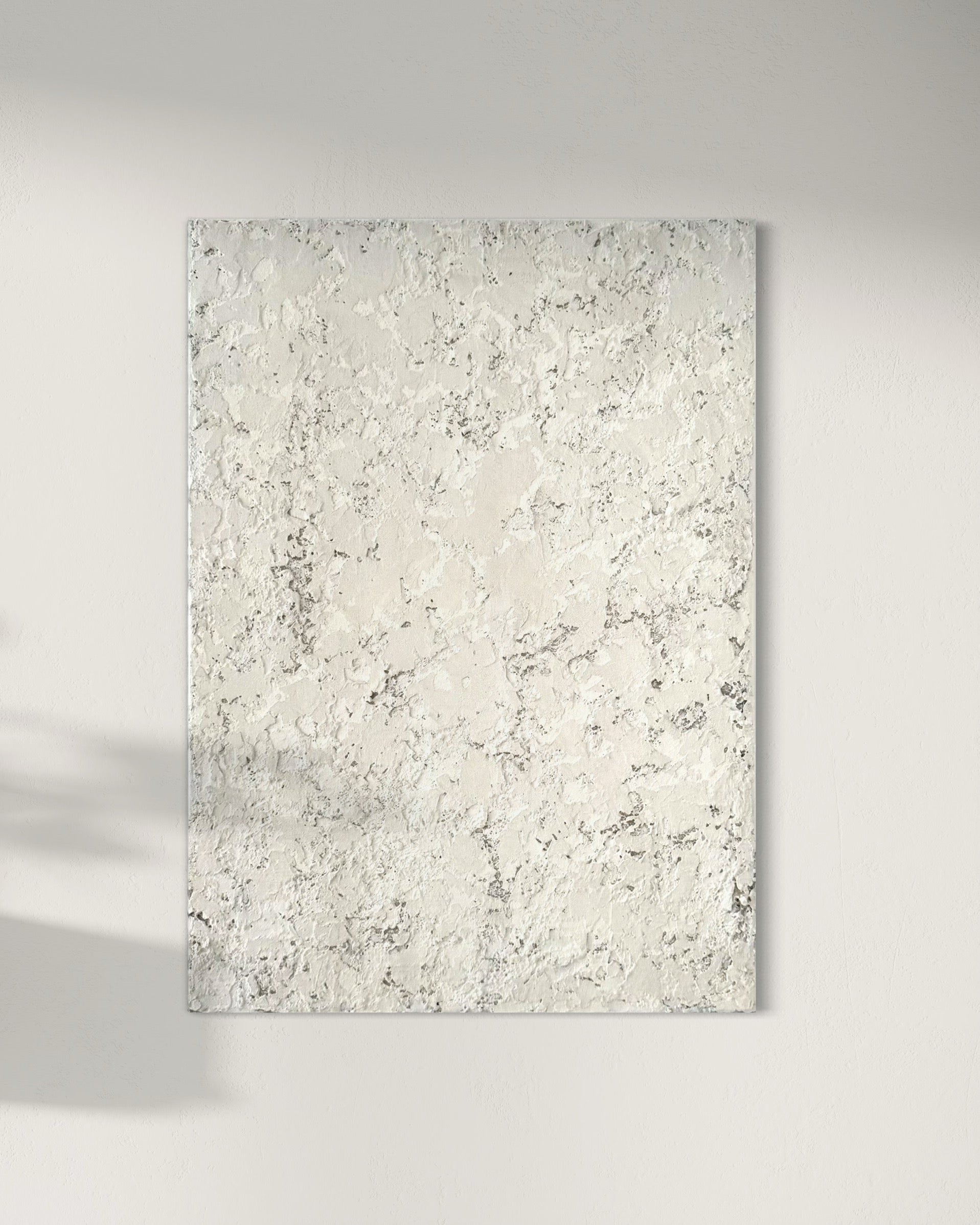 Dit abstracte kunstwerk (70x50 cm) belichaamt de schoonheid van imperfectie. De zachte, natuurlijke kleurnuances en organische textuur geven het beeld een kalme, harmonieuze uitstraling. Licht en schaduw spelen over het oppervlak en creëren een subtiele, meditatieve diepte.