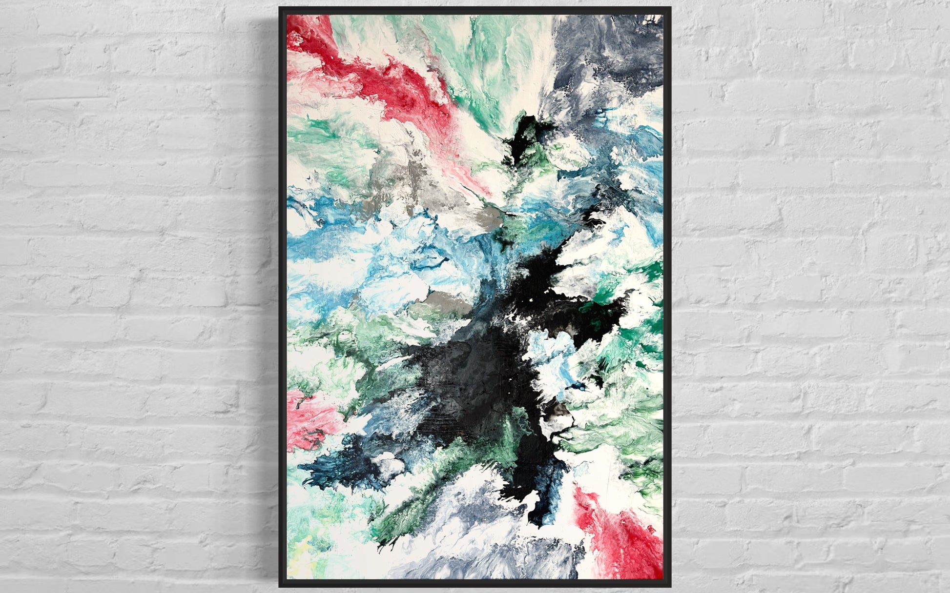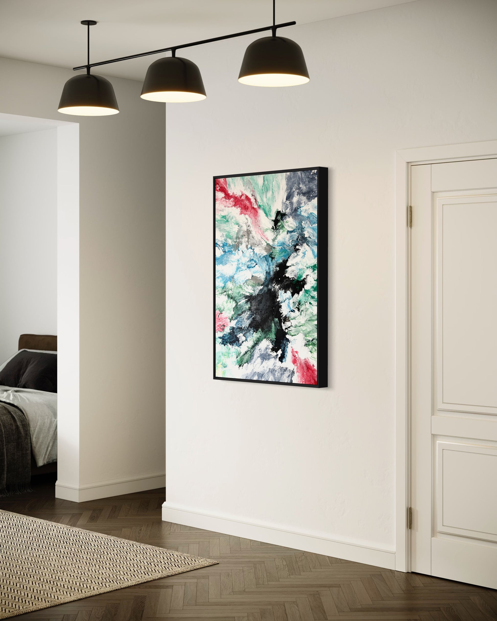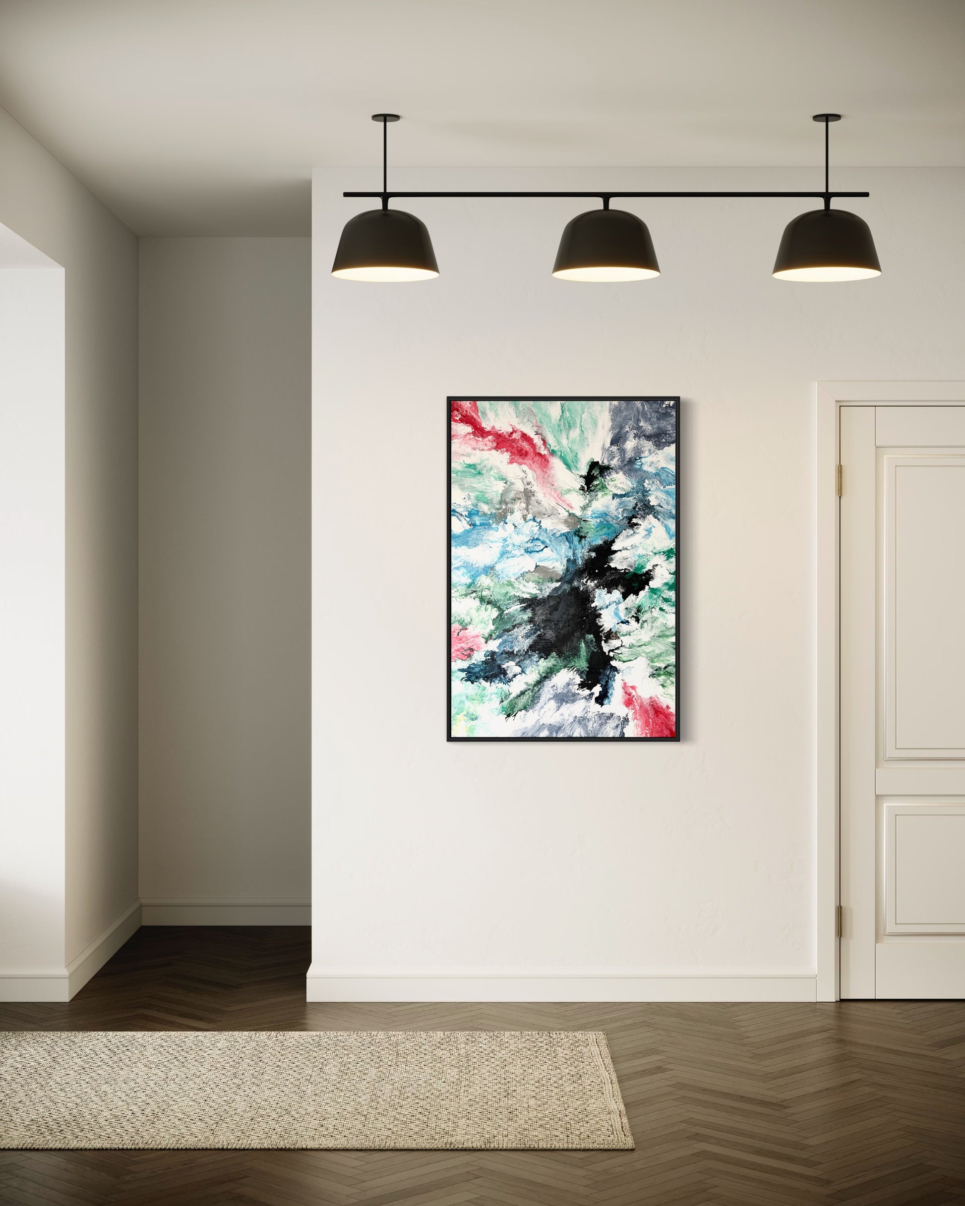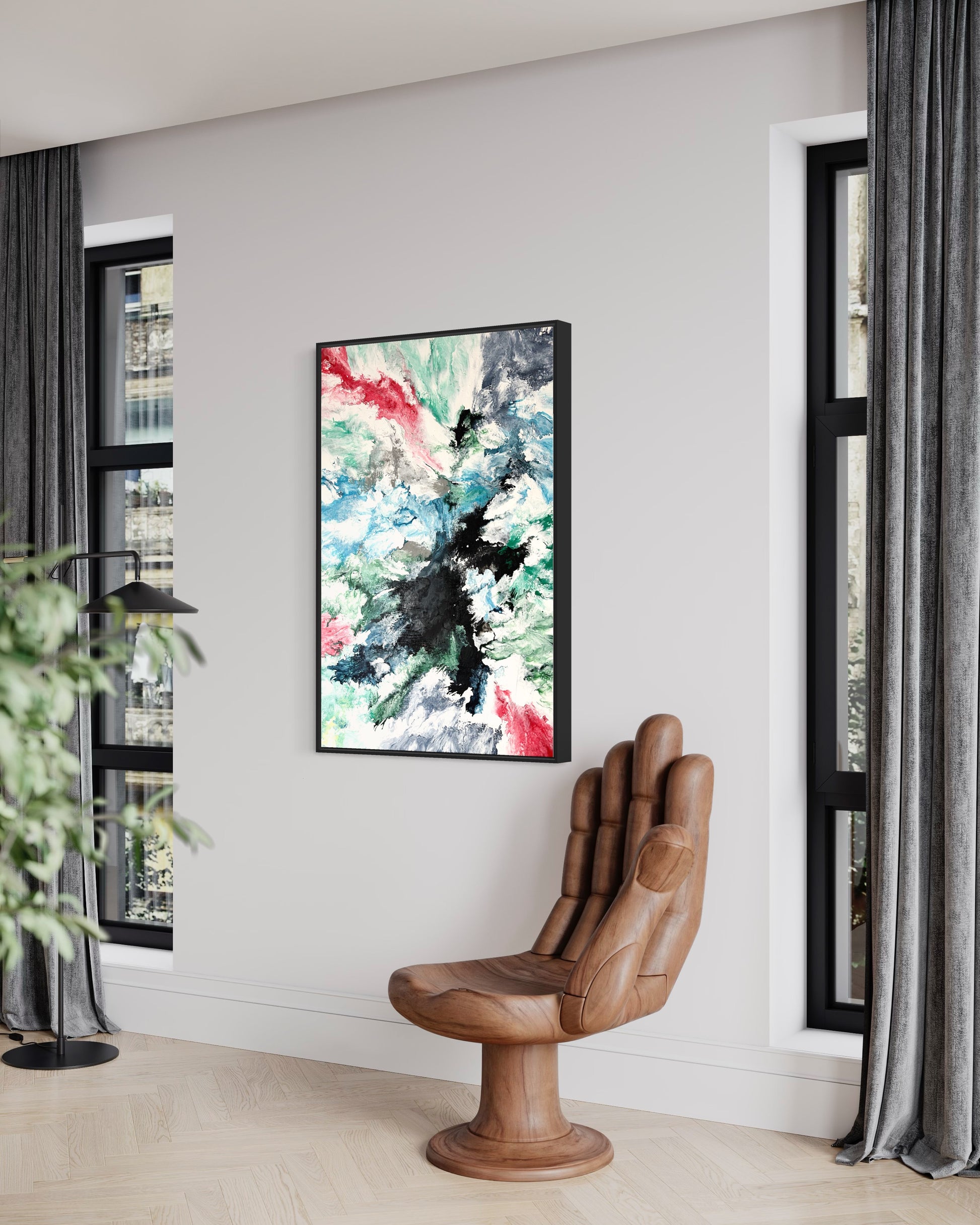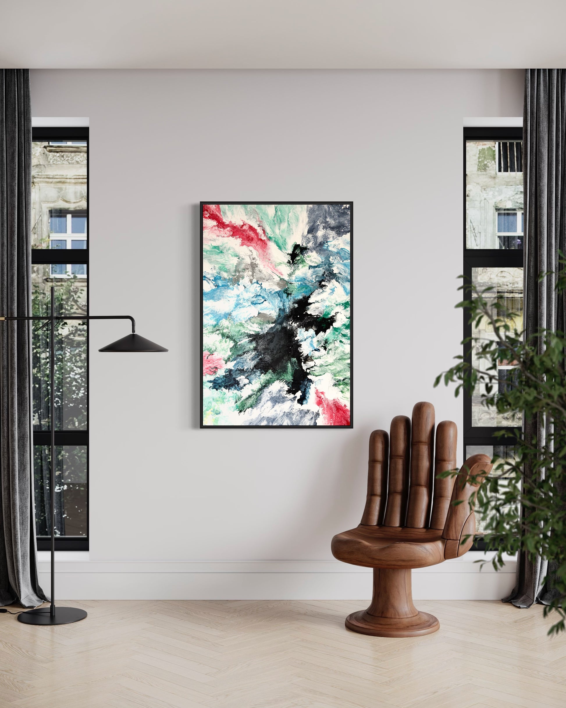 Ervaar de fascinerende harmonie van kleuren in mijn abstracte schilderij "Soulful". De vloeiende overgangen van blauw, wit, rood en groen versmelten tot een kunstwerk dat rust en helderheid uitstraalt.