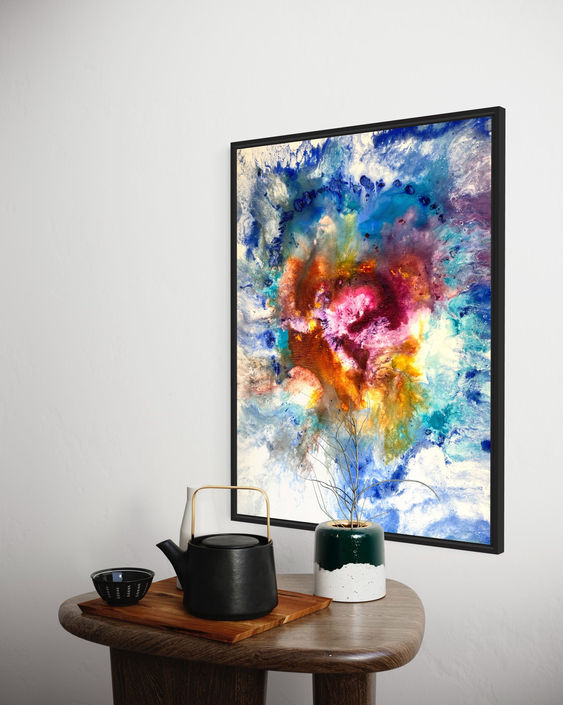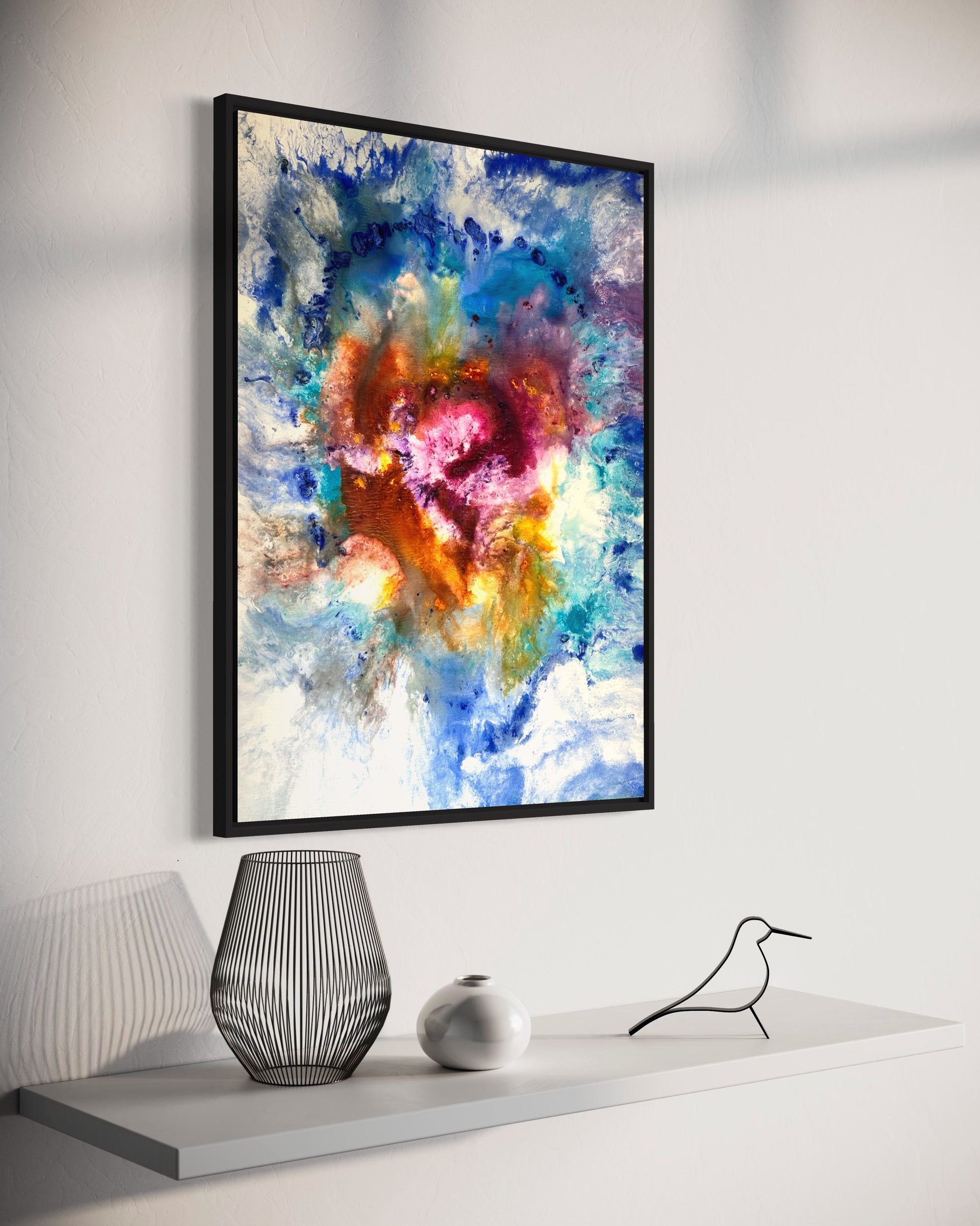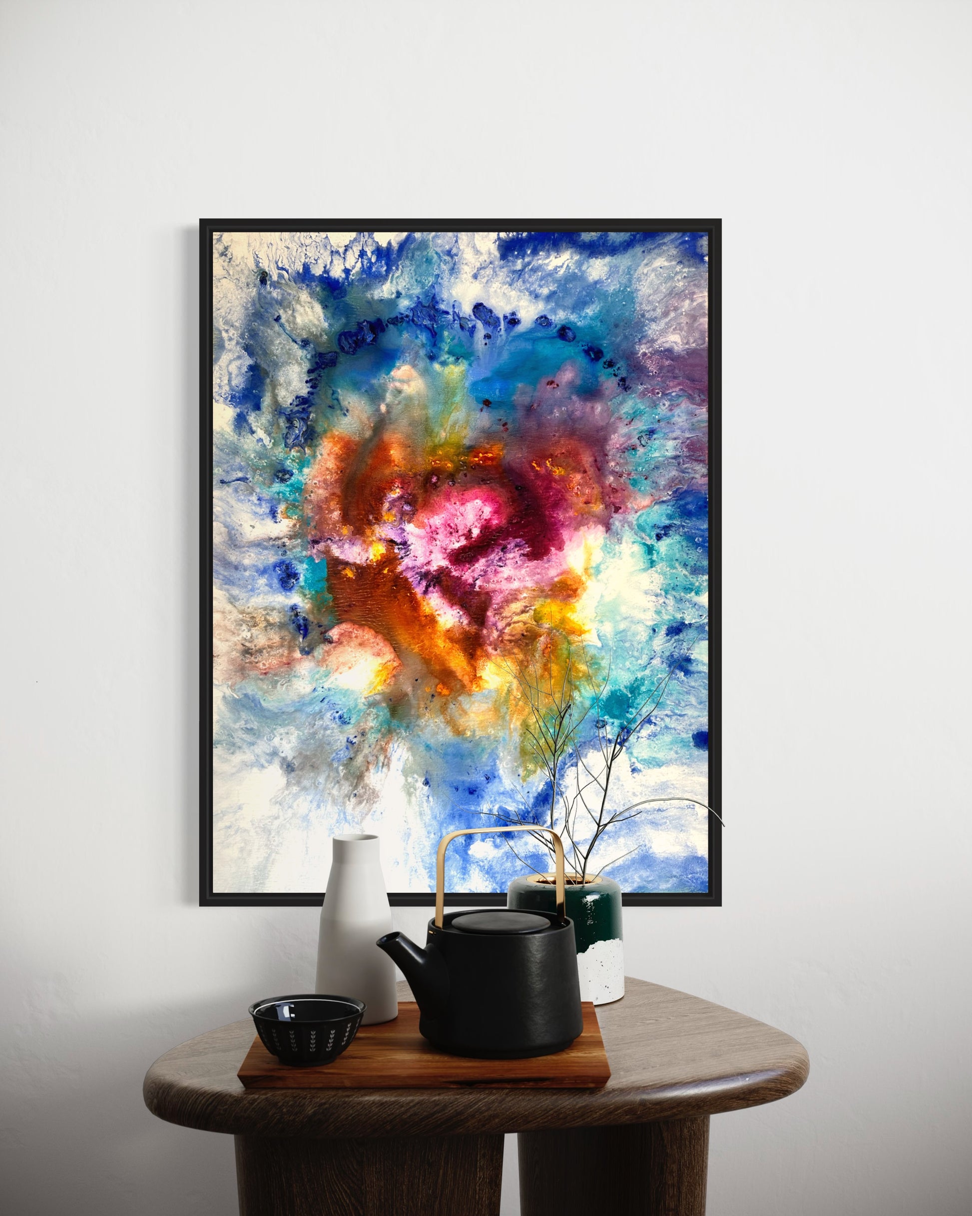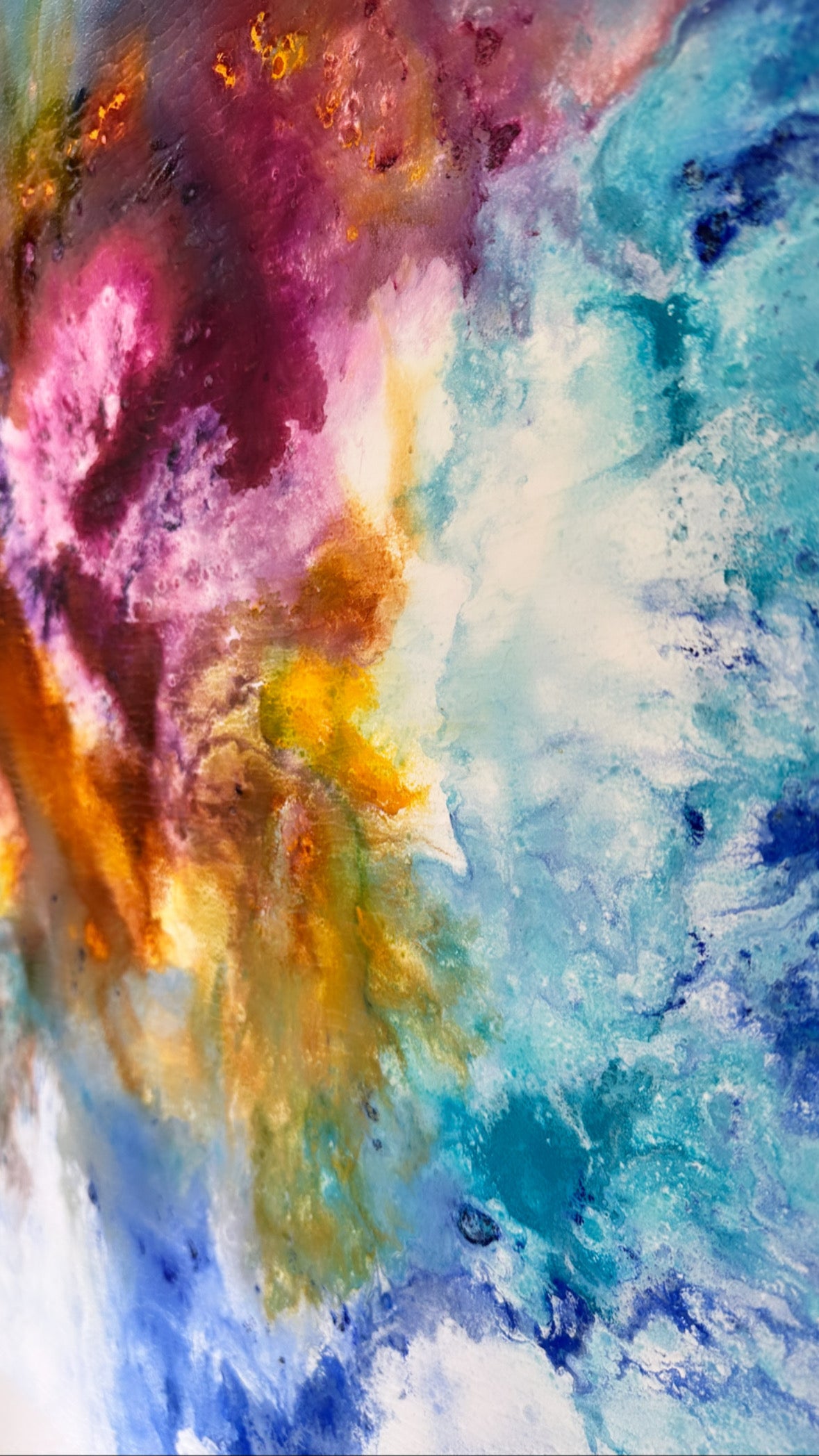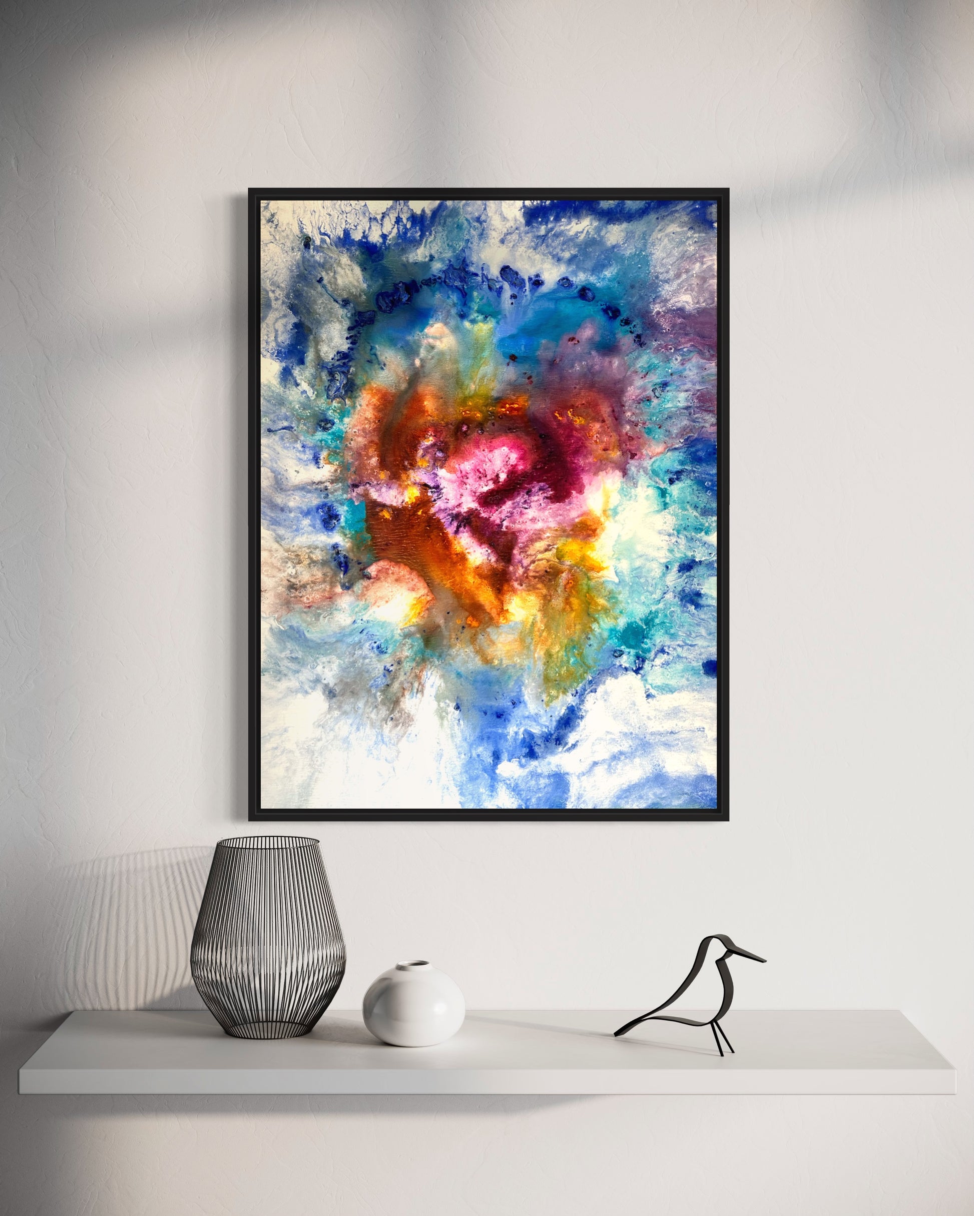 In het midden van dit schilderij rust een ronde bol die lijkt op het hart van een verre planeet. Verschillende tinten blauw dansen om hen heen en symboliseren de diepte en mysteries van de ruimte. Een vleugje paars/roze in het centrum geeft het beeld een mystieke uitstraling, terwijl het warme geel het idee oproept van een kosmische gebeurtenis, misschien wel een zonnestraal.