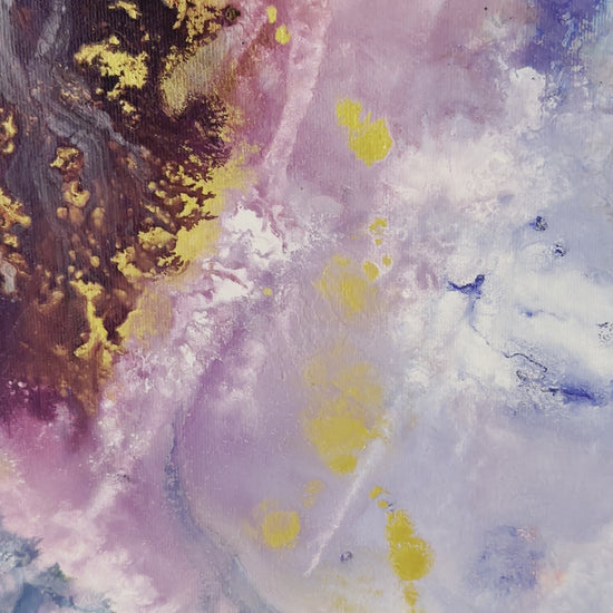 Ontdek "Gate" - Een fascinerend kunstwerk dat de grenzen van de verbeelding verlegt. In dit acrylschilderij van 80x80 cm smelten de kleuren donkerpaars, donkerblauw, paars, blauw, turkoois en een overvloed aan goud samen tot een harmonieuze symfonie die het oog verleidt en de ziel raakt.