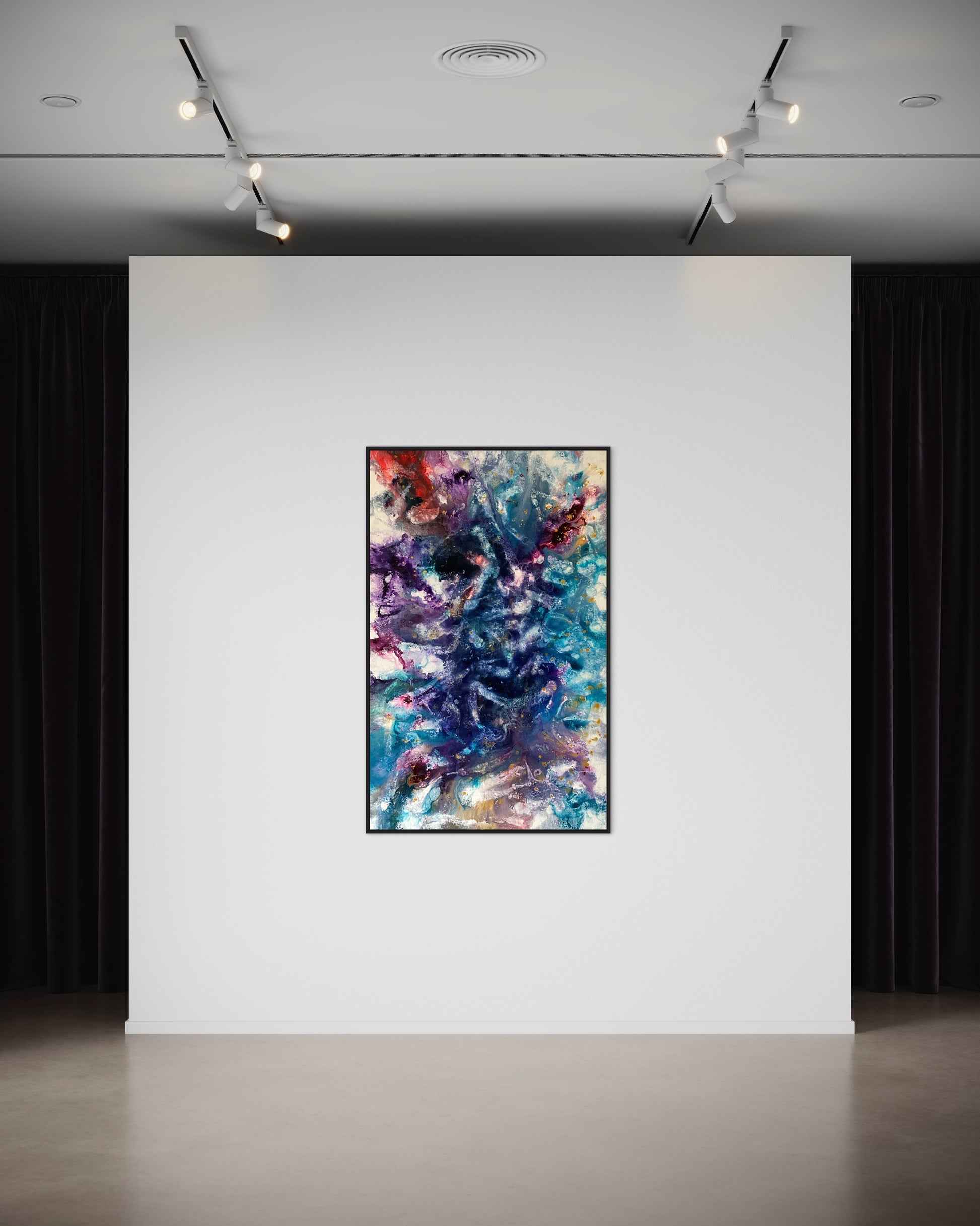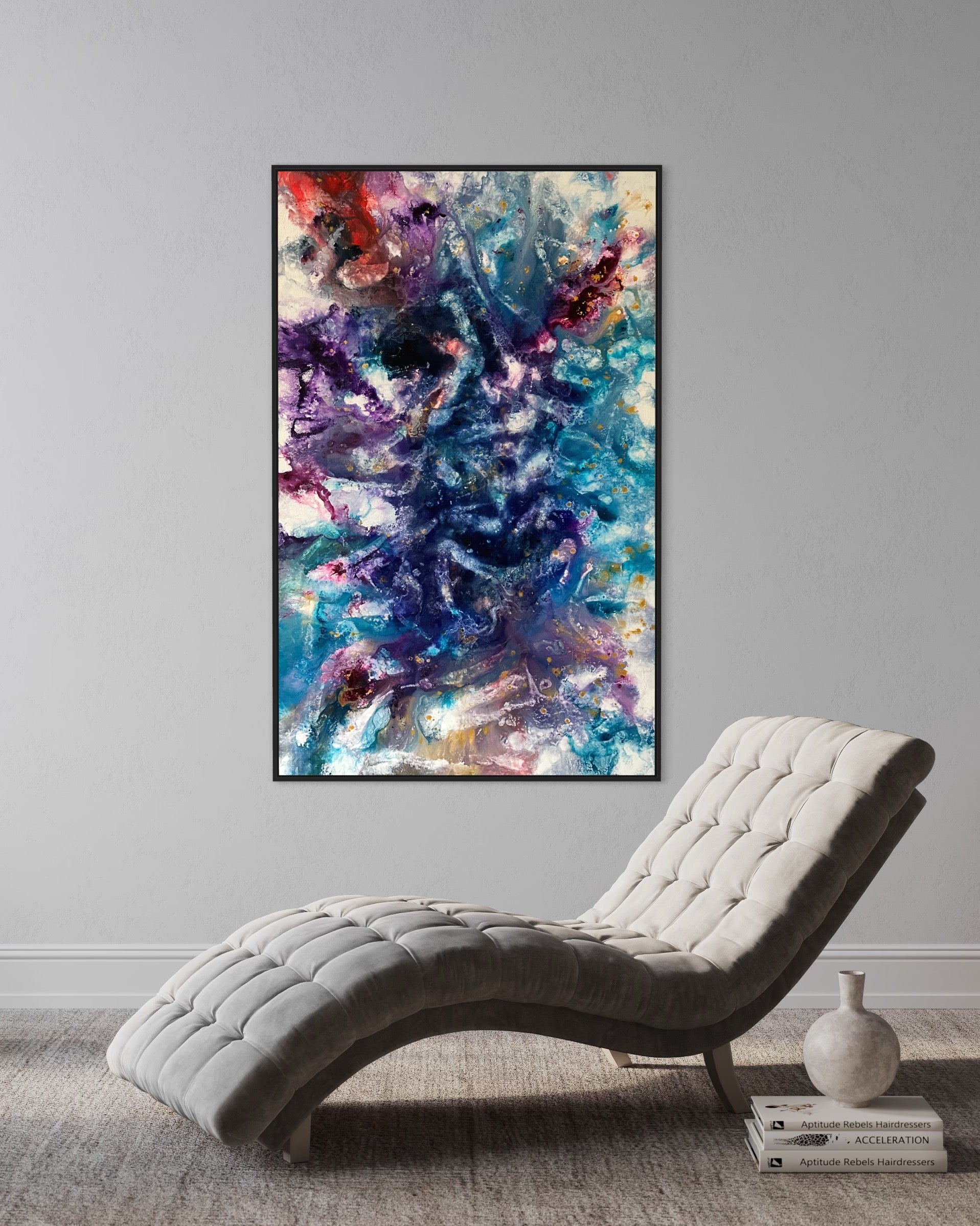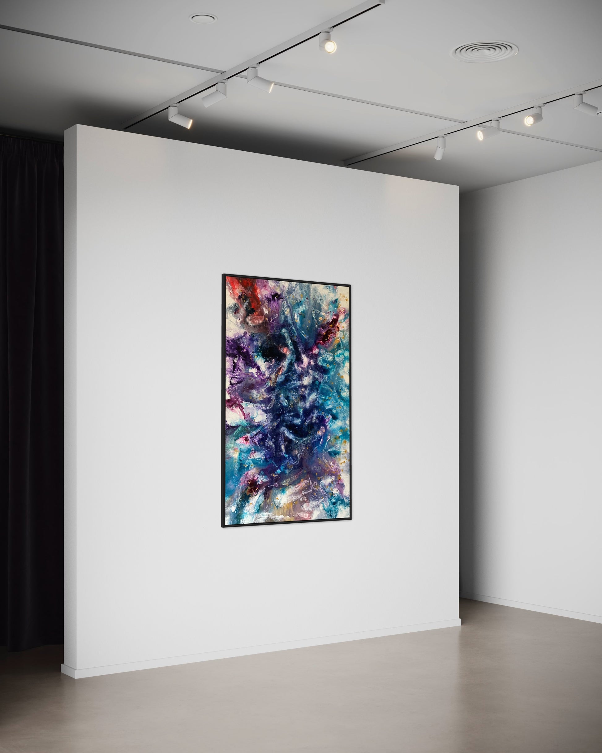 In dit kunstwerk versmelten intense blauwe en paarse tinten met vleugjes goud en wit om een fascinerend kleurenspel te creëren dat lijkt op een artistiek labyrint. De kleuren vloeien in verwarrende patronen en golven door het schilderij en elke bezichtiging onthult nieuwe geheimen.