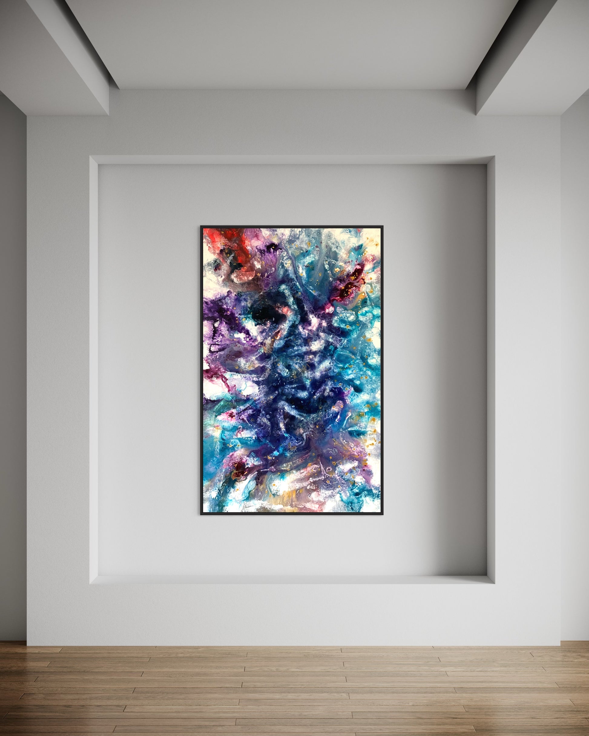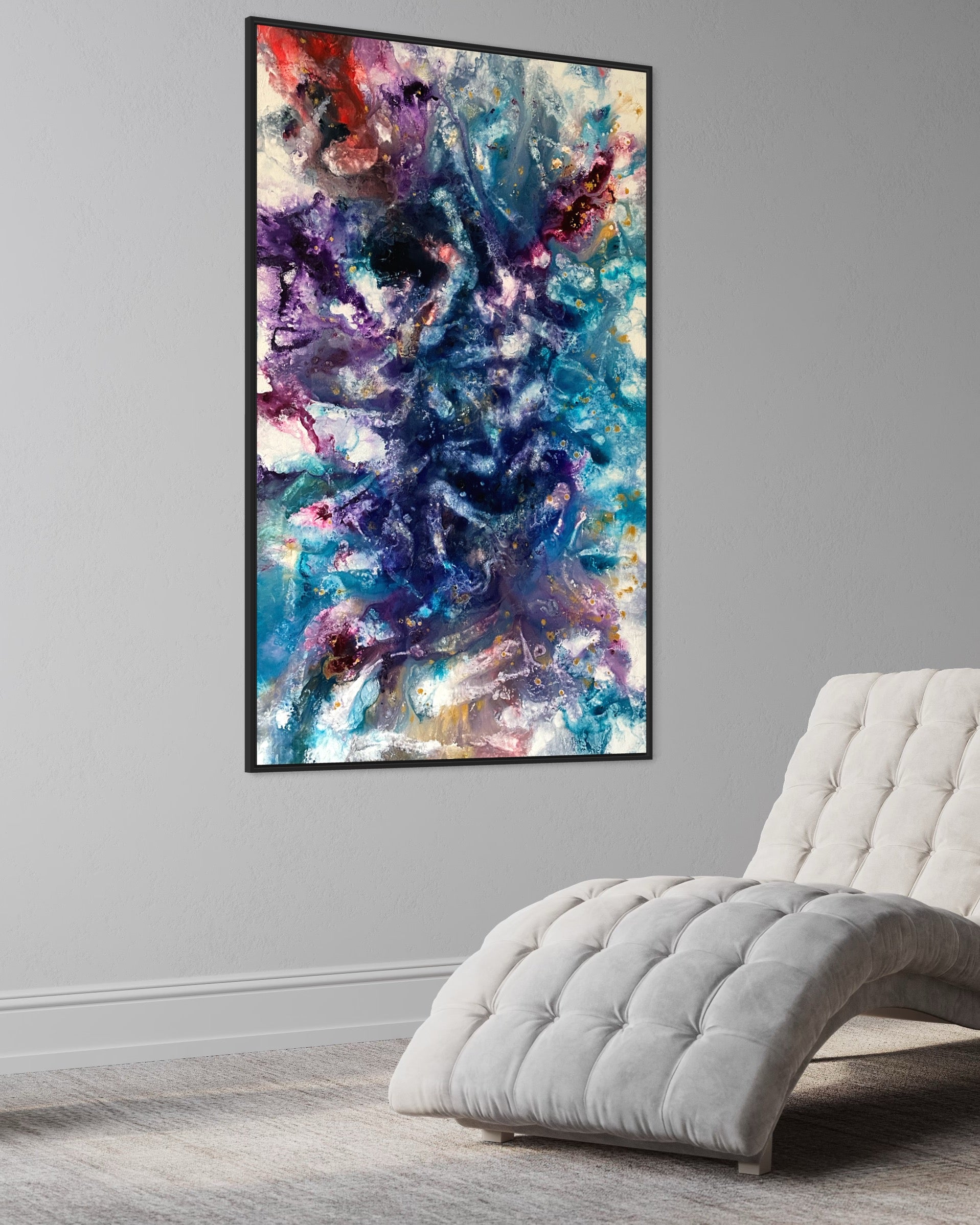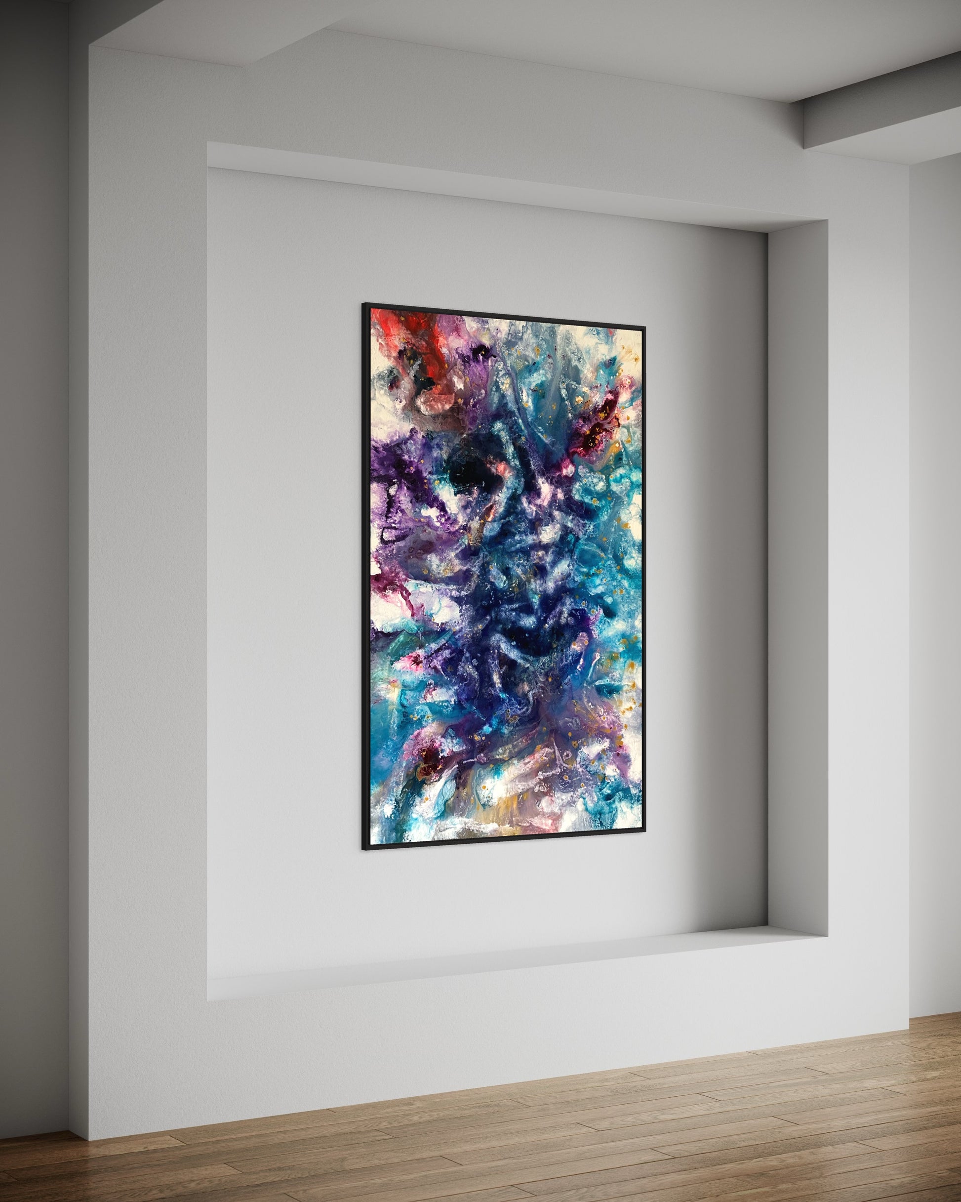 In dit kunstwerk versmelten intense blauwe en paarse tinten met vleugjes goud en wit om een fascinerend kleurenspel te creëren dat lijkt op een artistiek labyrint. De kleuren vloeien in verwarrende patronen en golven door het schilderij en elke bezichtiging onthult nieuwe geheimen.