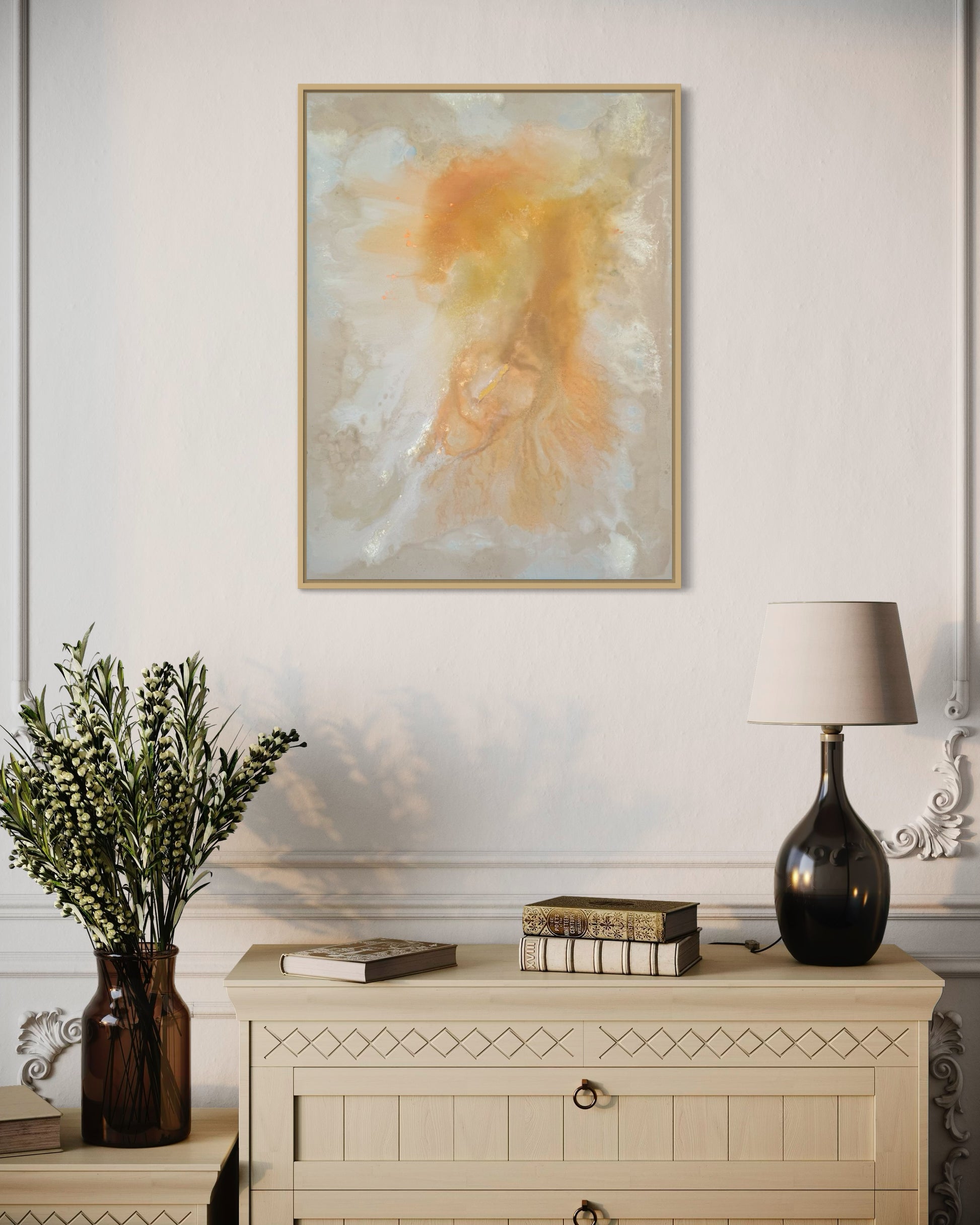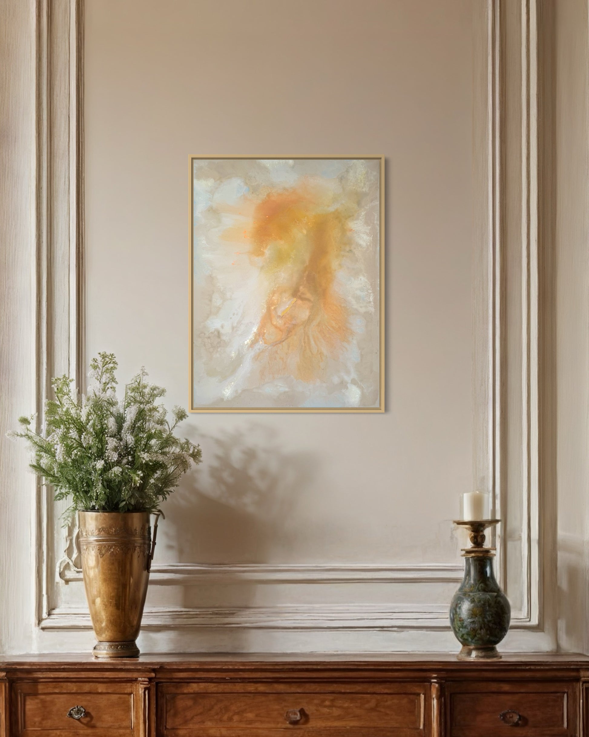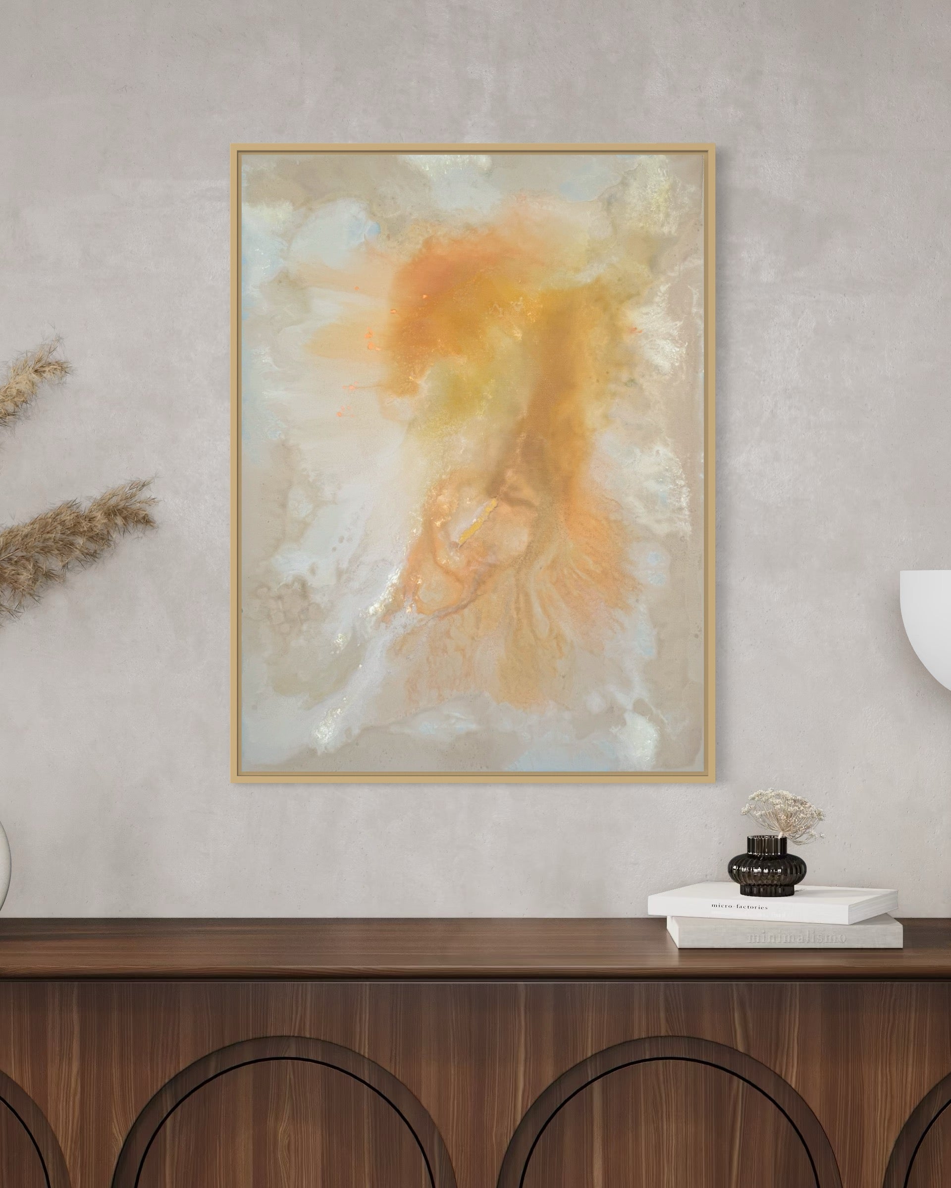 "Evening Glow" fängt die warmen, sanften Farben eines ruhigen Abends ein und verleiht jedem Raum eine entspannte Atmosphäre. Mit einer Größe von 80x60 cm bietet dieses Acrylgemälde harmonische Farbübergänge und eine weiche Struktur, die beruhigend wirkt. Das Werk wird mit einem eleganten Rahmen geliefert und ist direkt bereit zum Aufhängen.