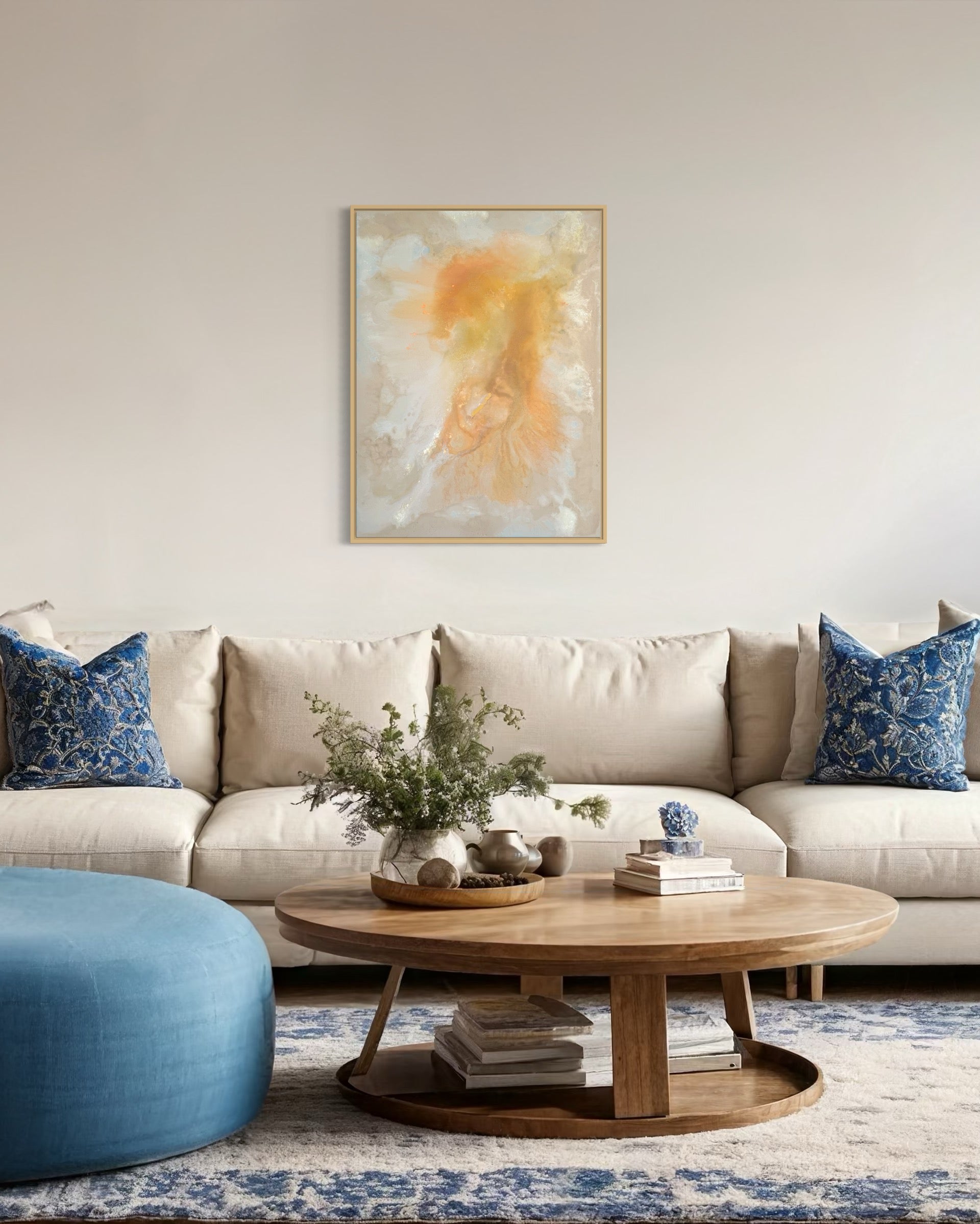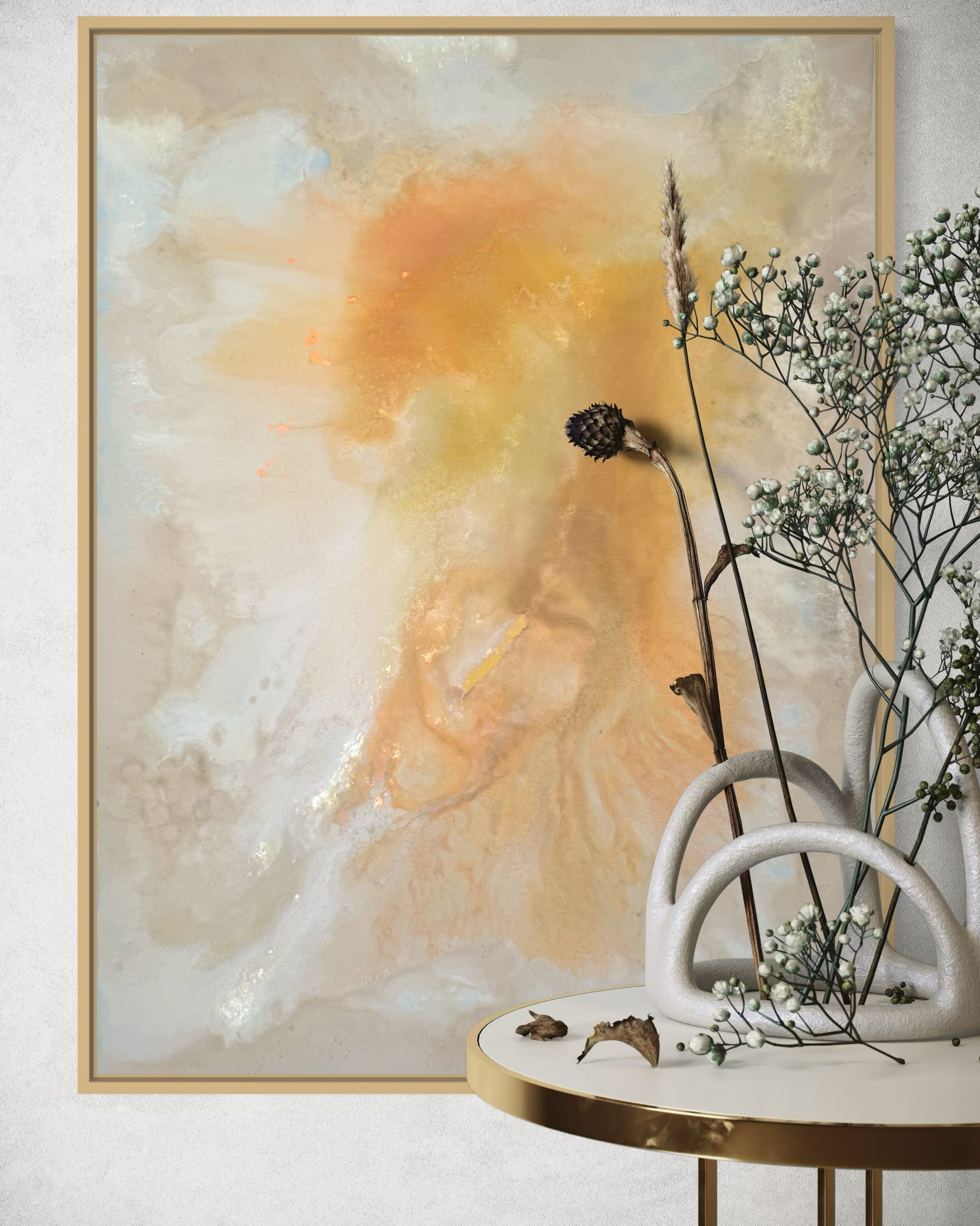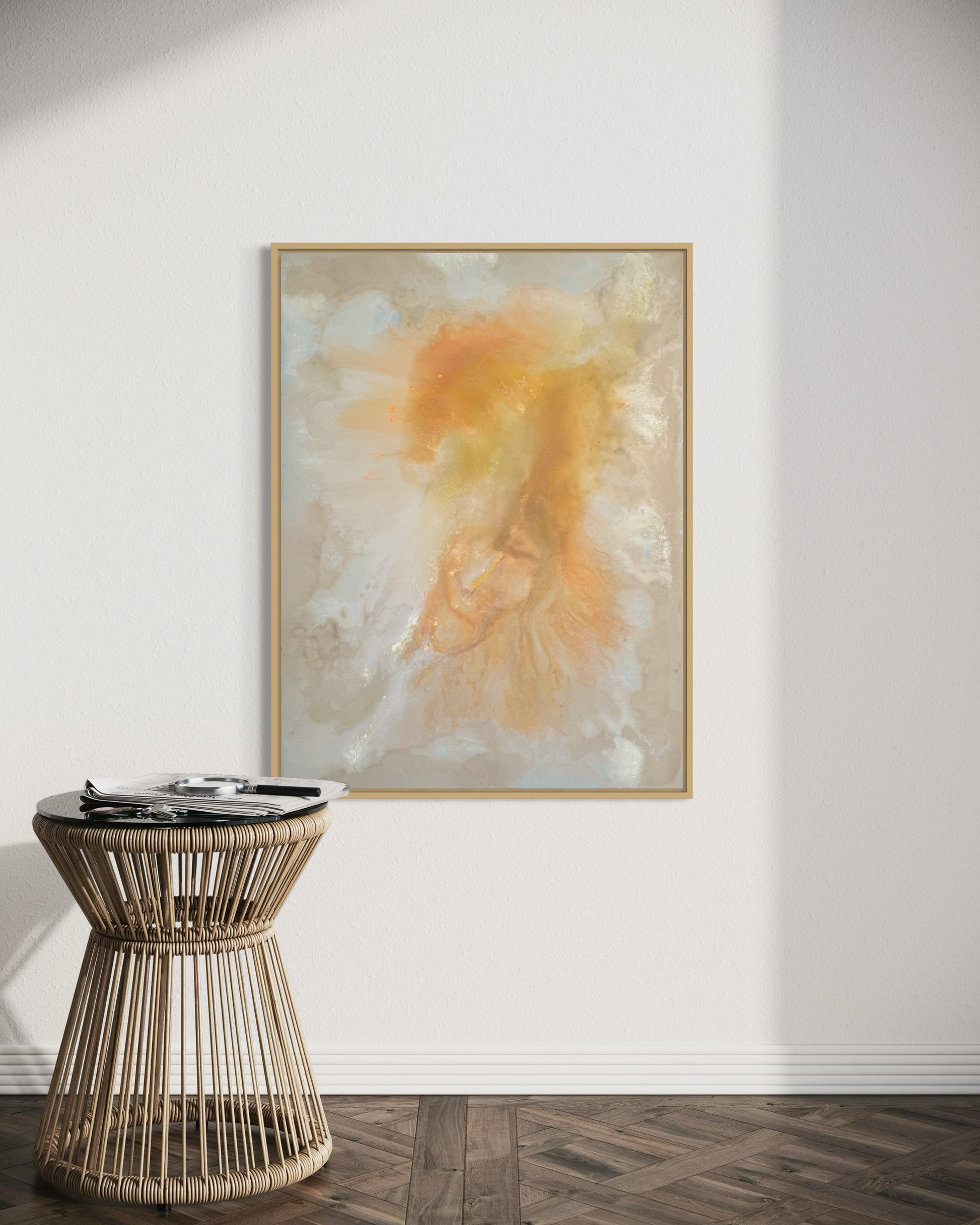 "Evening Glow" fängt die warmen, sanften Farben eines ruhigen Abends ein und verleiht jedem Raum eine entspannte Atmosphäre. Mit einer Größe von 80x60 cm bietet dieses Acrylgemälde harmonische Farbübergänge und eine weiche Struktur, die beruhigend wirkt. Das Werk wird mit einem eleganten Rahmen geliefert und ist direkt bereit zum Aufhängen.