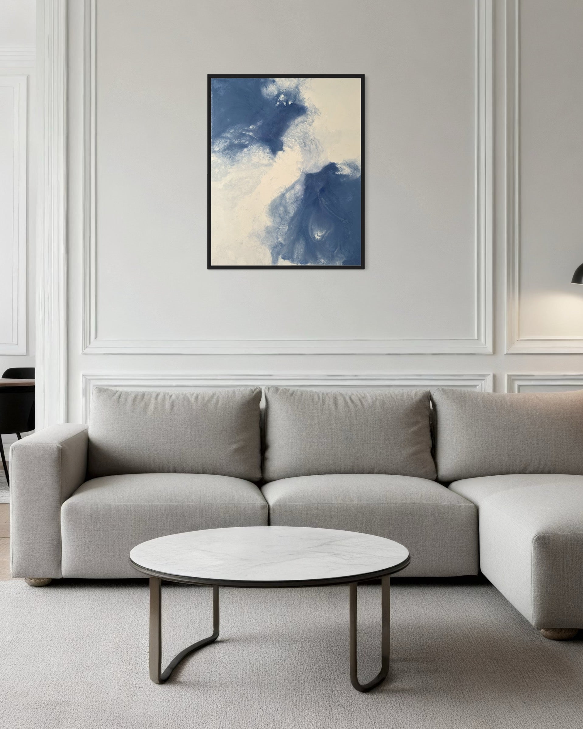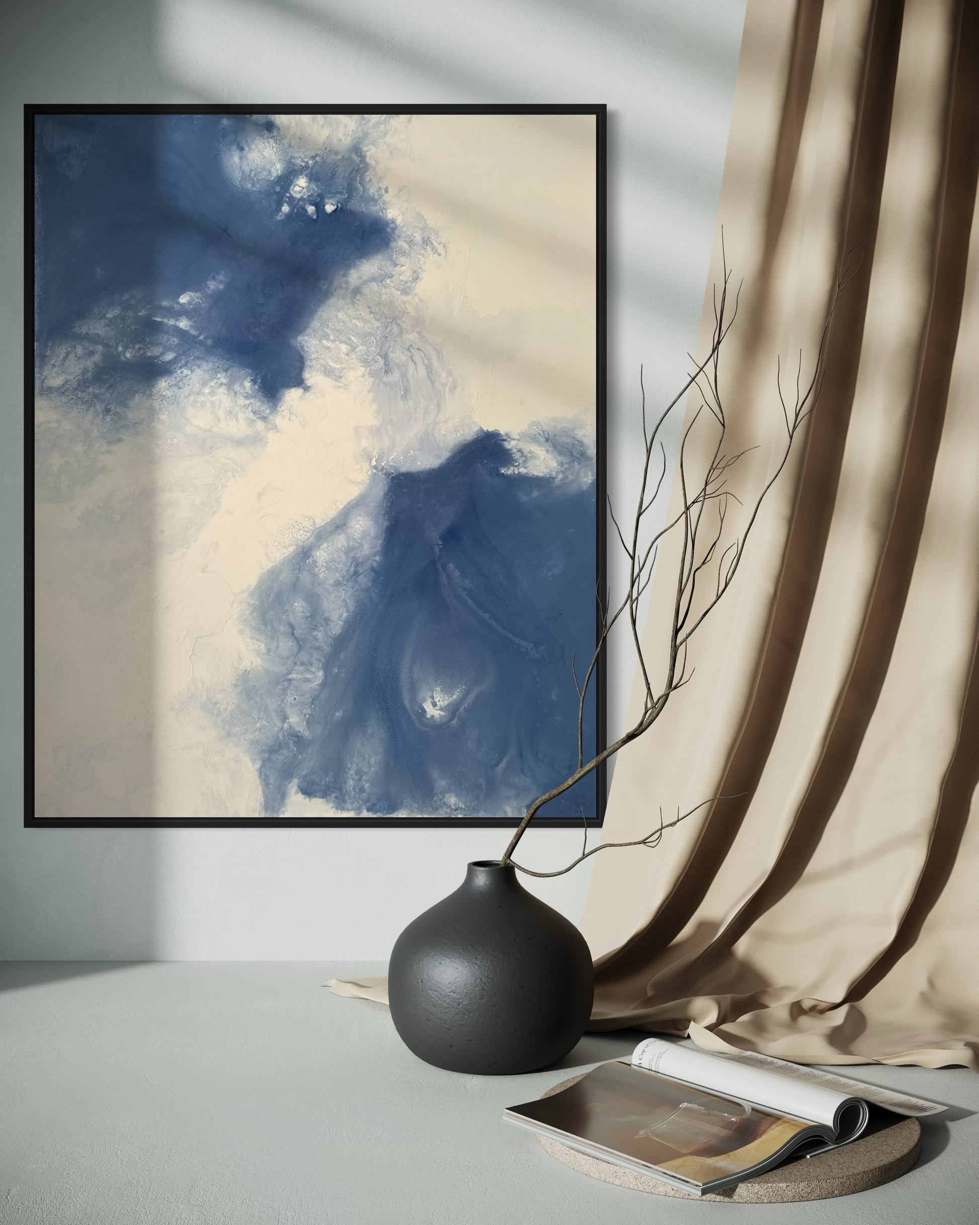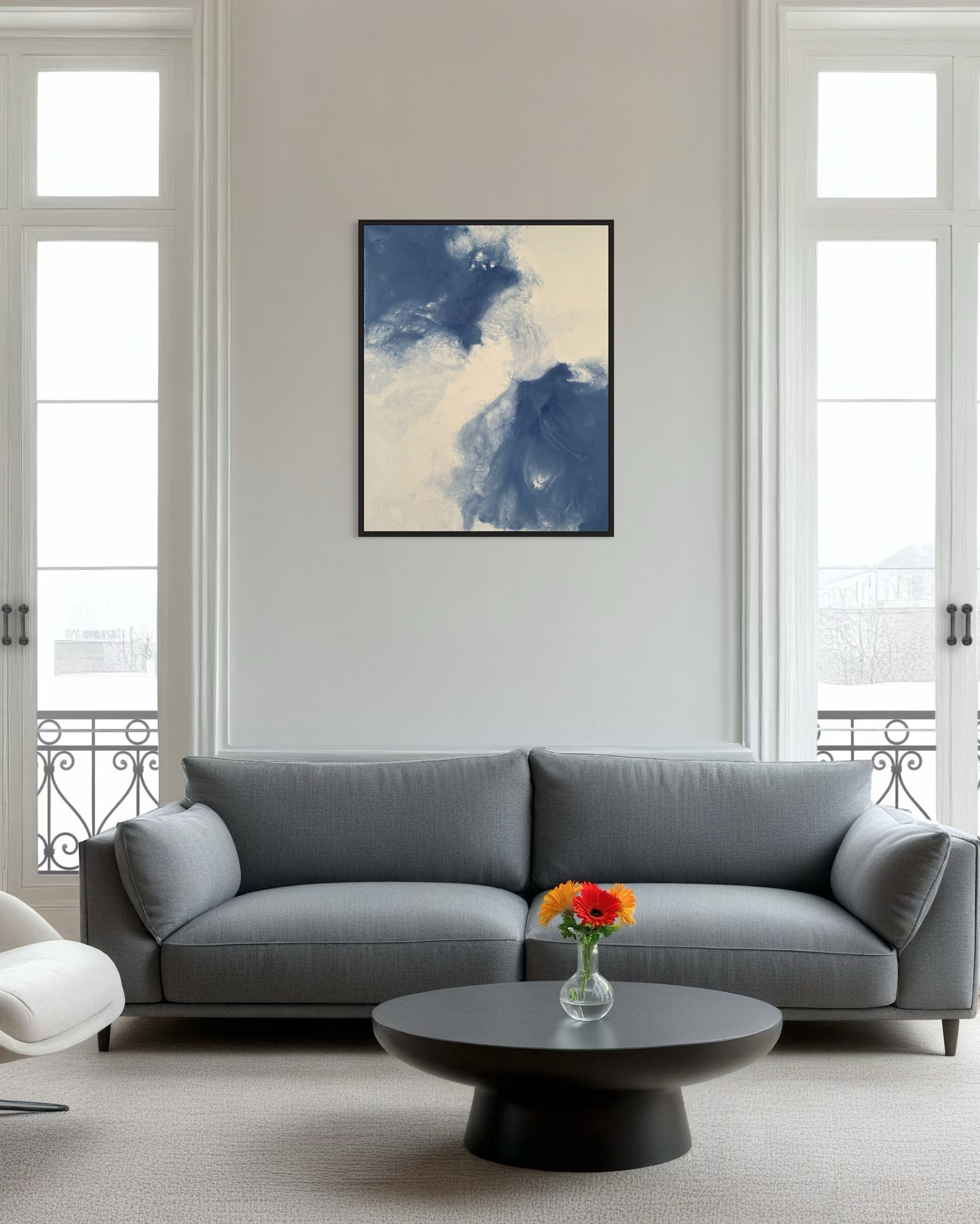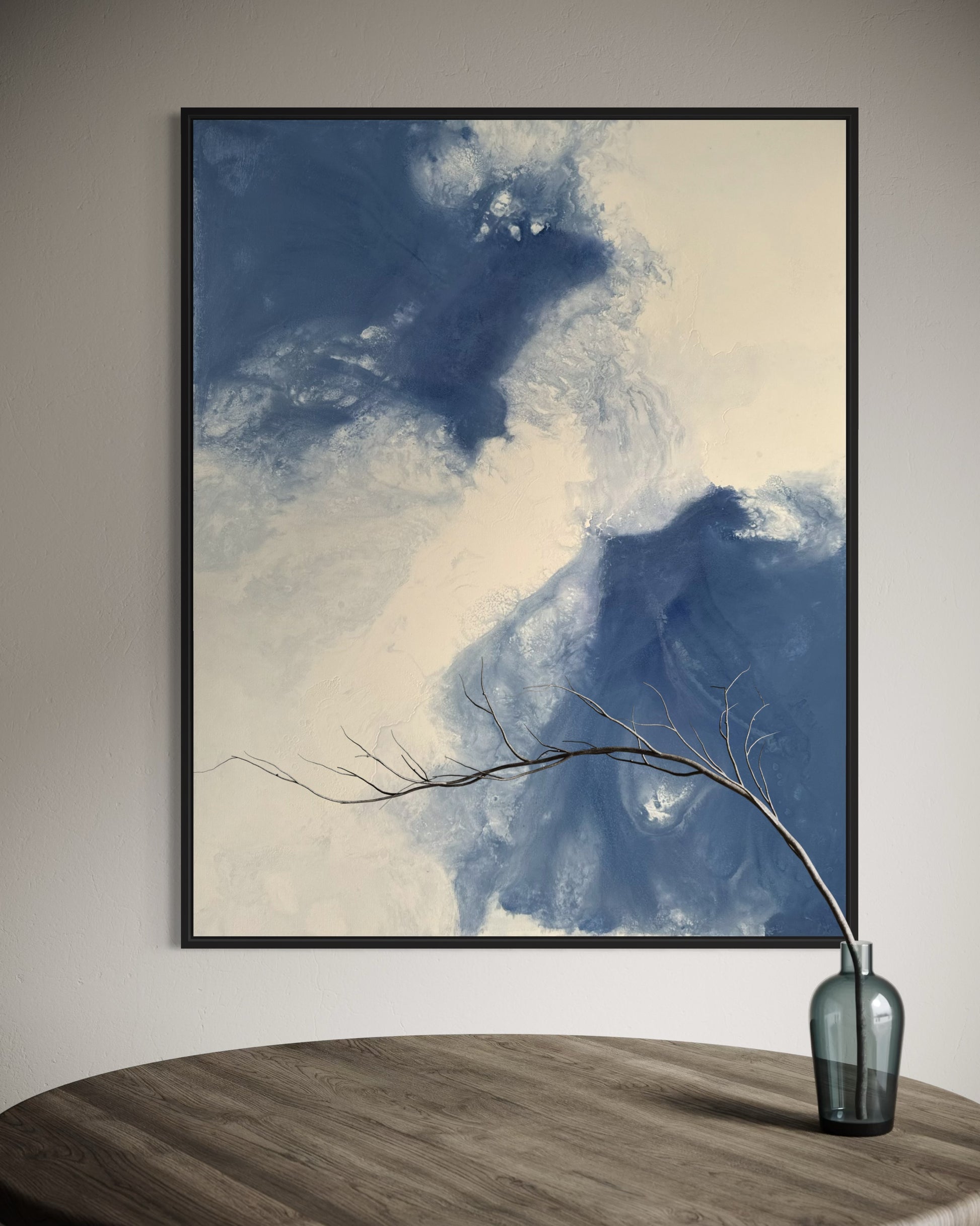 Only a Moment ist ein Acrylbild in Blau und Weiß – reduziert, ruhig und offen. Es steht für die stillen Zwischenräume im Alltag. Für Augenblicke, in denen scheinbar nichts geschieht, und doch eine Veränderung spürbar wird.
