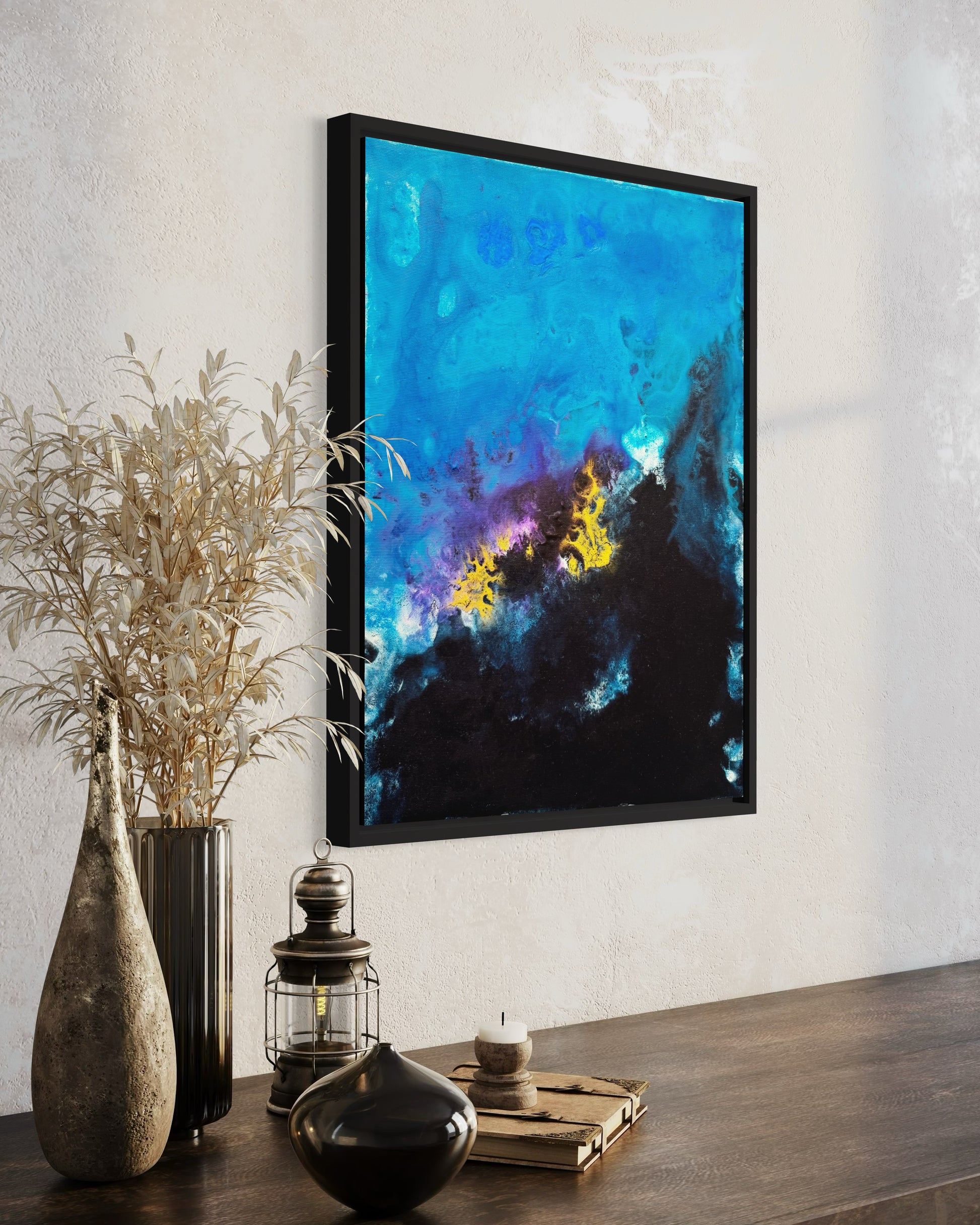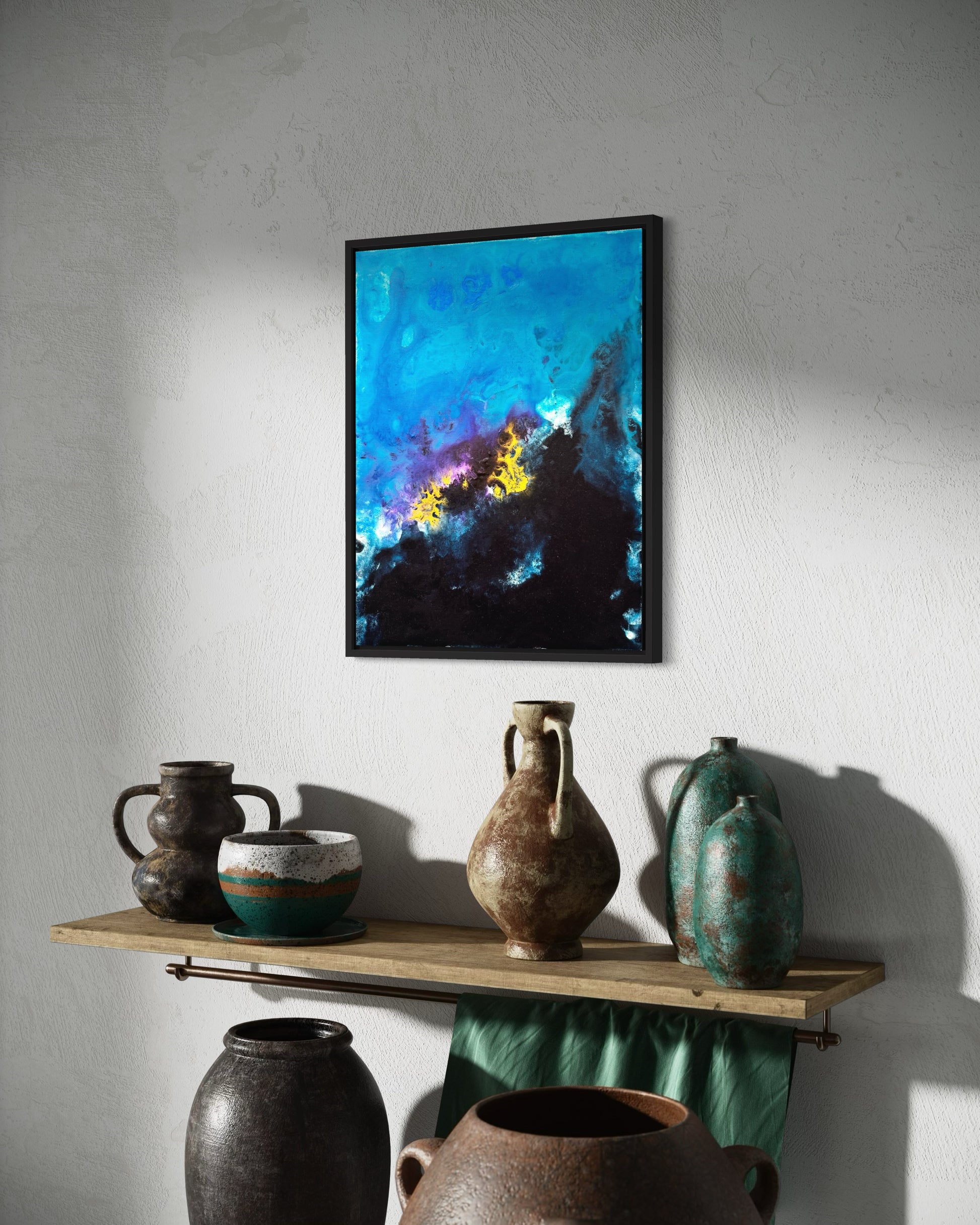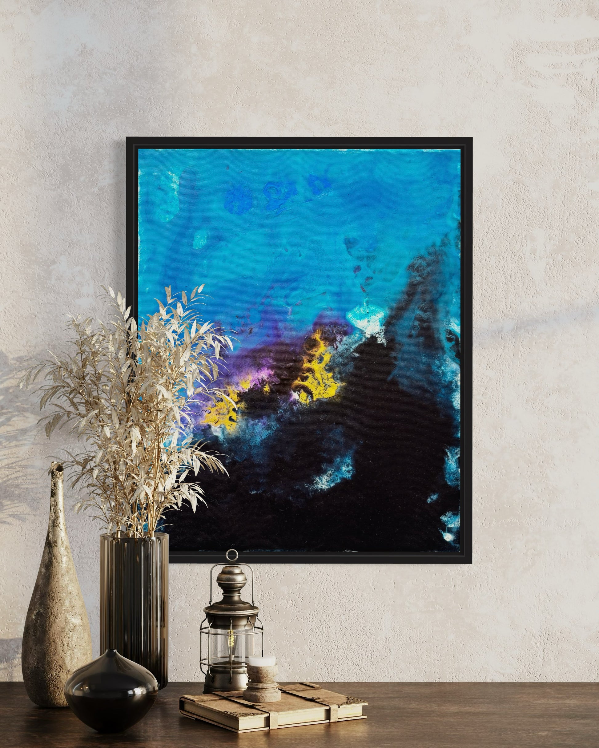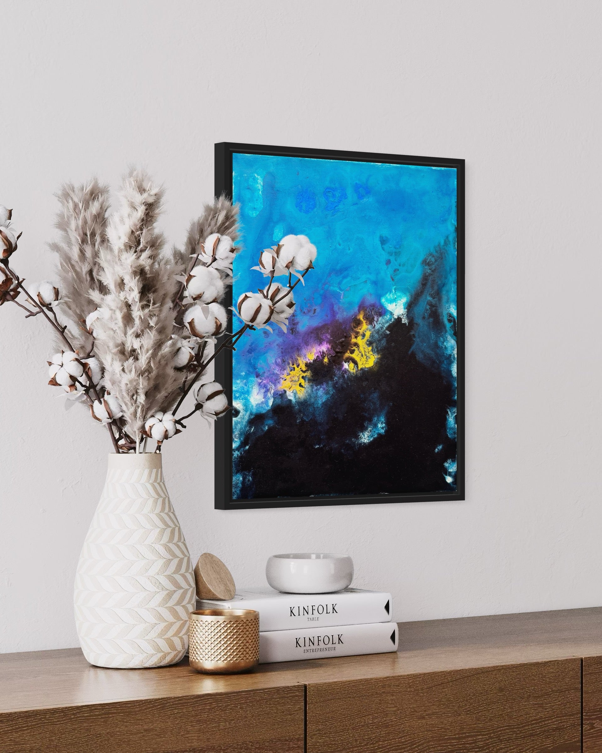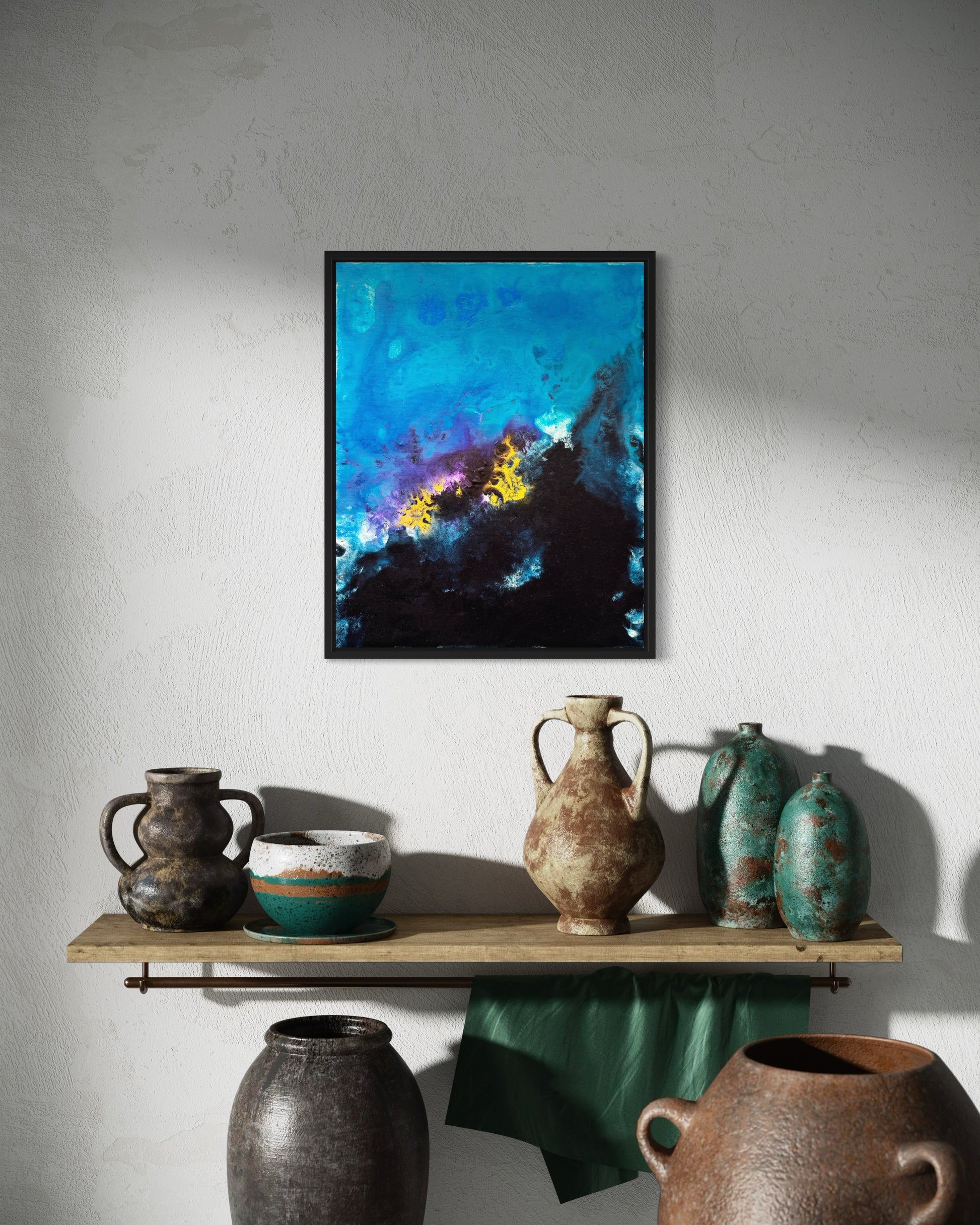 Das Bild misst 50x40 cm und wurde mit hochwertigen Acrylfarben auf Leinwand geschaffen. Es wird in einem eleganten schwarzen Rahmen geliefert, der die lebhaften Farben perfekt zur Geltung bringt und dir die Möglichkeit bietet, es sofort aufzuhängen.
