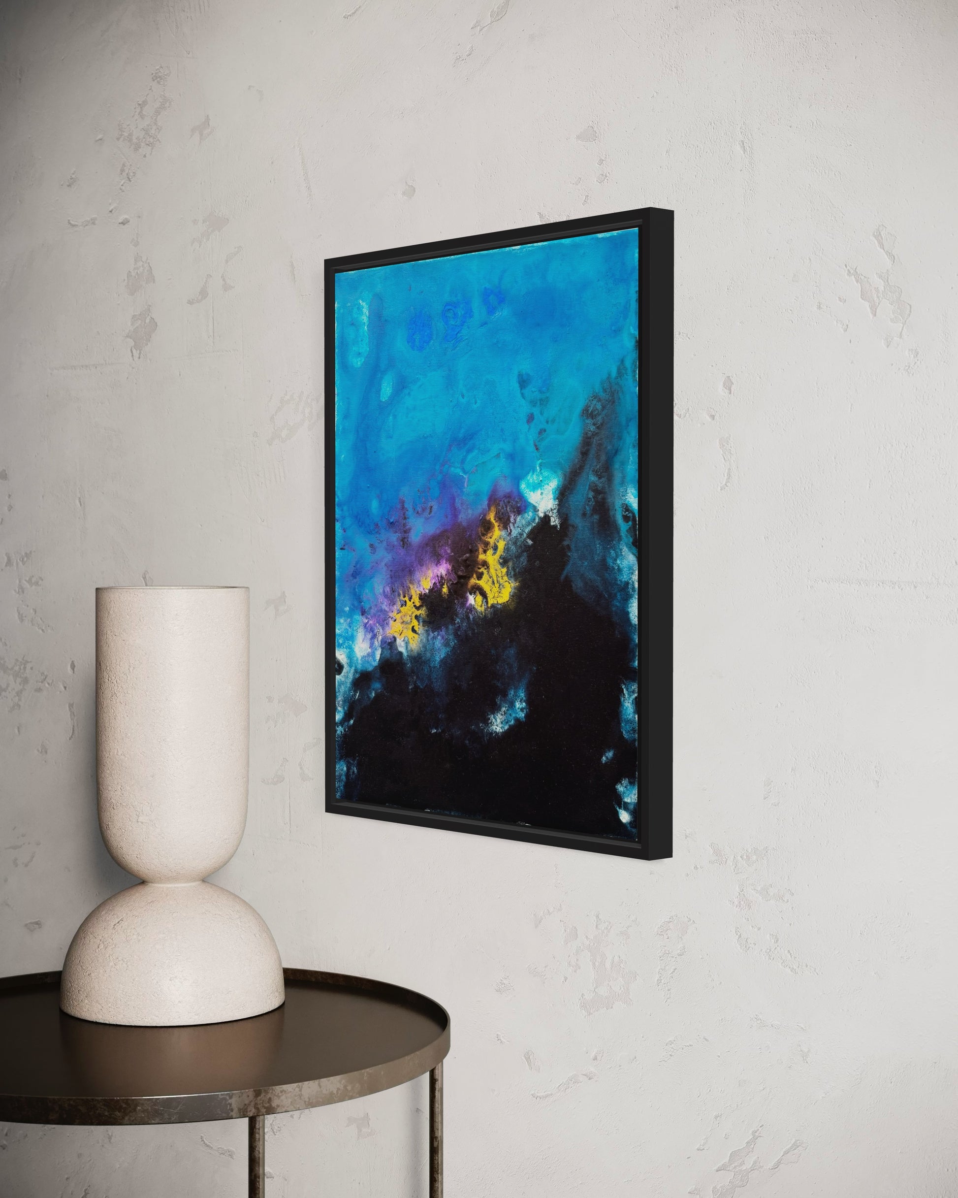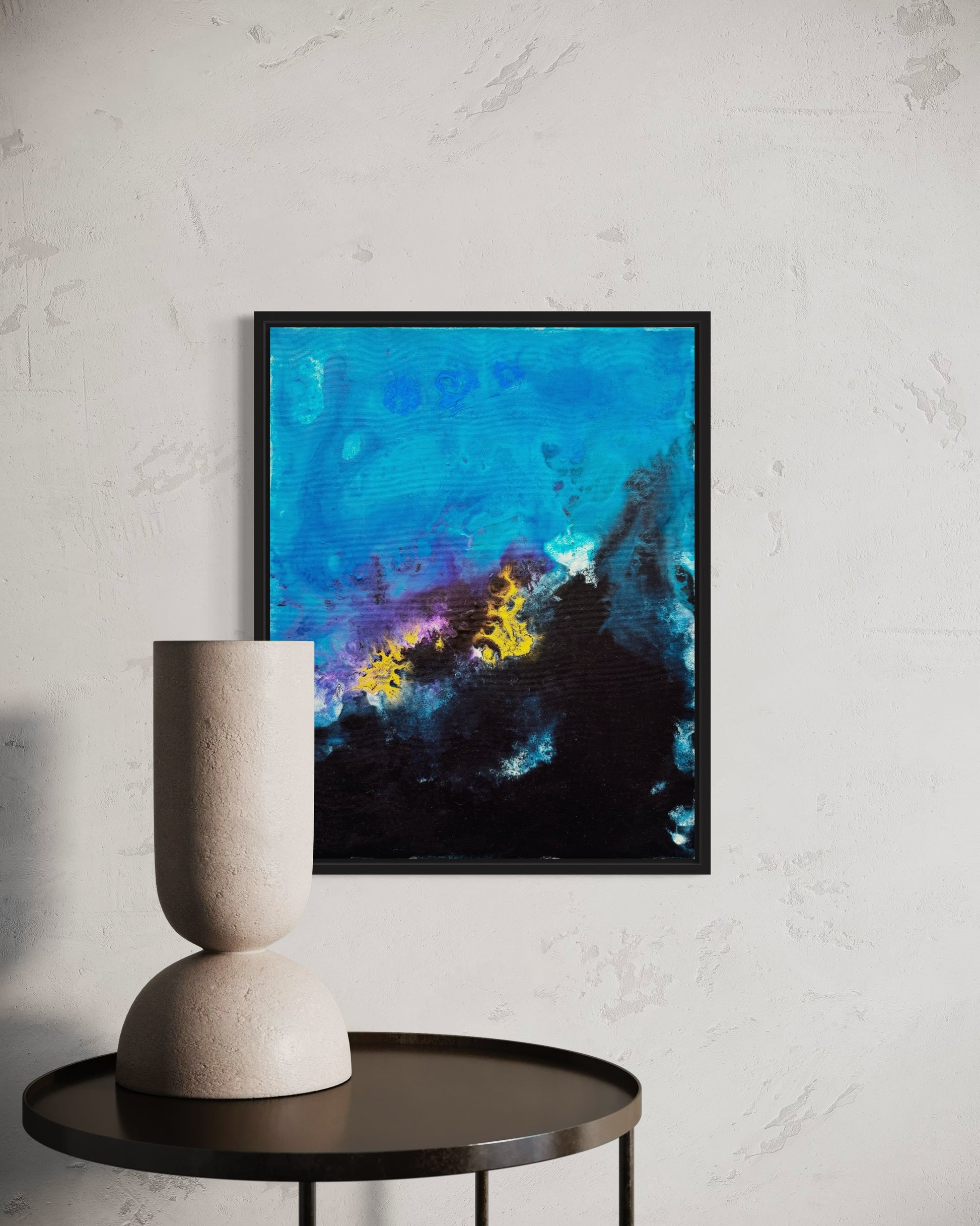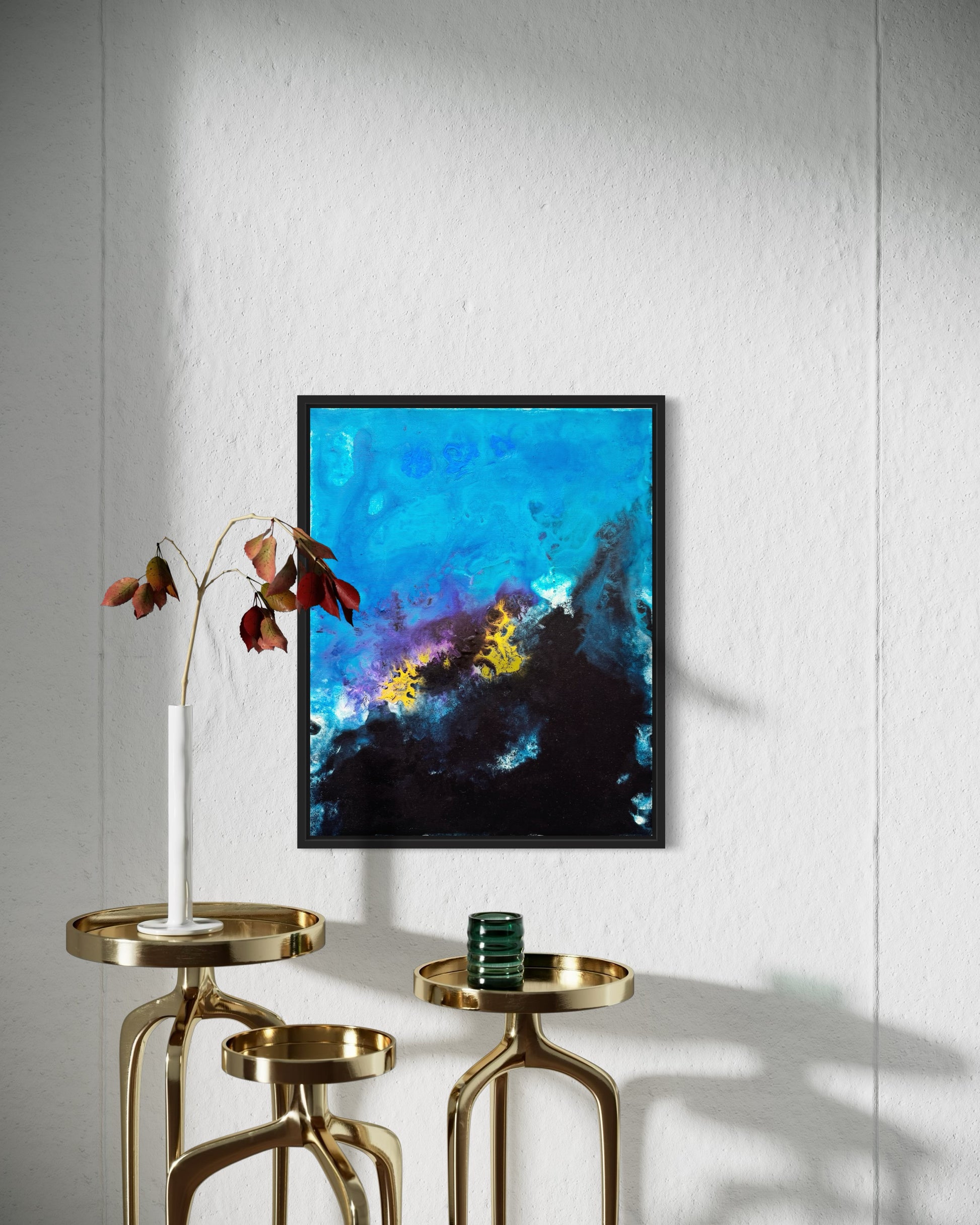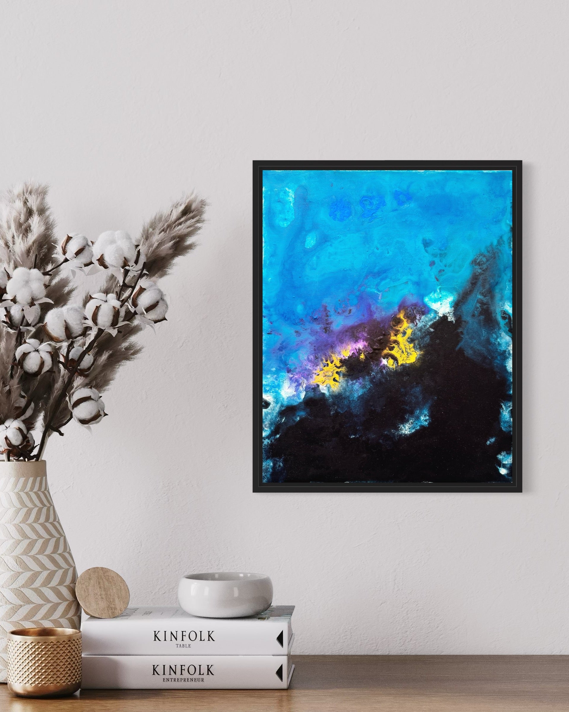 Das Bild misst 50x40 cm und wurde mit hochwertigen Acrylfarben auf Leinwand geschaffen. Es wird in einem eleganten schwarzen Rahmen geliefert, der die lebhaften Farben perfekt zur Geltung bringt und dir die Möglichkeit bietet, es sofort aufzuhängen.