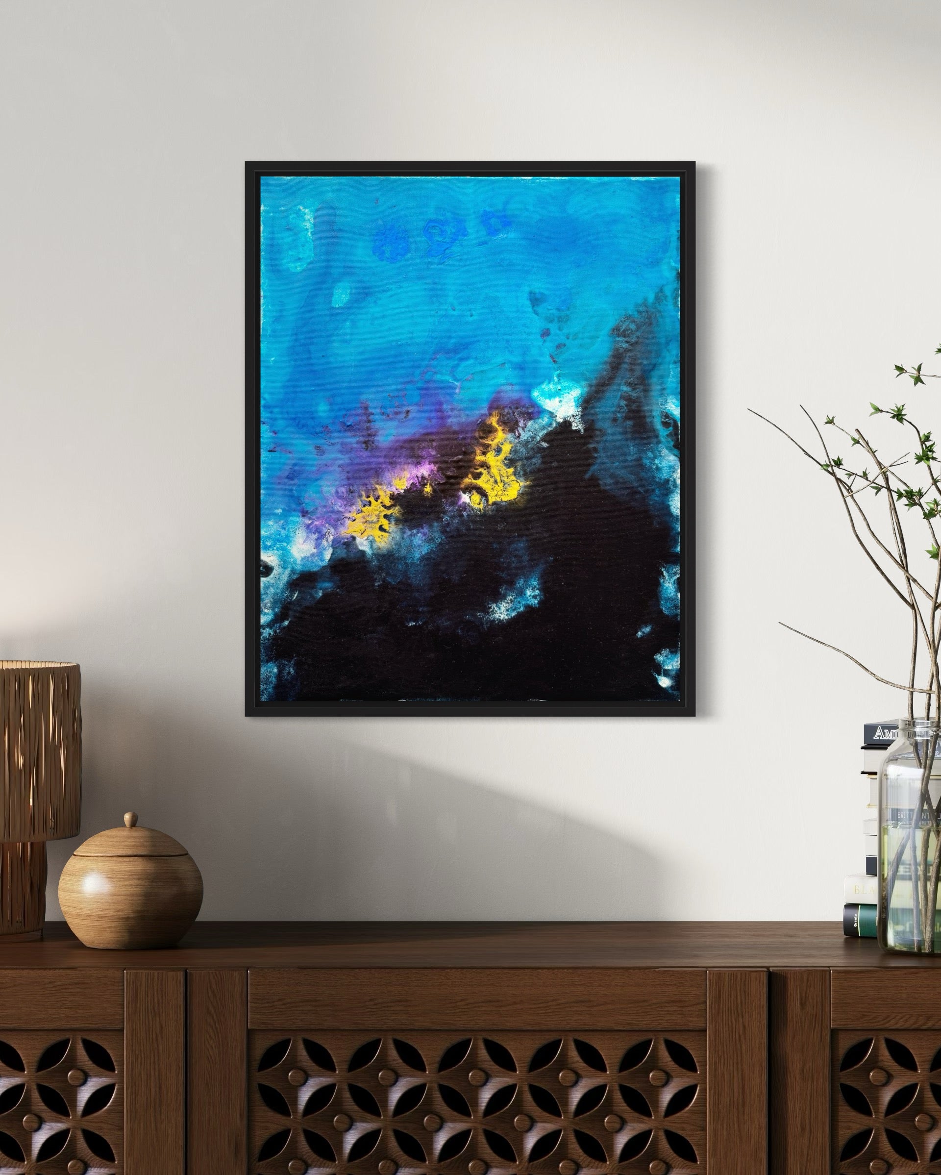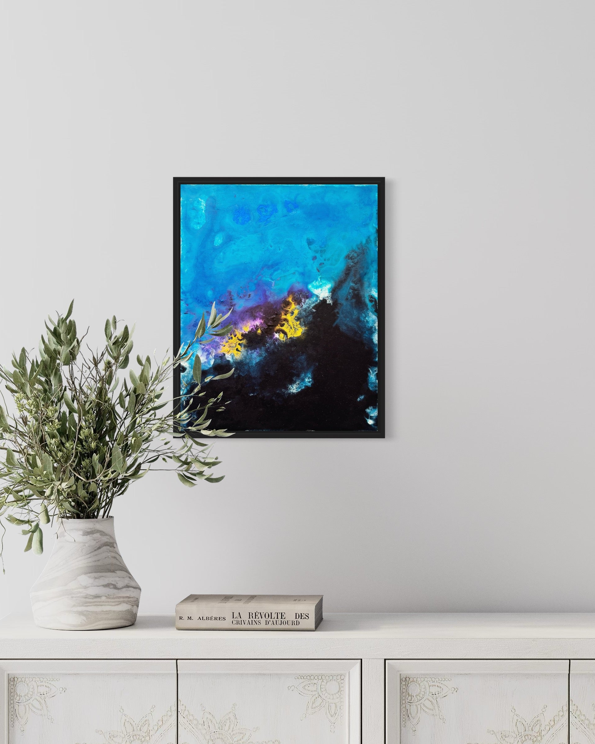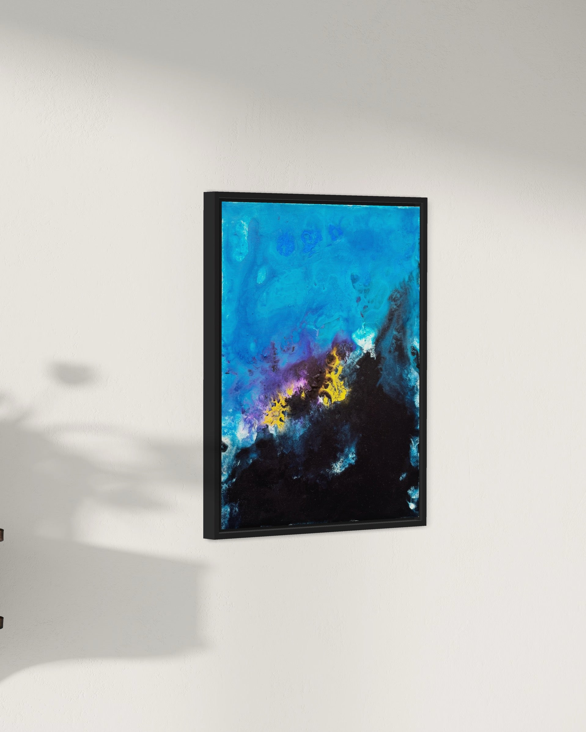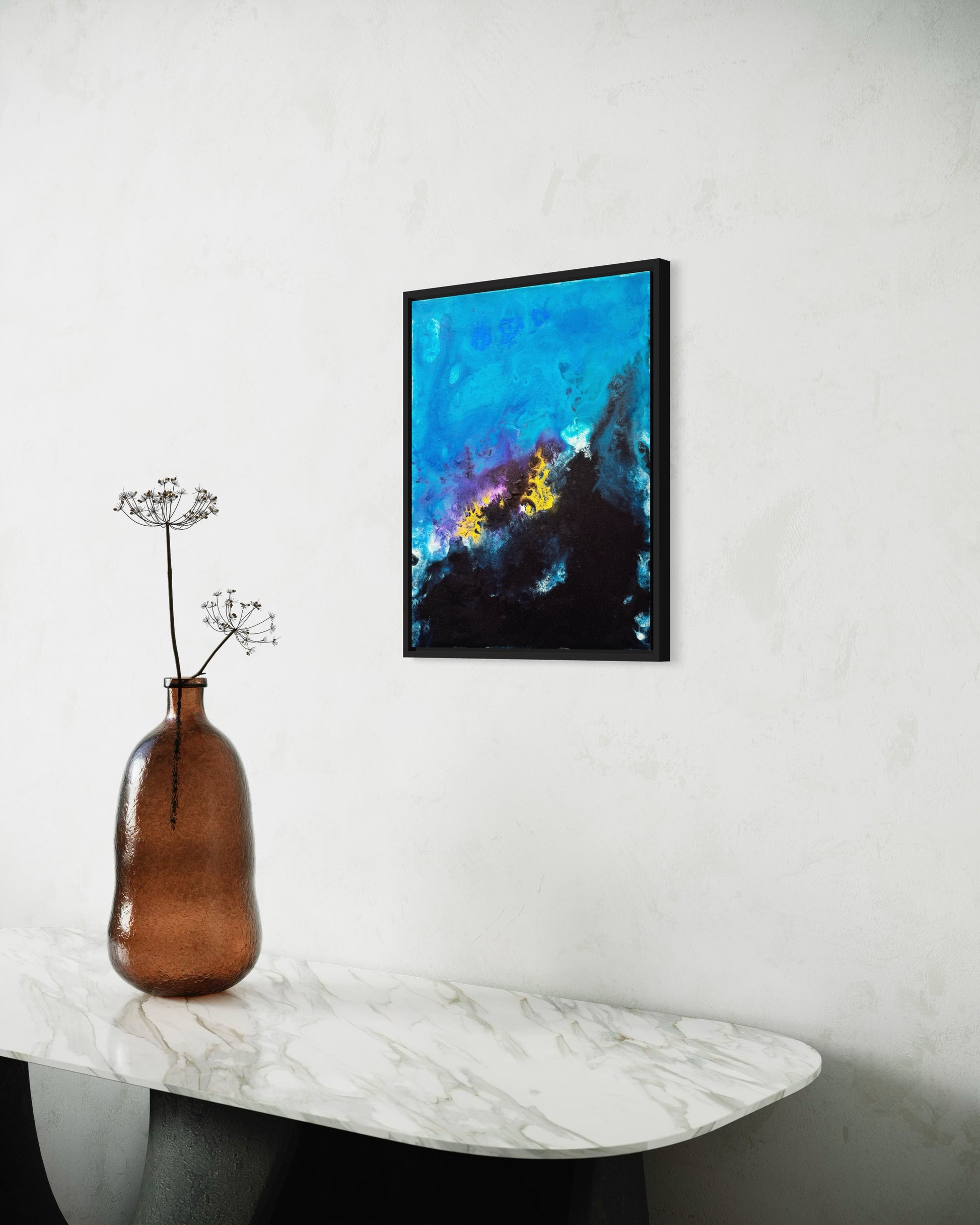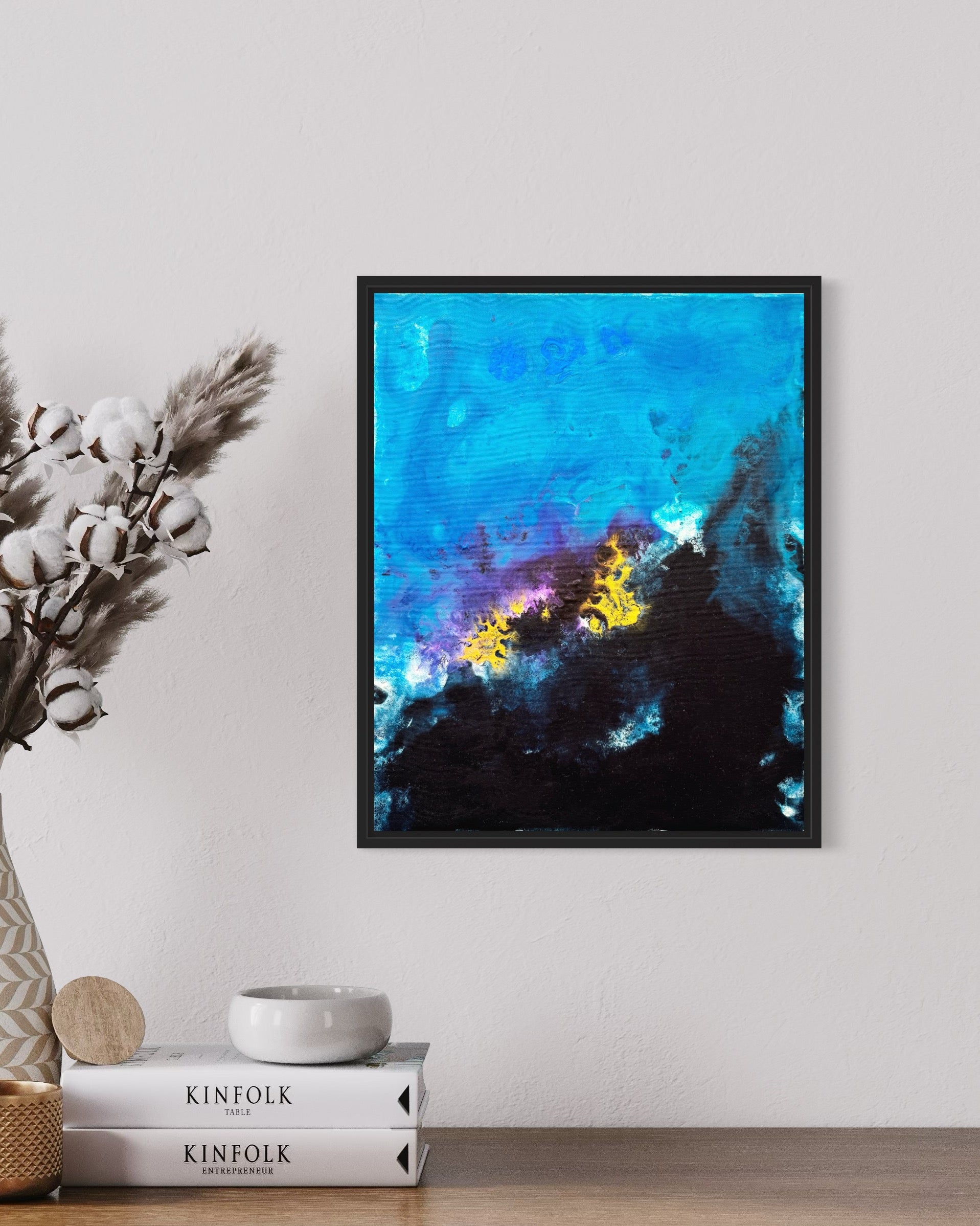 Das Bild misst 50x40 cm und wurde mit hochwertigen Acrylfarben auf Leinwand geschaffen. Es wird in einem eleganten schwarzen Rahmen geliefert, der die lebhaften Farben perfekt zur Geltung bringt und dir die Möglichkeit bietet, es sofort aufzuhängen.