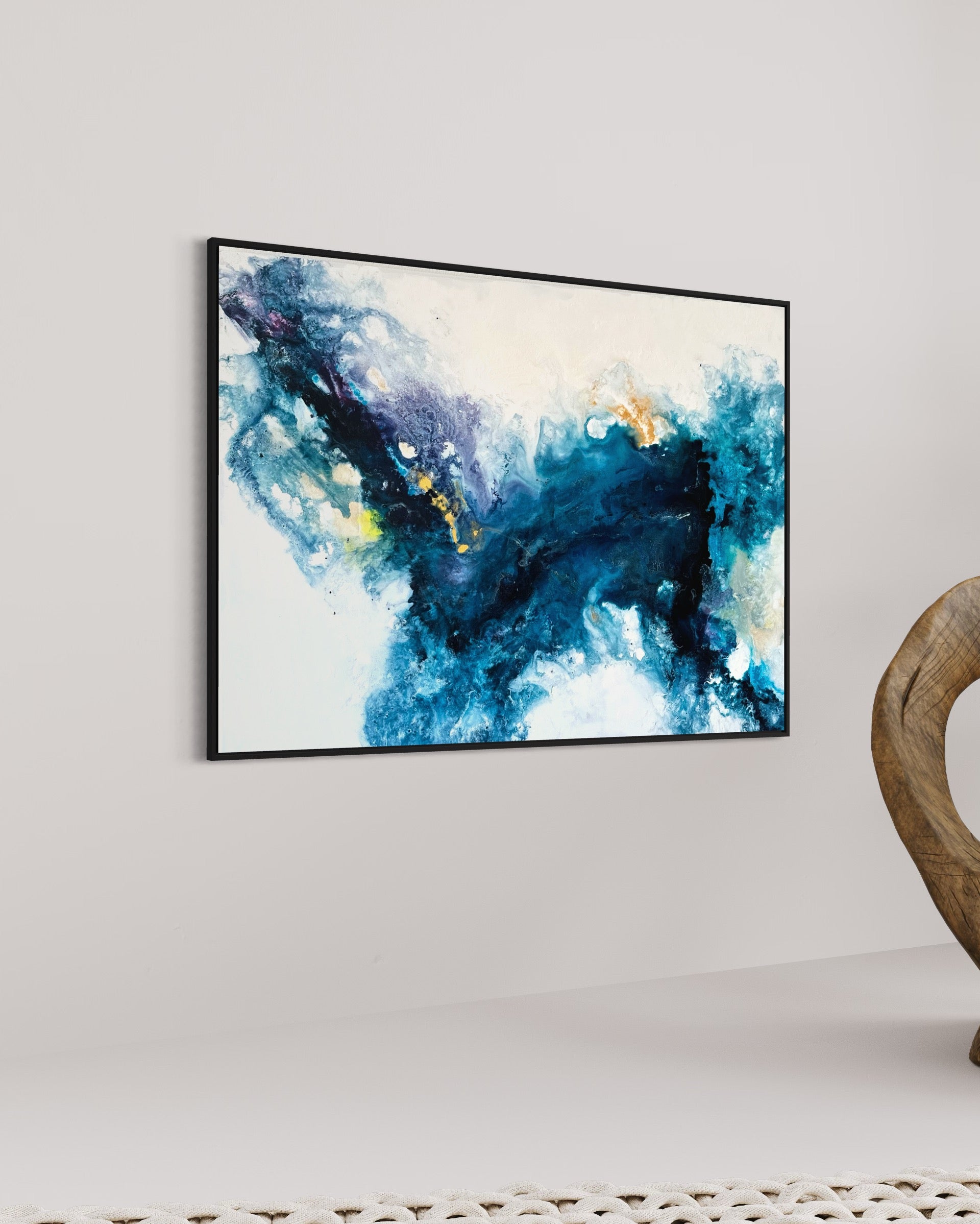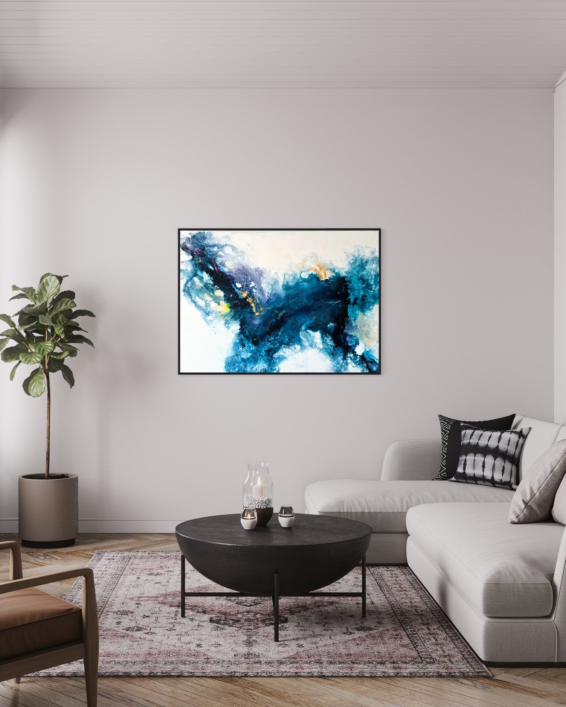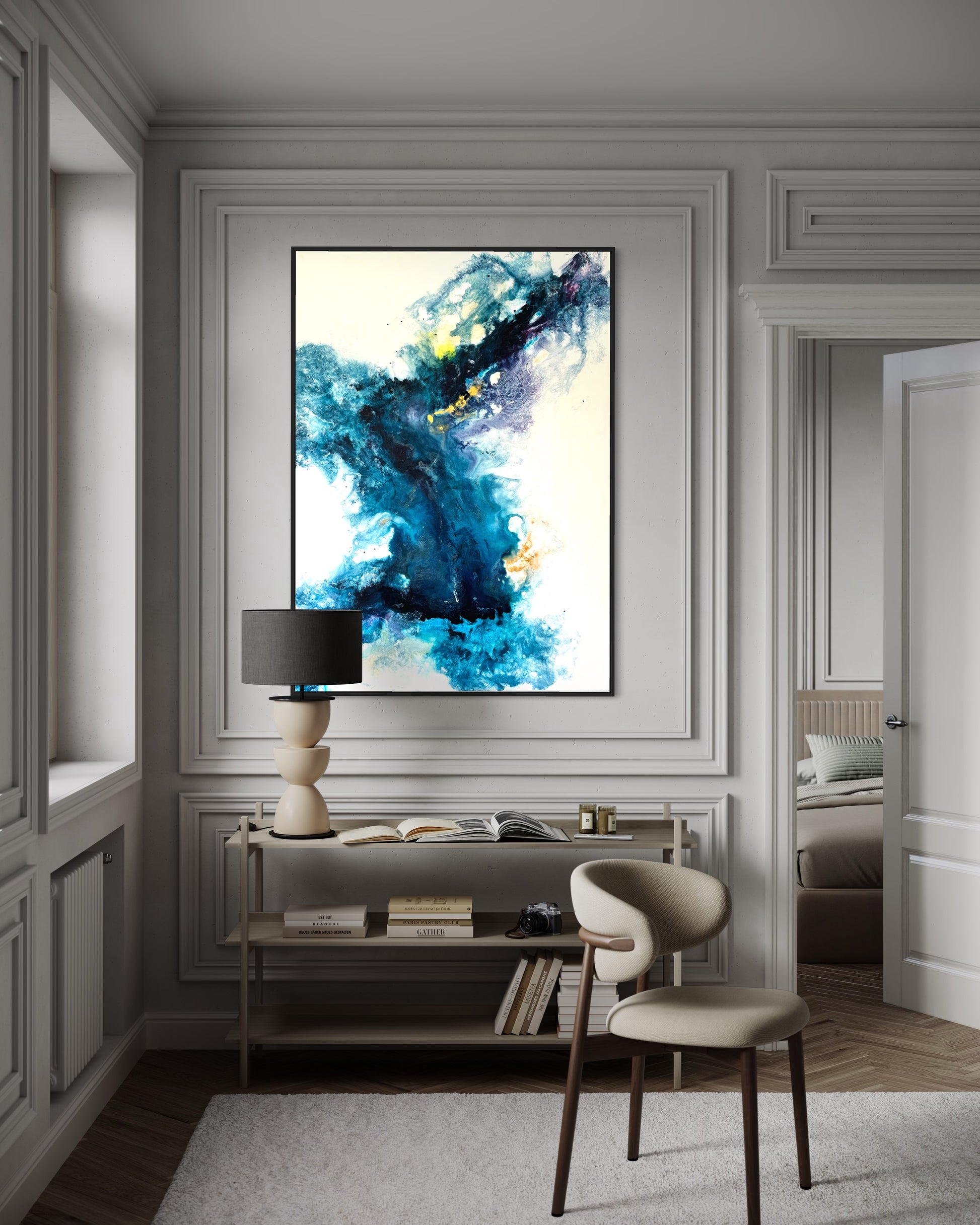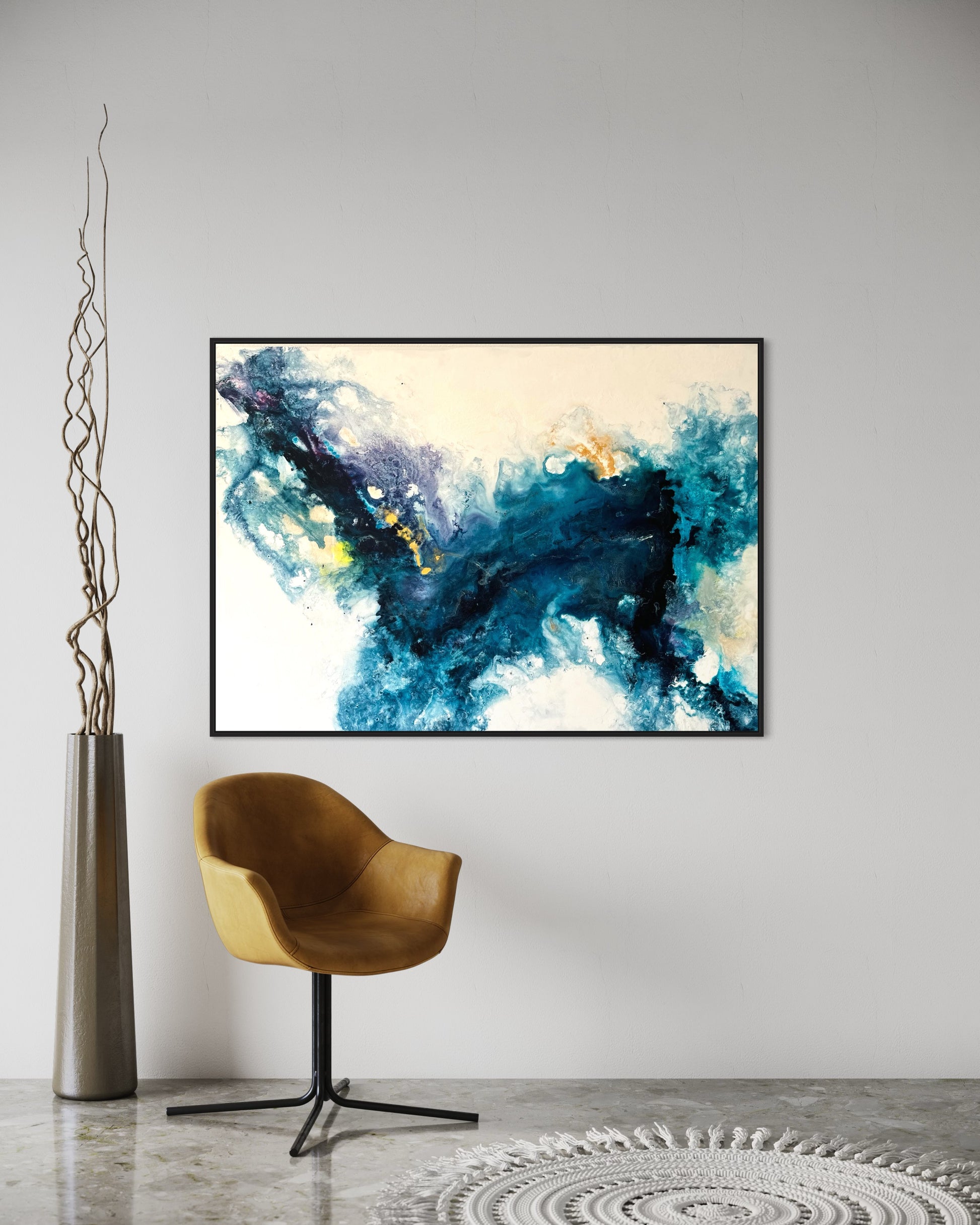 „Ocean’s Treasury“ ist ein handgemaltes Acrylgemälde, das durch klare Formen und harmonische Farben besticht. Die Kombination aus tiefen Blautönen, sanften Goldakzenten und dezenten Lilaschattierungen verleiht dem Bild eine besondere Ausstrahlung, die Ruhe und Eleganz in jeden Raum bringt. Mit einer Größe von 100 x 140 Zentimetern eignet sich das Werk ideal für große Wände und fügt sich perfekt in moderne Innendesigns ein.