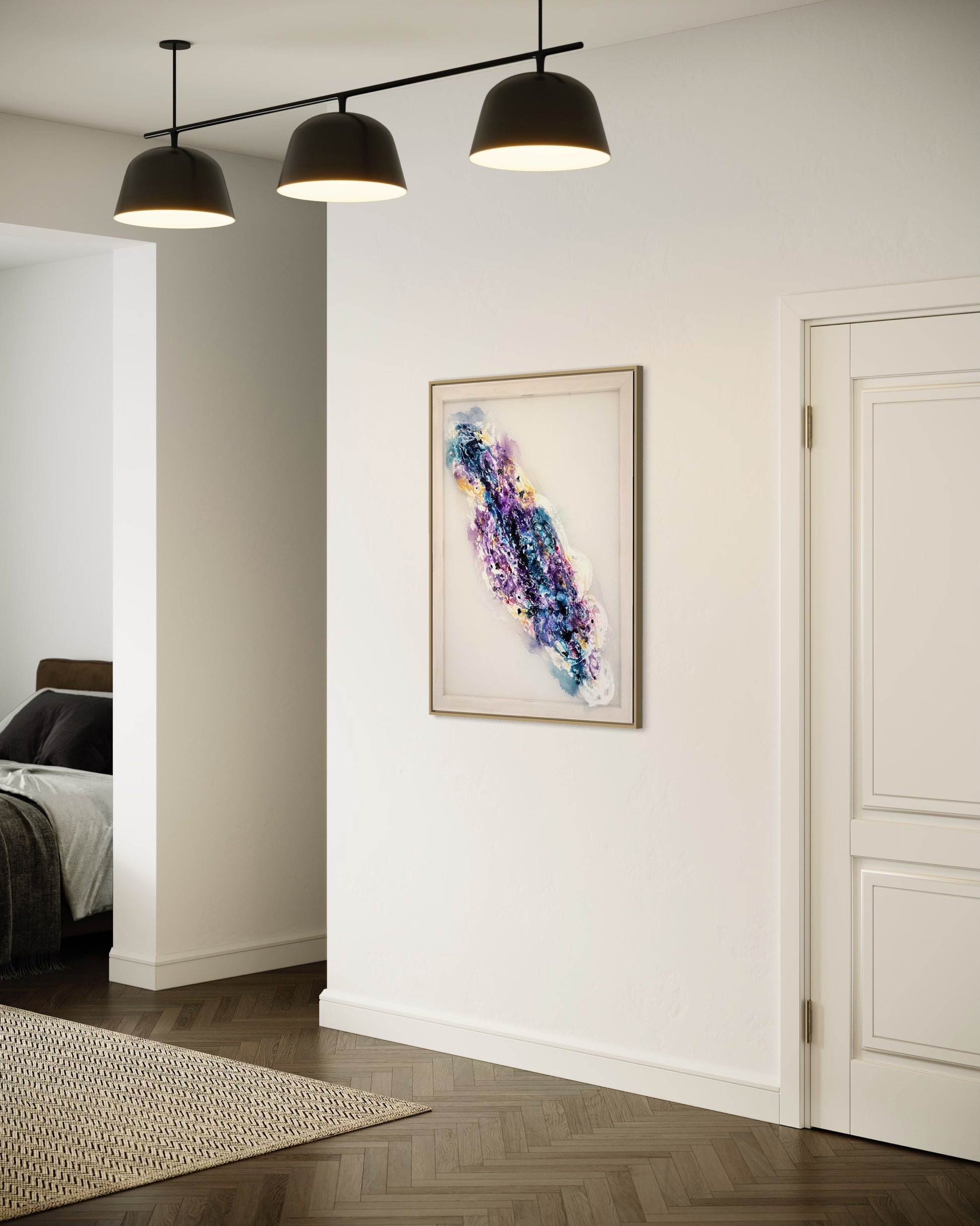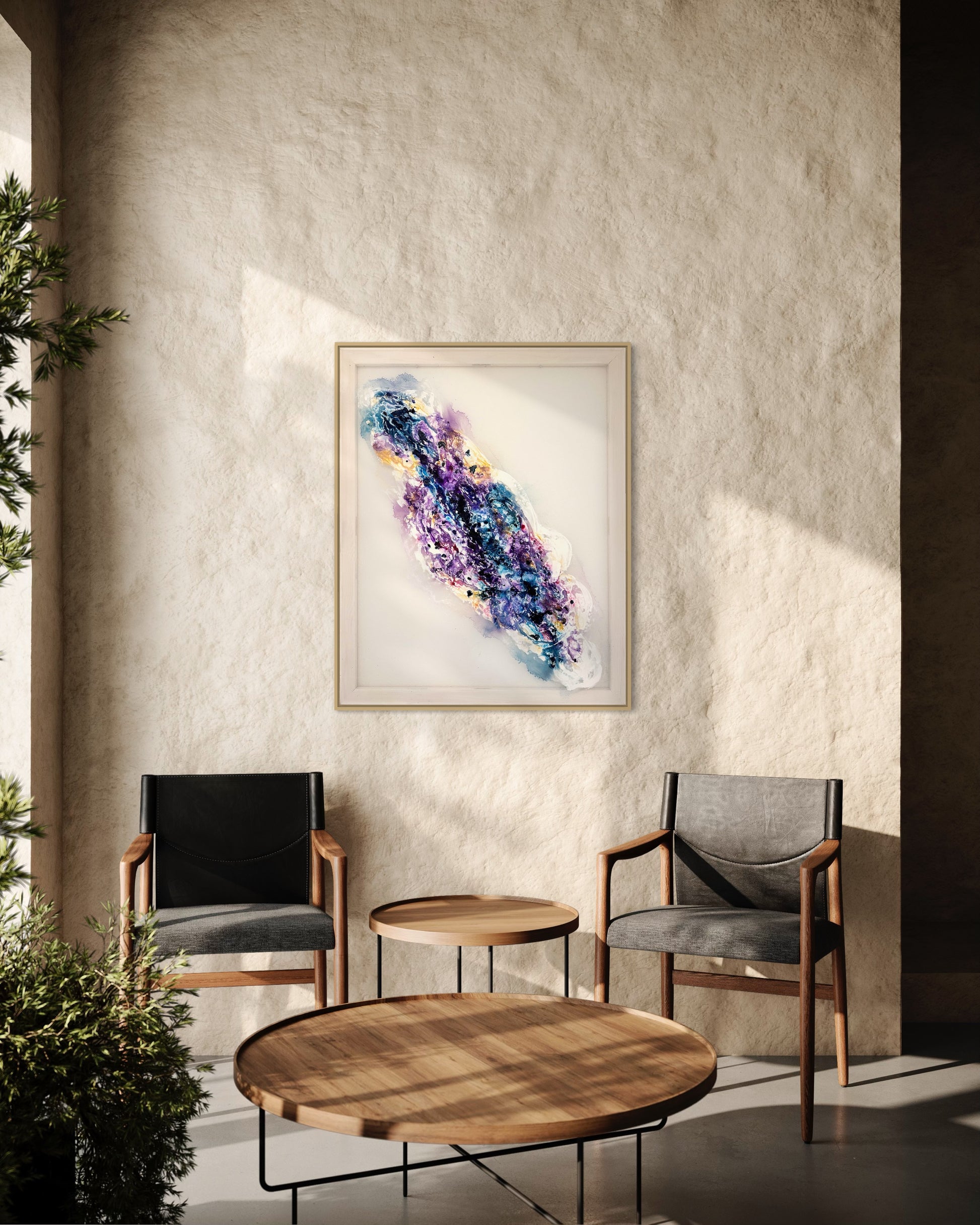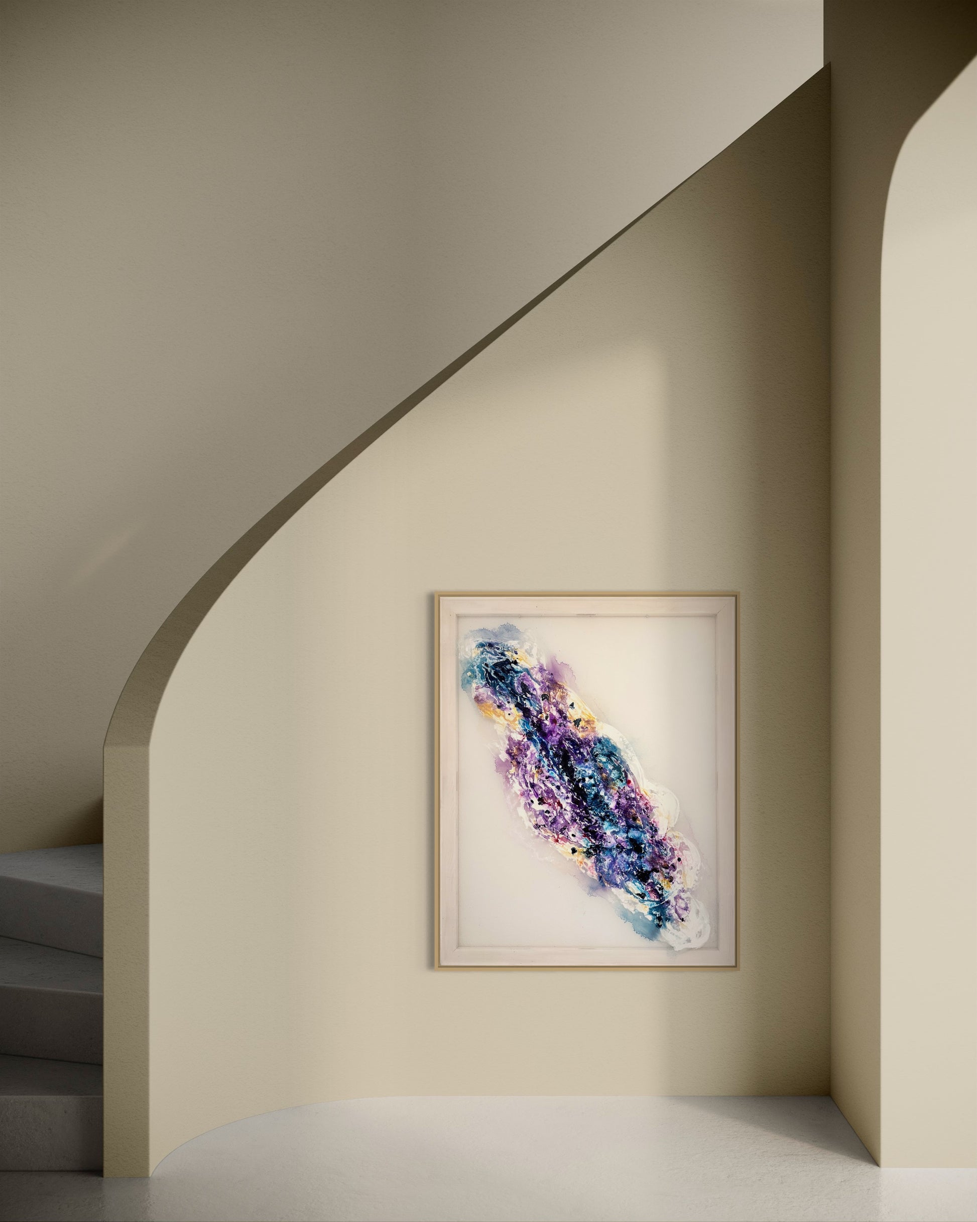 Dein Gemälde wird in einem eleganten Rahmen geliefert, der die Schönheit des Kunstwerks unterstreicht und sich nahtlos in deine moderne oder klassische Einrichtung integriert. Egal ob als Blickfang im Wohnzimmer, im Büro oder in einem Galeriebereich, "Ethereal Cosmos" wird sicherlich bewundernde Blicke auf sich ziehen und eine inspirierende Atmosphäre schaffen.
