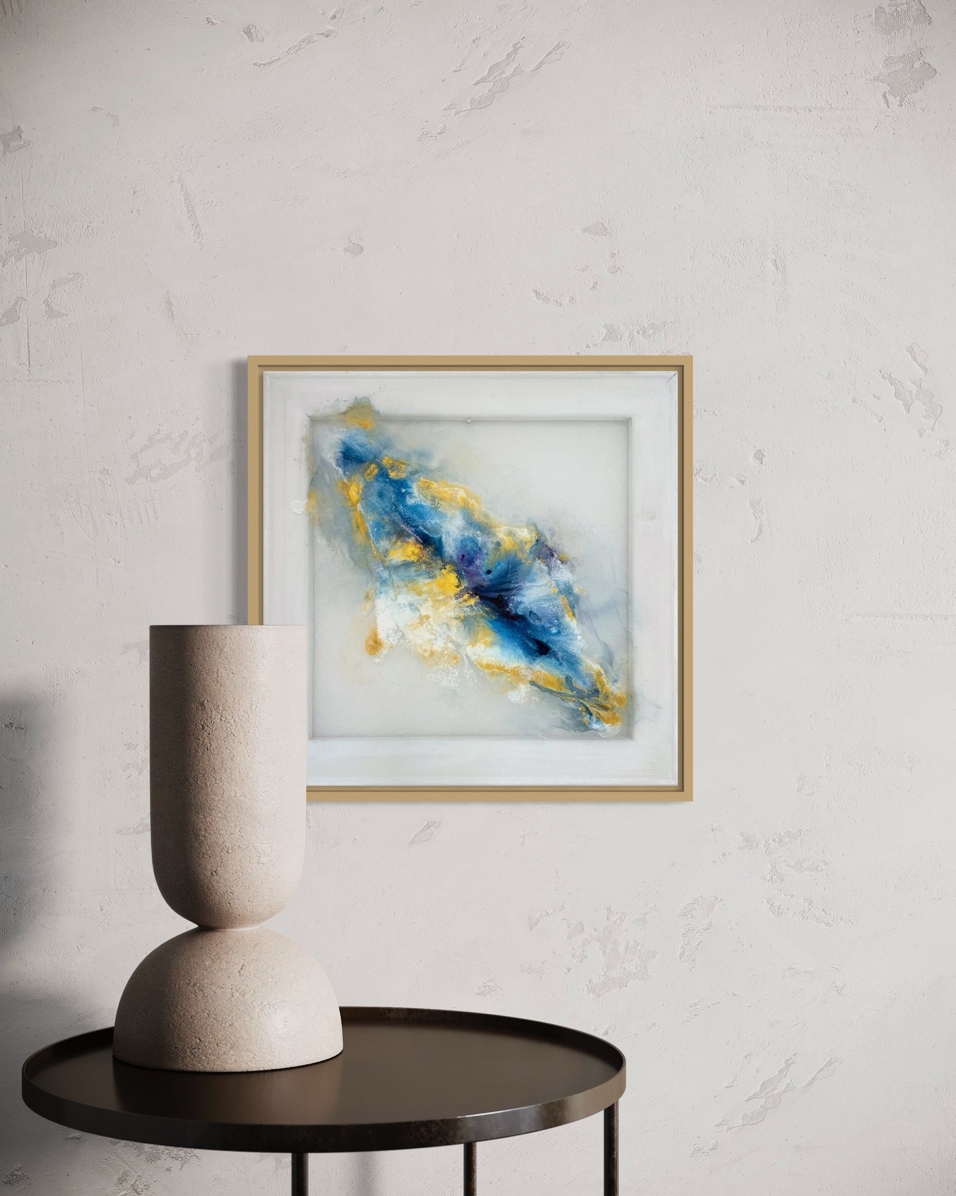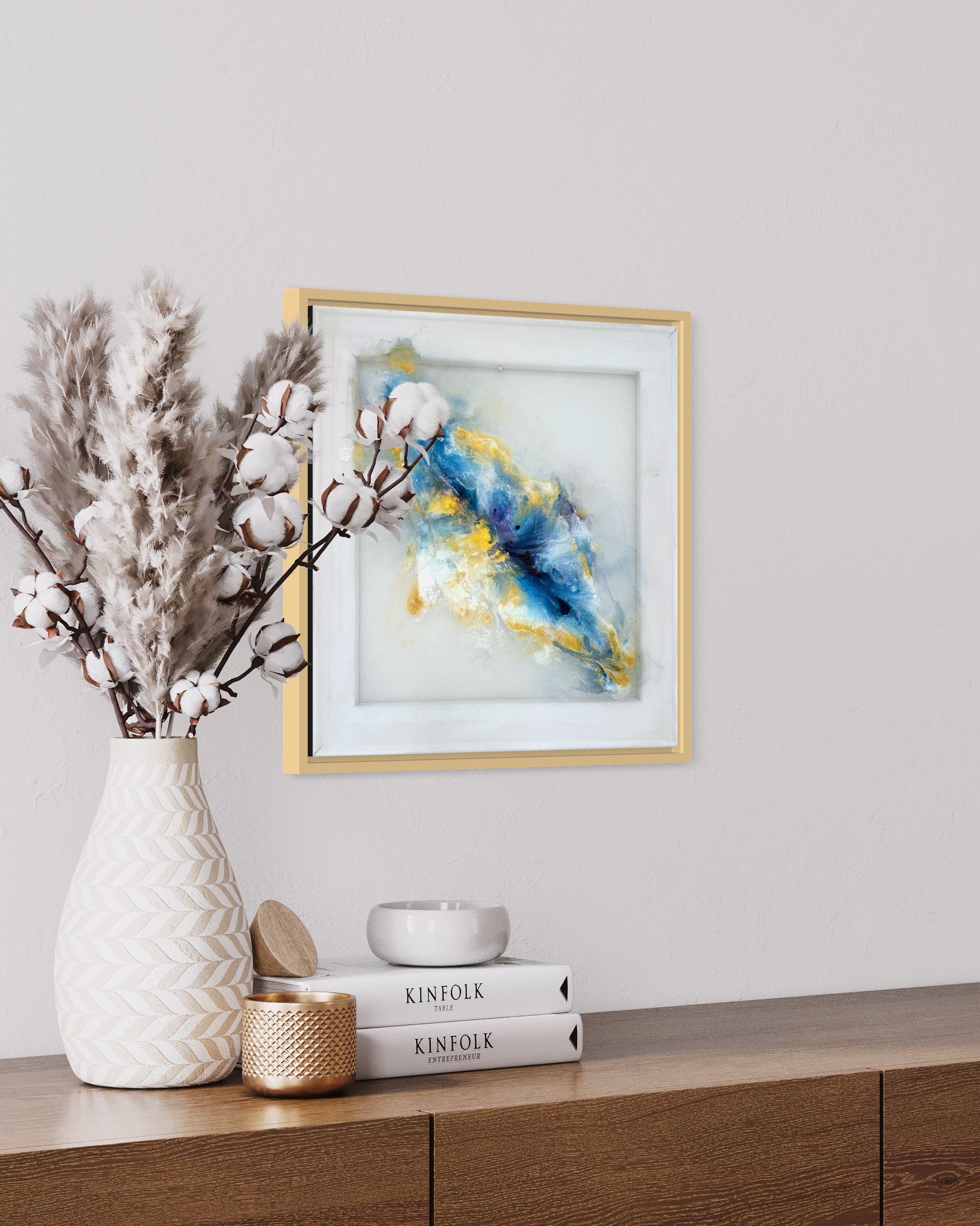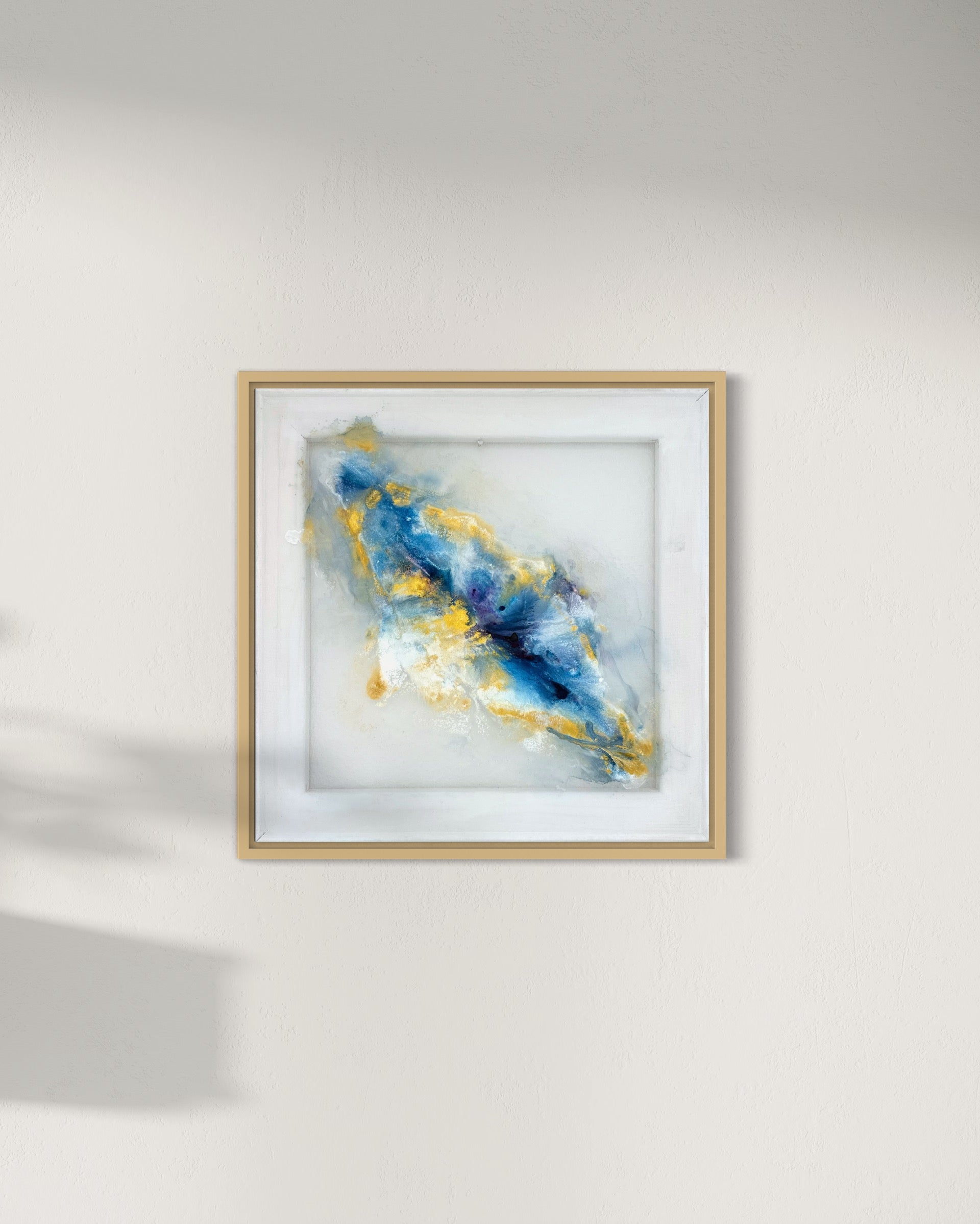 Erwecke mit meinem faszinierenden Kunstwerk "Himmelsfluss" deine Sinne zum Leben. Dieses atemberaubende Gemälde, präsentiert auf einer transparenten Leinwand und eingefasst in einen eleganten Rahmen, fängt die subtile Schönheit eines Flusses aus Blau, Gold, Lila und Weiß ein, der sanft von einer Ecke in die andere fließt. Jedes Detail dieses 40x40 cm großen Meisterwerks wurde mit Liebe und Sorgfalt geschaffen, um eine harmonische Atmosphäre zu schaffen. Ob in einem Wohnzimmer, Büro oder Empfangsbereich, dieses Kunstwerk verleiht jedem Raum eine ätherische Note. Tauche ein in die ruhige Eleganz von "Himmelsfluss" und lasse dich von seiner zeitlosen Schönheit verzaubern.