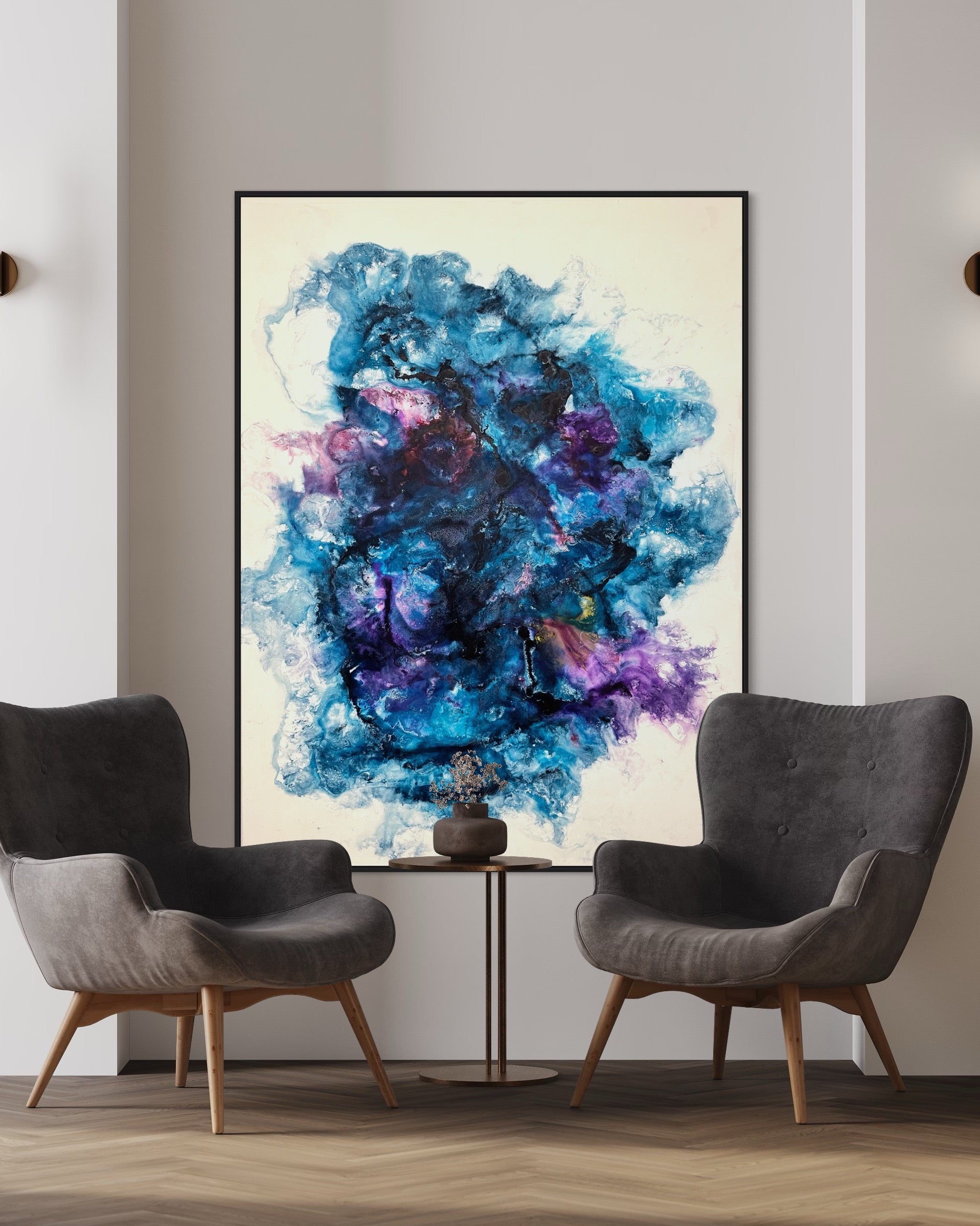 "Aura" besticht durch eine dynamische und zugleich harmonische Komposition, die eine tiefgreifende emotionale Resonanz erzeugt. Die satten, lebendigen Farben in Blau- und Violetttönen verschmelzen zu einem faszinierenden Spektrum, das die Blicke auf sich zieht und die Fantasie beflügelt. Die abstrakten Formen und fließenden Übergänge schaffen eine visuelle Tiefe, die dich in eine Welt voller Geheimnisse und Möglichkeiten entführt.