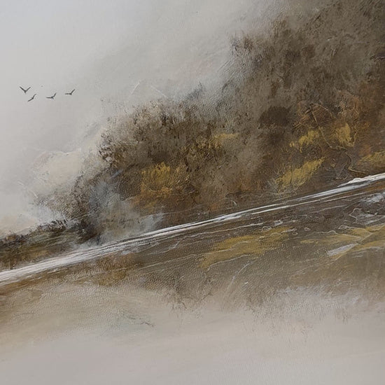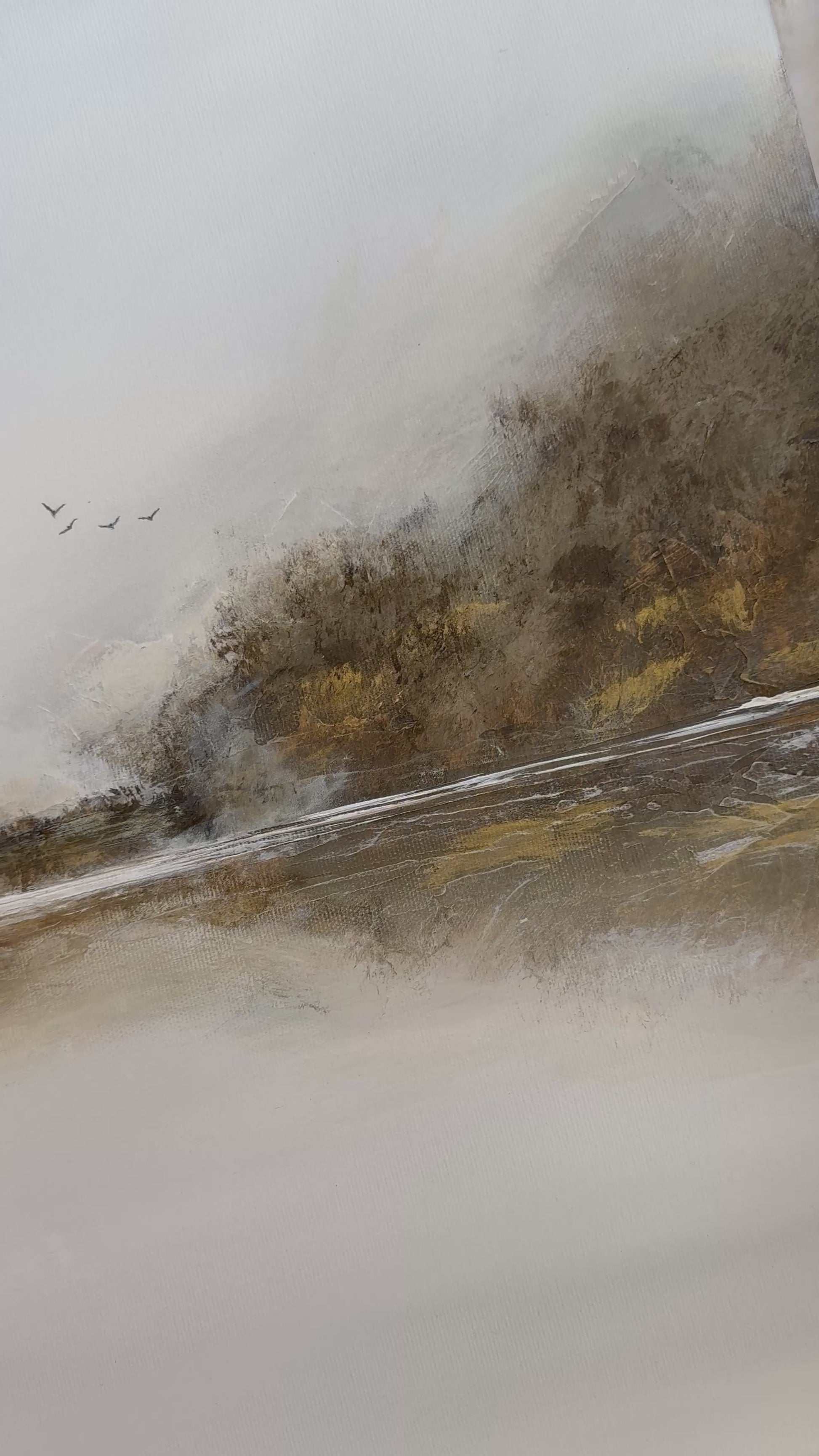 Ich arbeite mit Acryl auf Leinwand; die Fläche misst 100 x 80 cm. Das Werk wird gerahmt geliefert und ist bereit zum Aufhängen.