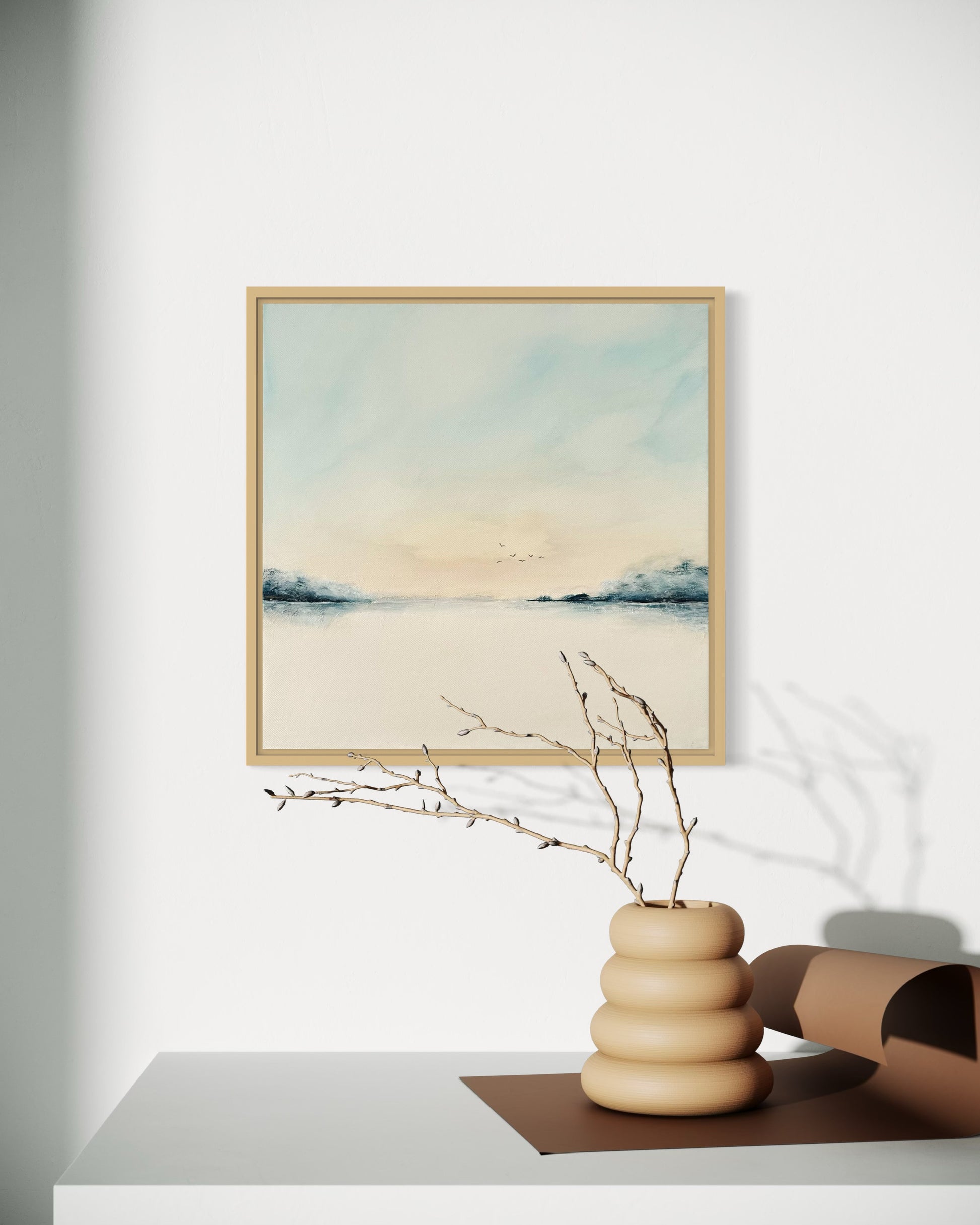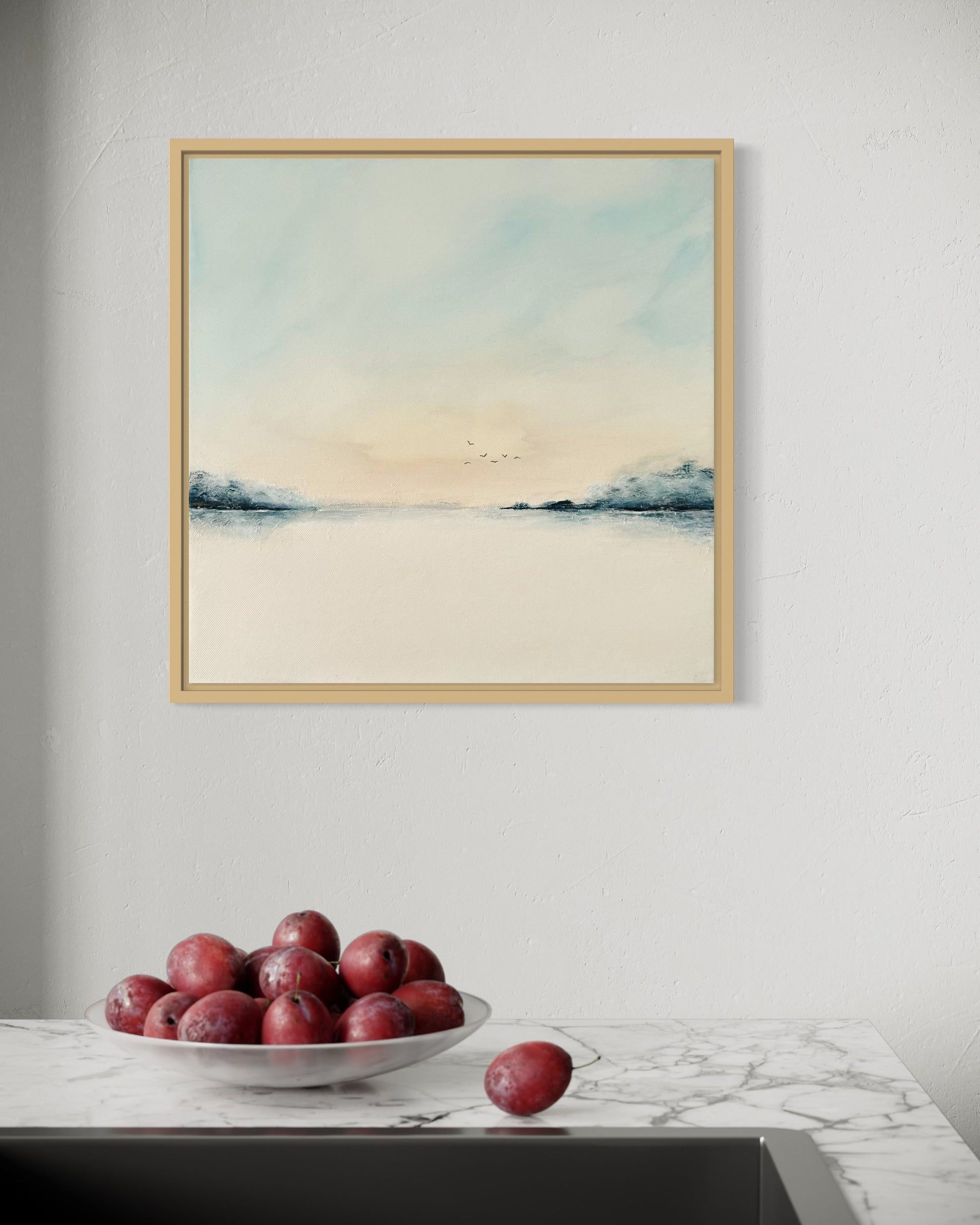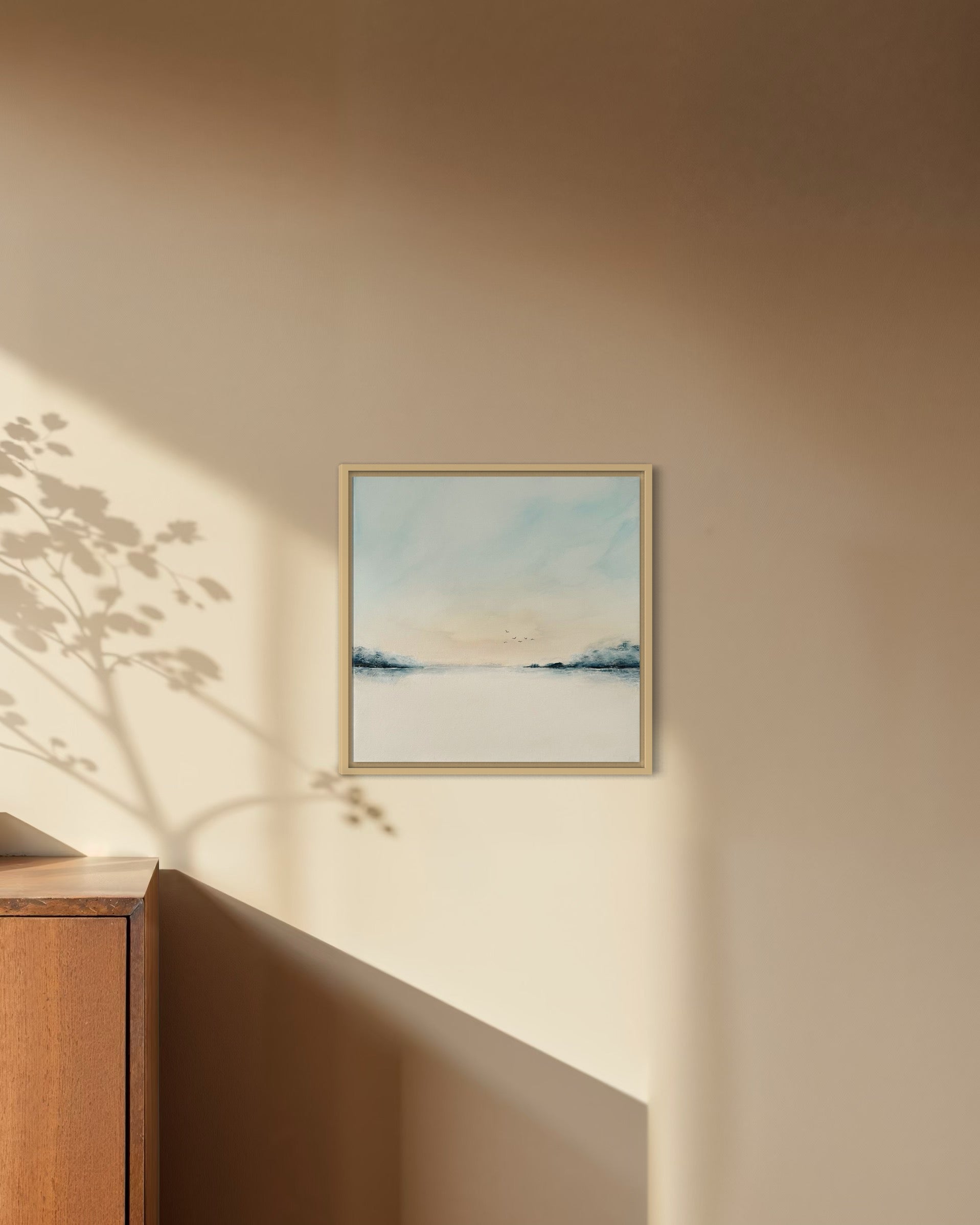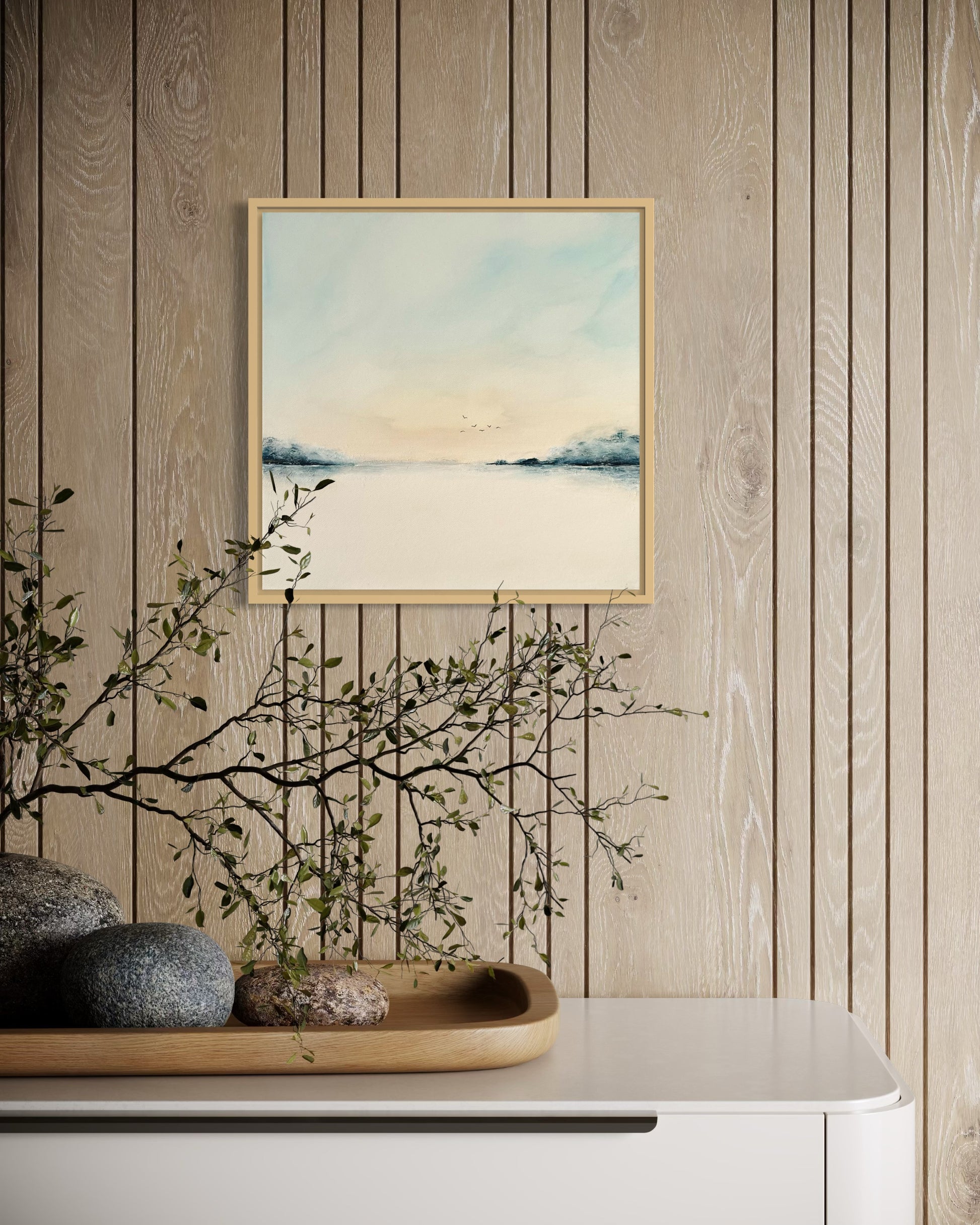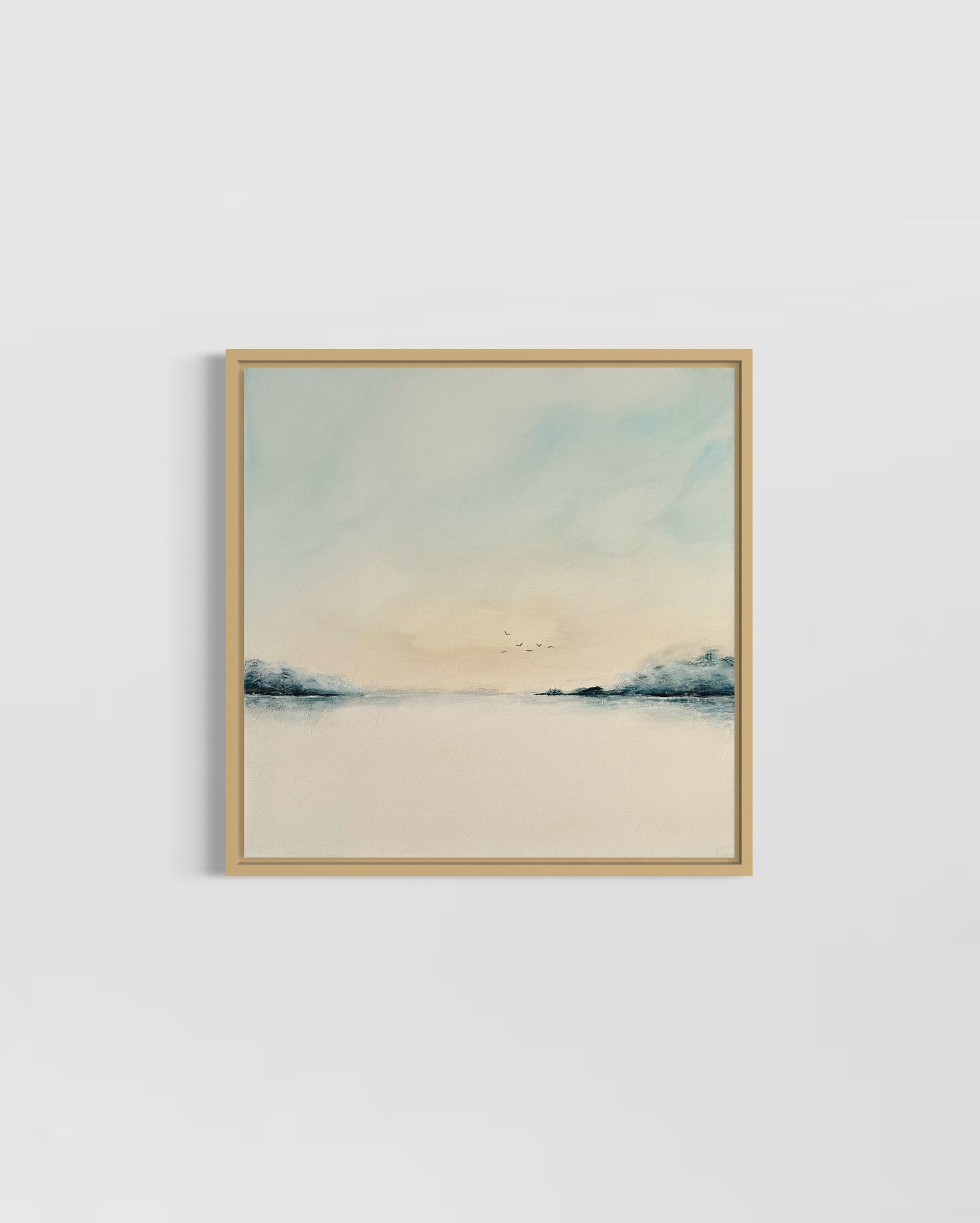 Die ruhige Farbgestaltung, die klare Komposition und der offene Horizont verleihen dem Bild eine besondere Leichtigkeit. Es strahlt Harmonie und Stille aus – ideal für Wohnräume, aber auch für Praxisräume, Büros, Empfangsbereiche oder Hotels.