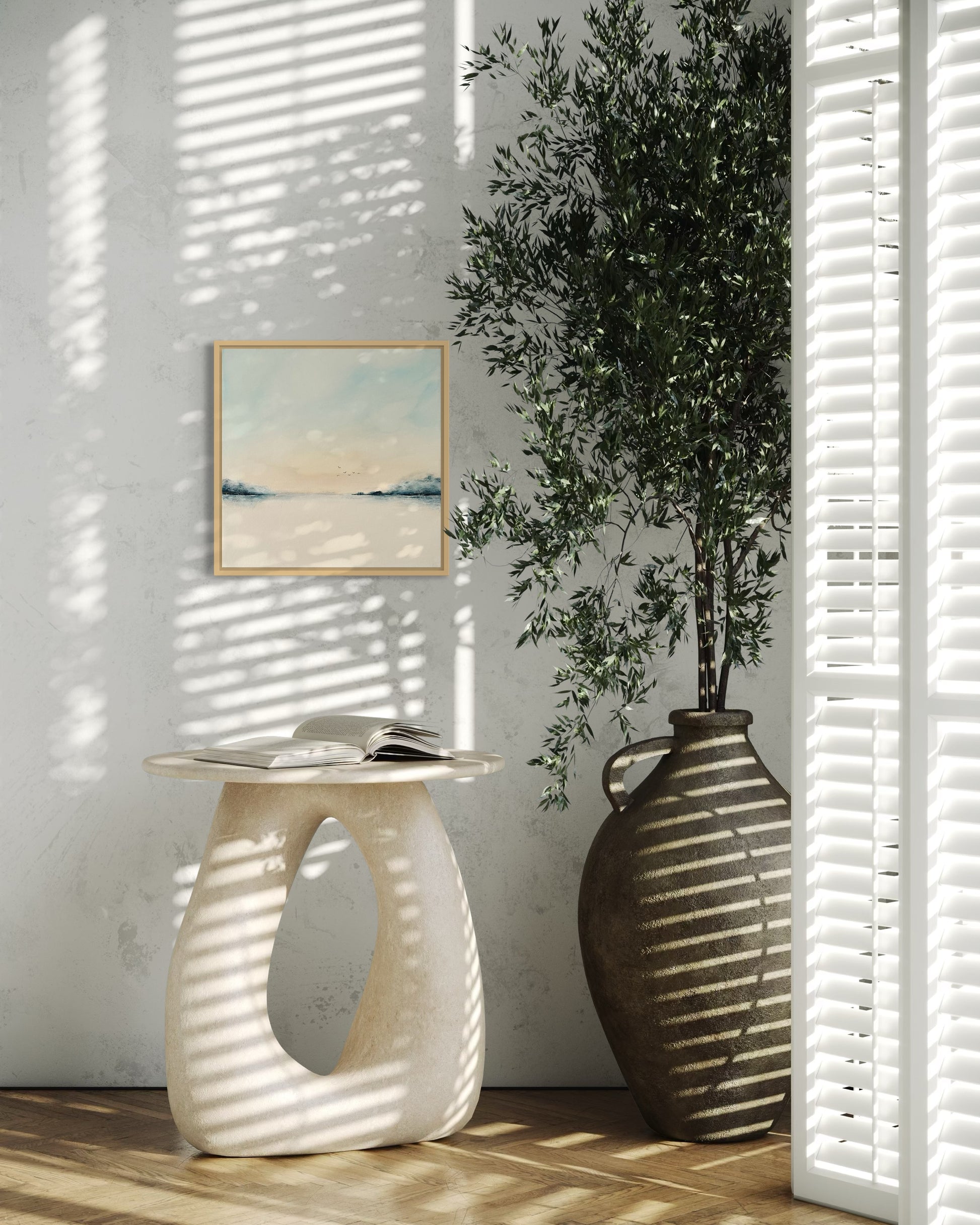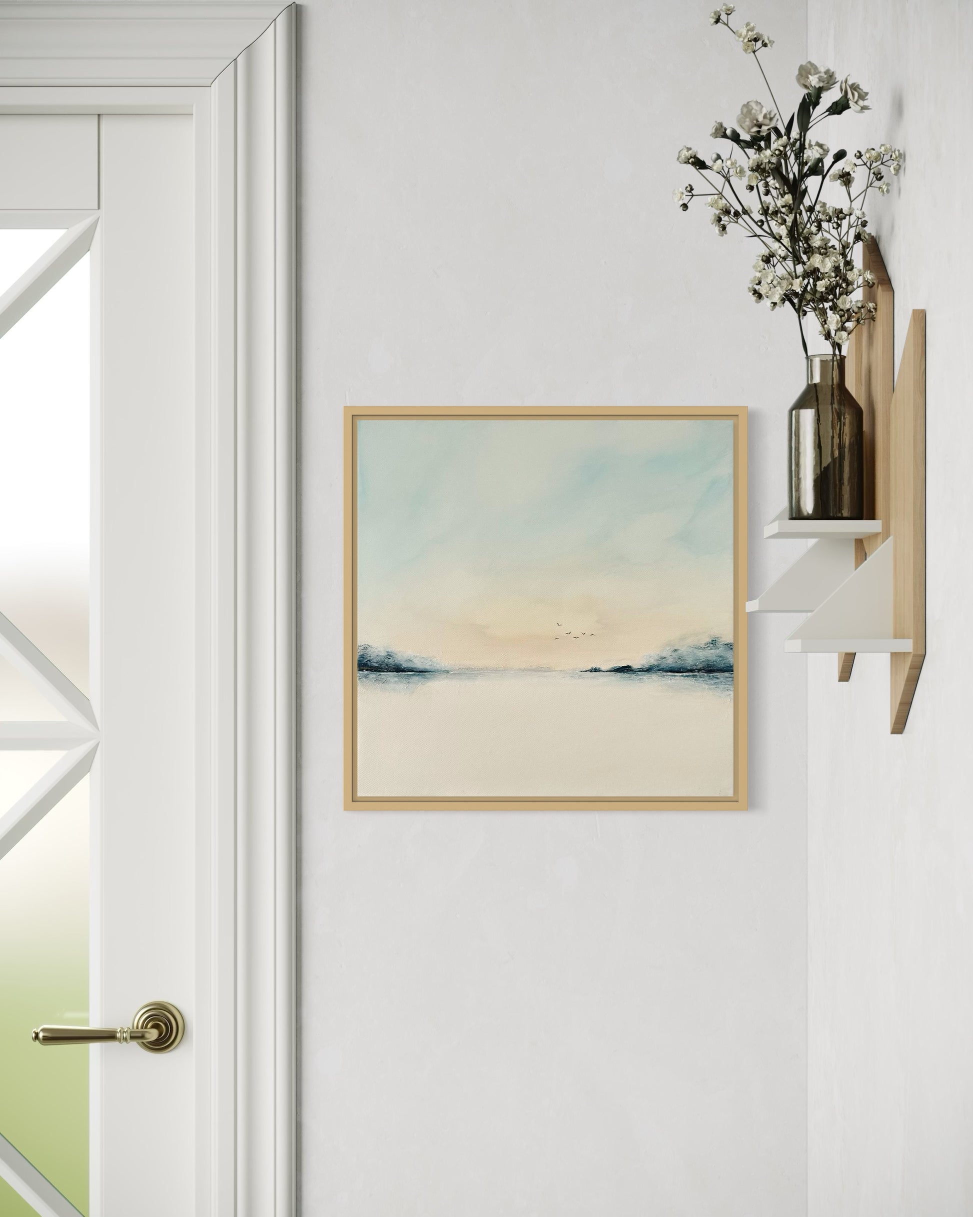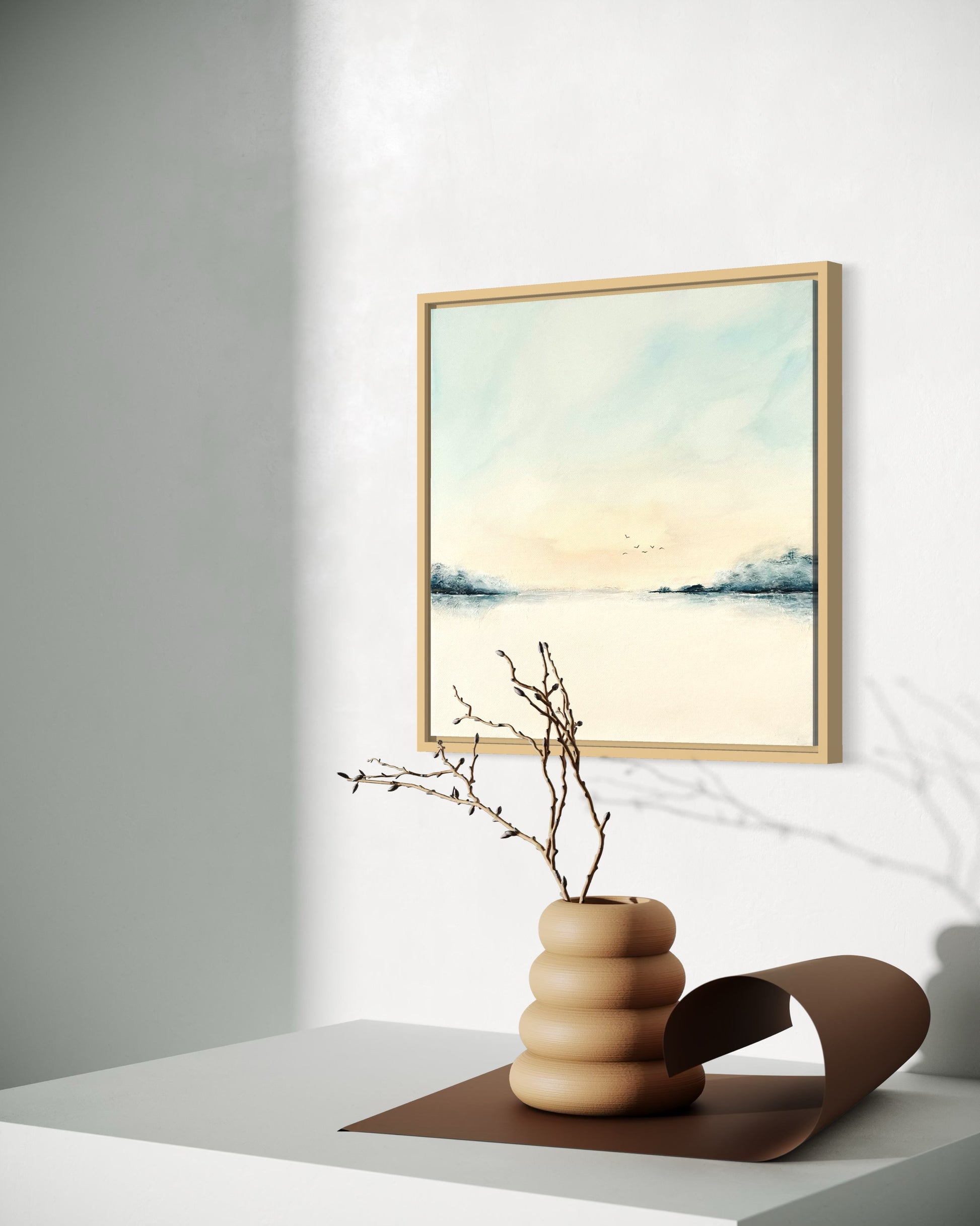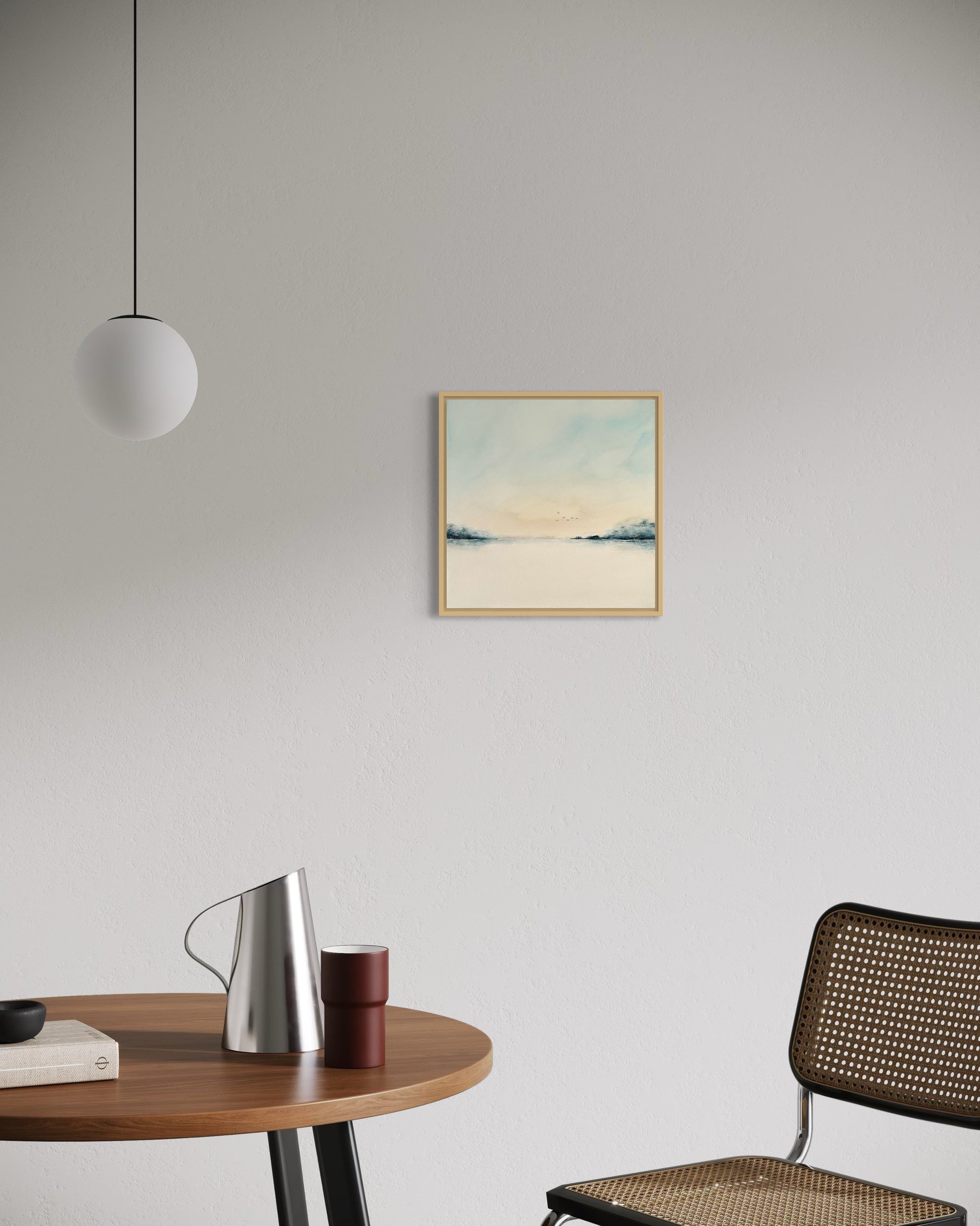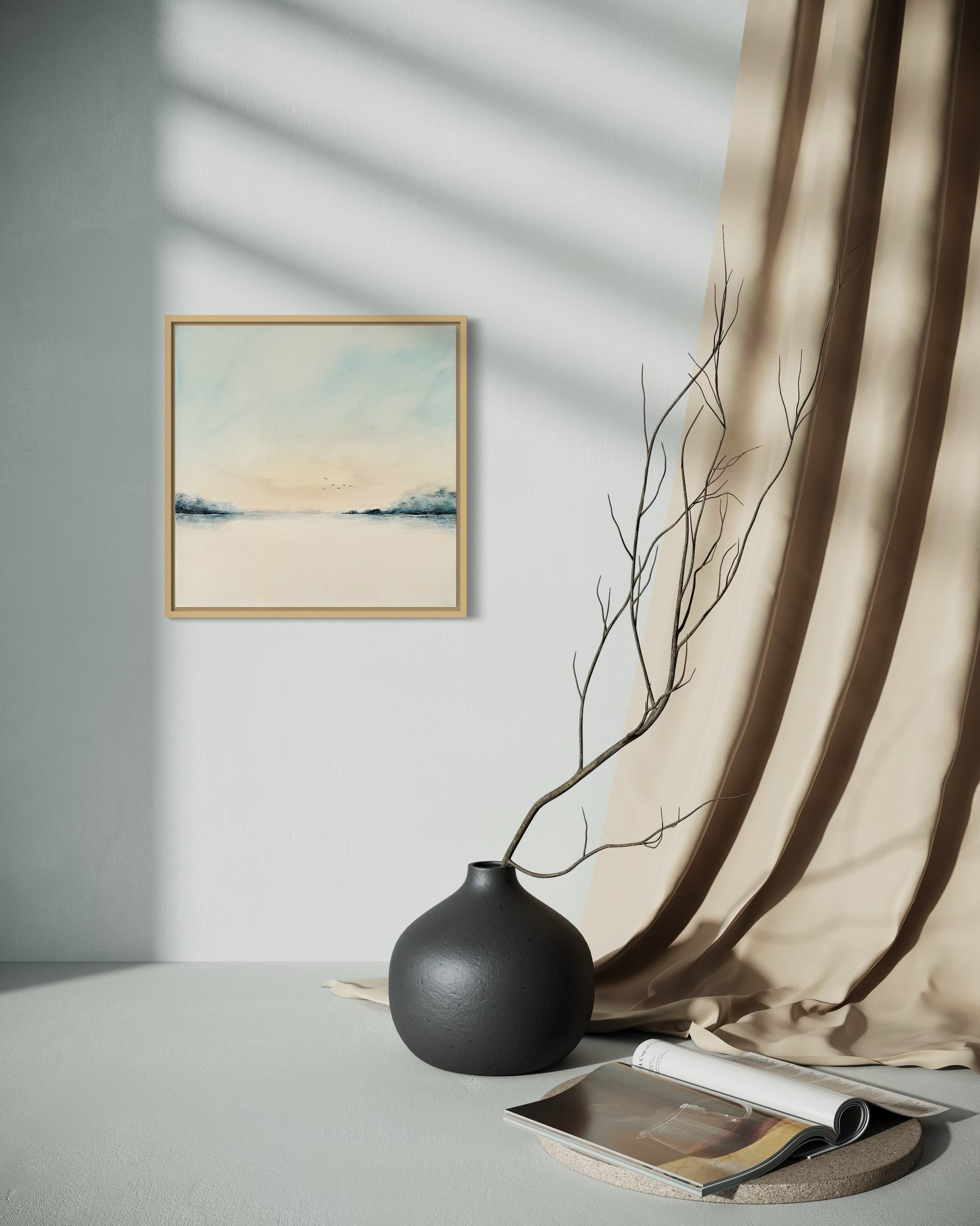 Die ruhige Farbgestaltung, die klare Komposition und der offene Horizont verleihen dem Bild eine besondere Leichtigkeit. Es strahlt Harmonie und Stille aus – ideal für Wohnräume, aber auch für Praxisräume, Büros, Empfangsbereiche oder Hotels.