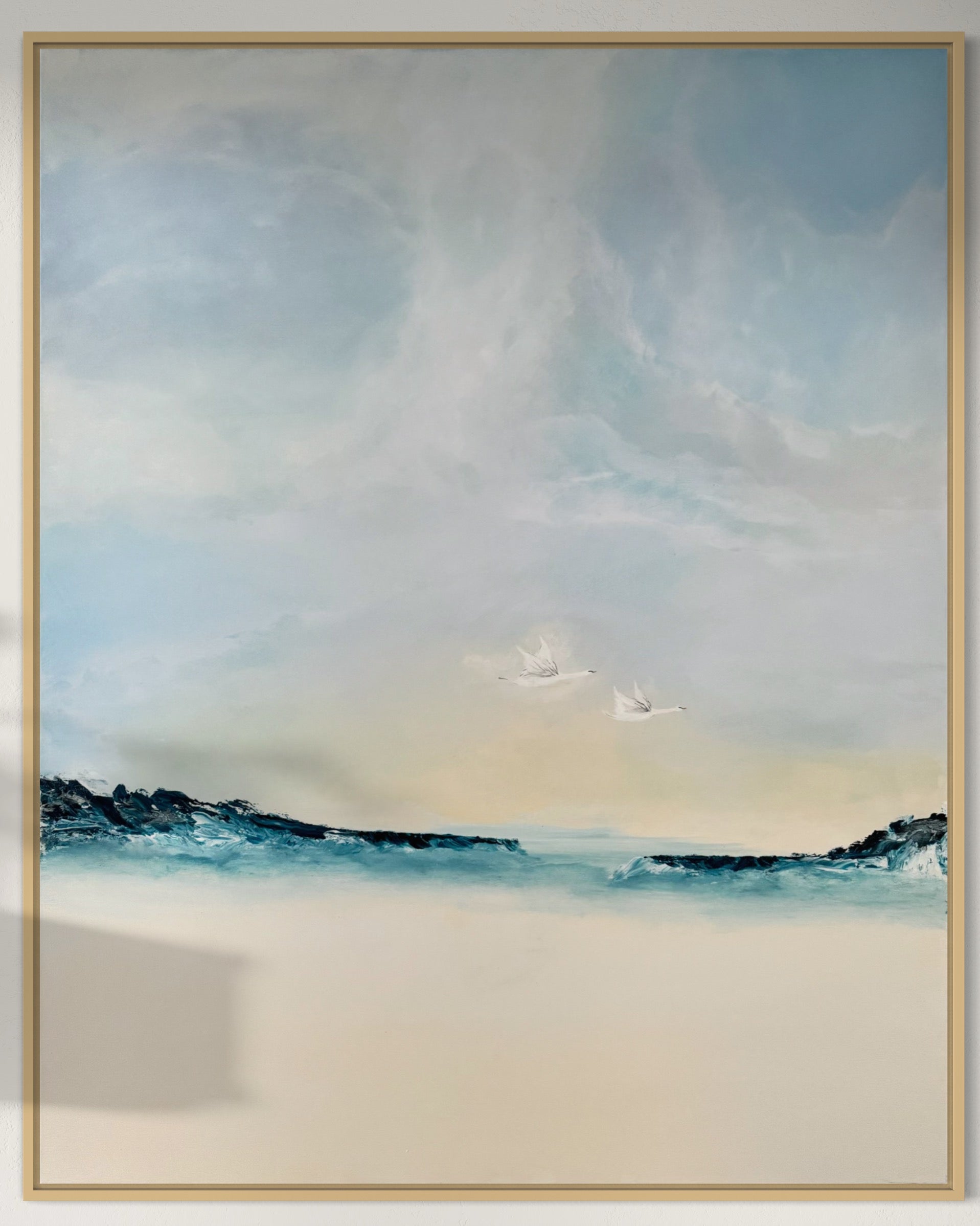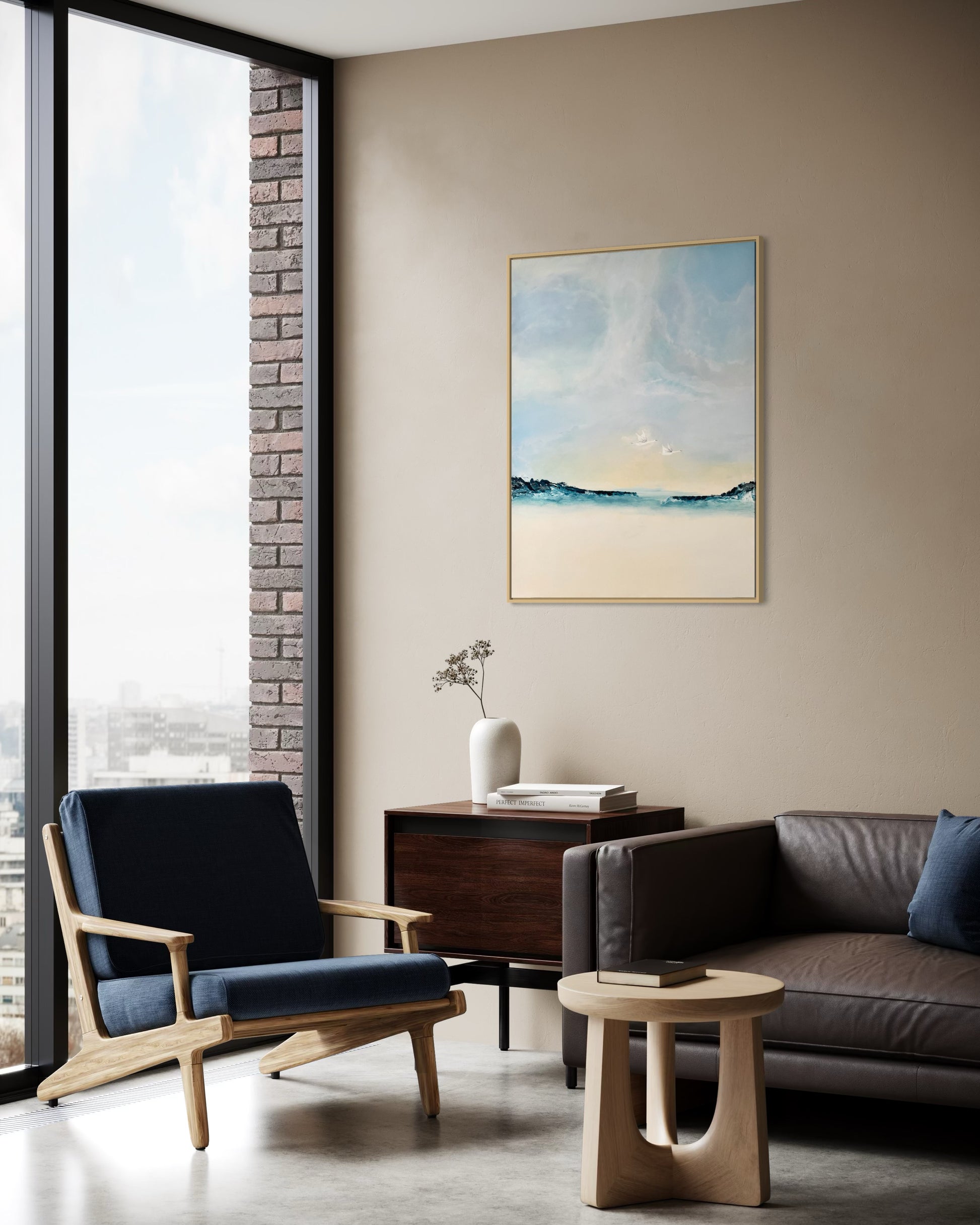 Mit einer Größe von 100 x 80 cm wird das Kunstwerk zum Blickfang, der in verschiedenen Räumen eine entspannte Atmosphäre schafft – sei es im Wohnzimmer, Schlafzimmer oder im Eingangsbereich. Die sanften Blau-, Creme- und Grautöne fügen sich mühelos in unterschiedliche Einrichtungsstile ein. Das Gemälde wird gerahmt geliefert und kann sofort aufgehängt werden.